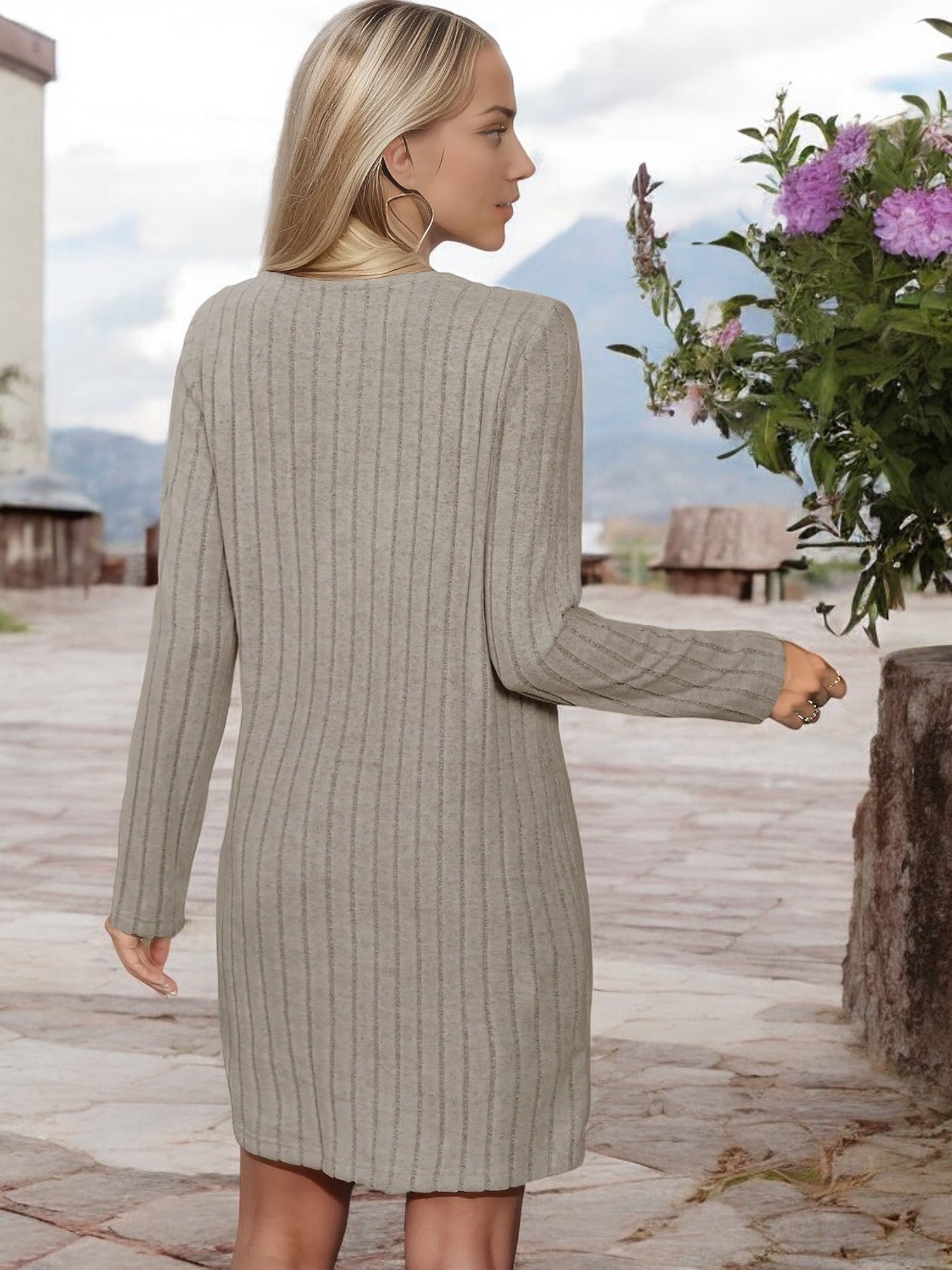 Anna-Kaci Women's Ribbed Knit Sweater Dress with Asymmetrical Button Detail and V-Neck