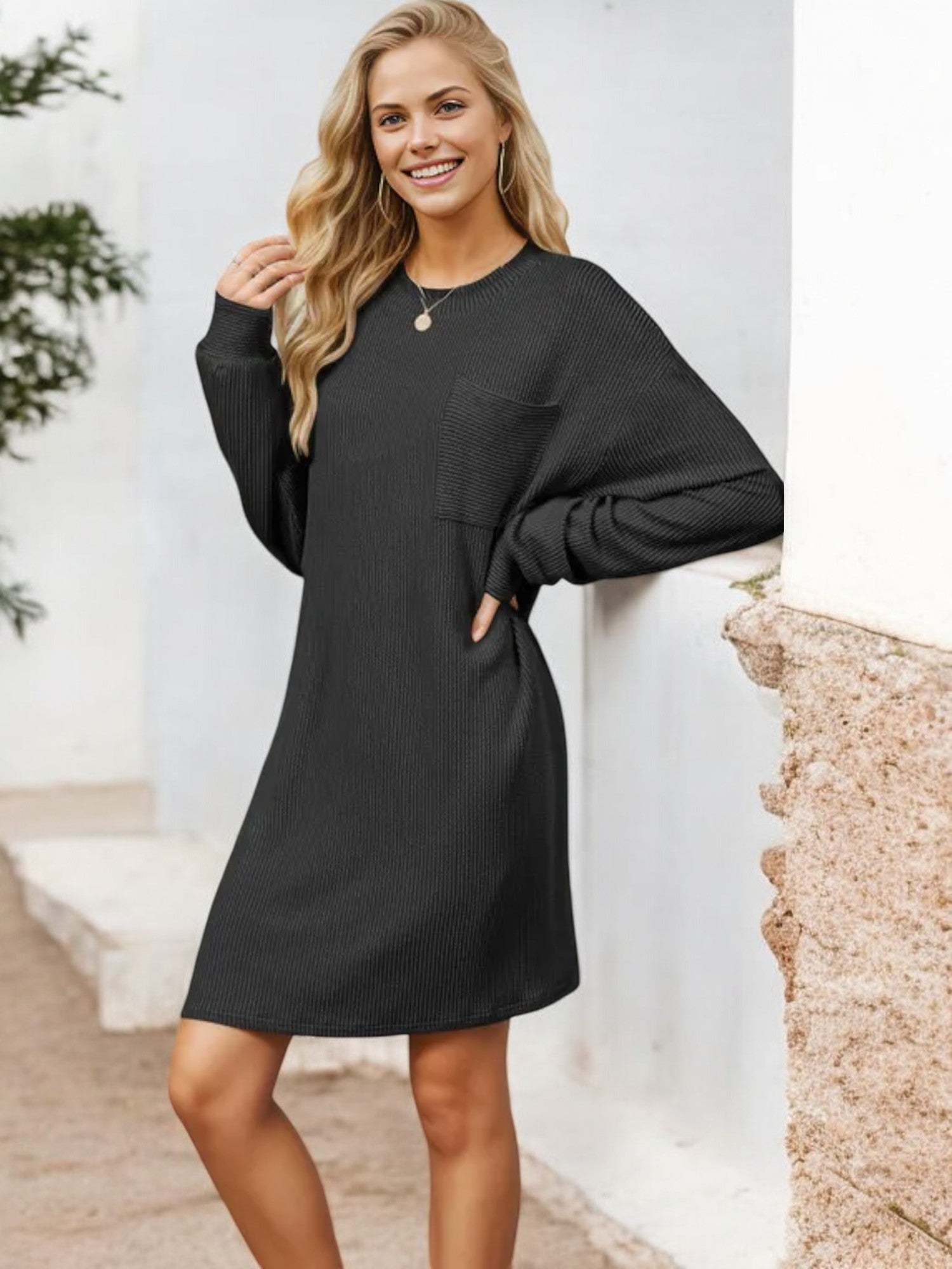 Long Sleeve Ribbed Knit Dress with Front Pocket Detail