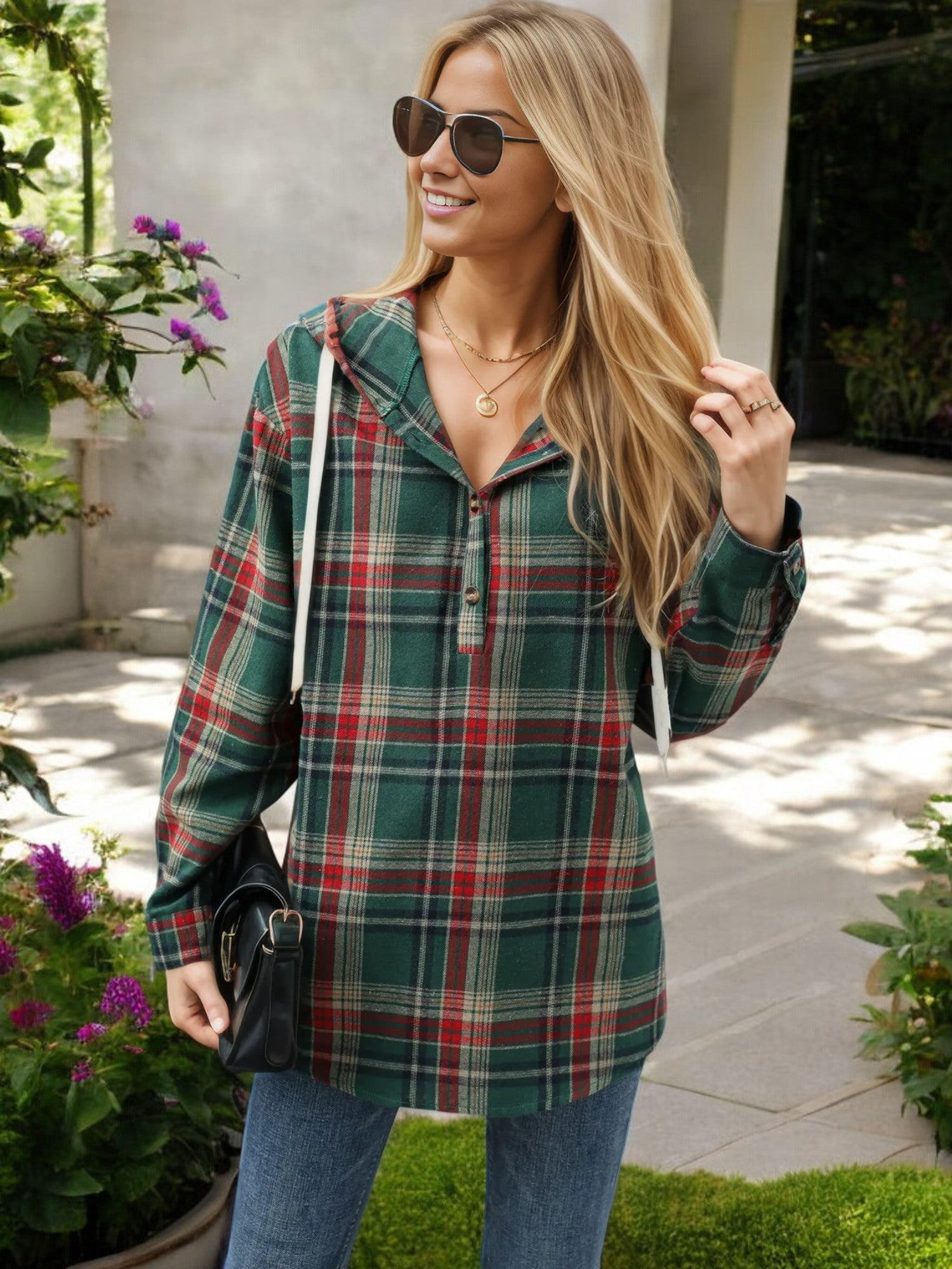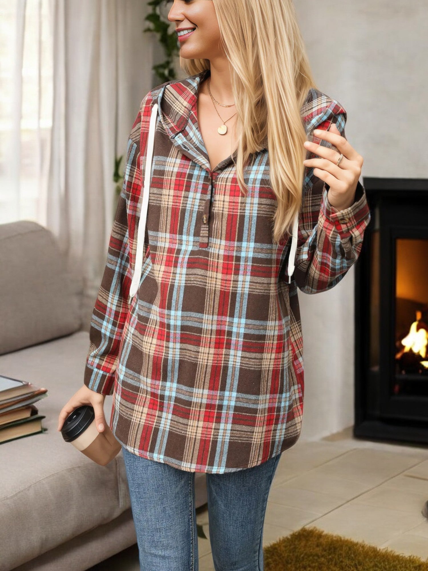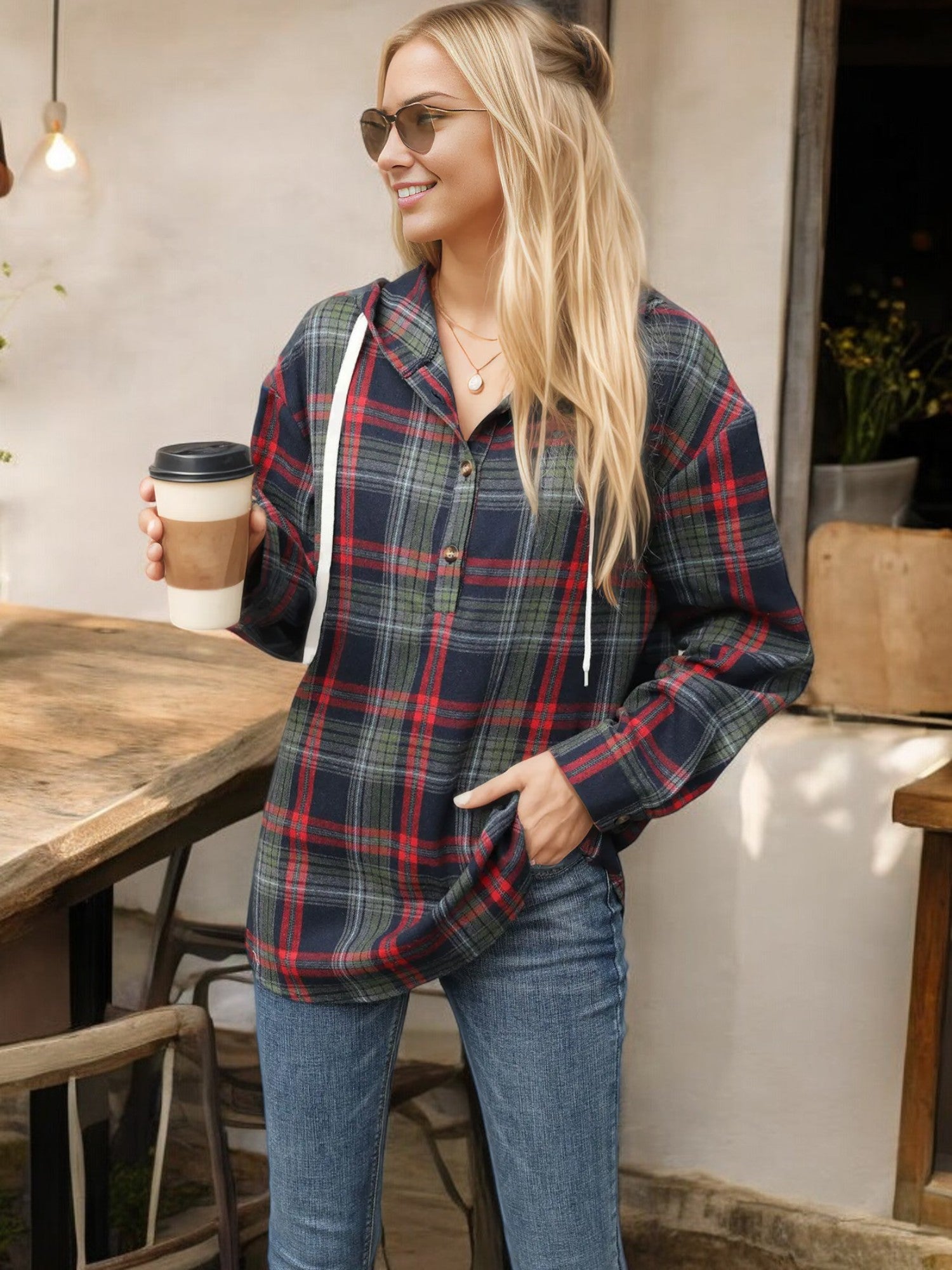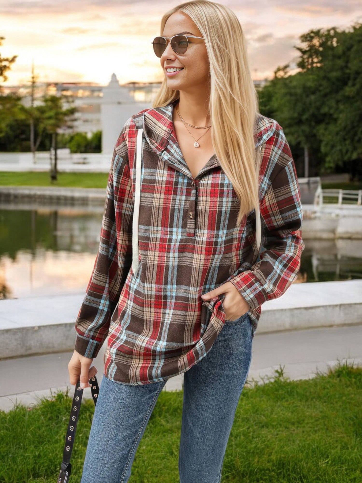 Stay cozy and stylish with this Plaid Hooded Button-Up Shirt, featuring a classic plaid pattern and comfortable hood with adjustable drawstring. The relaxed fit and button-up design make it perfect for layering over tees or wearing on its own. With its soft fabric and practical front pocket, this shirt is ideal for casual outings, weekend adventures, or cozy evenings by the fire. Pair it with jeans and boots for a laid-back yet trendy look that's perfect for any season.