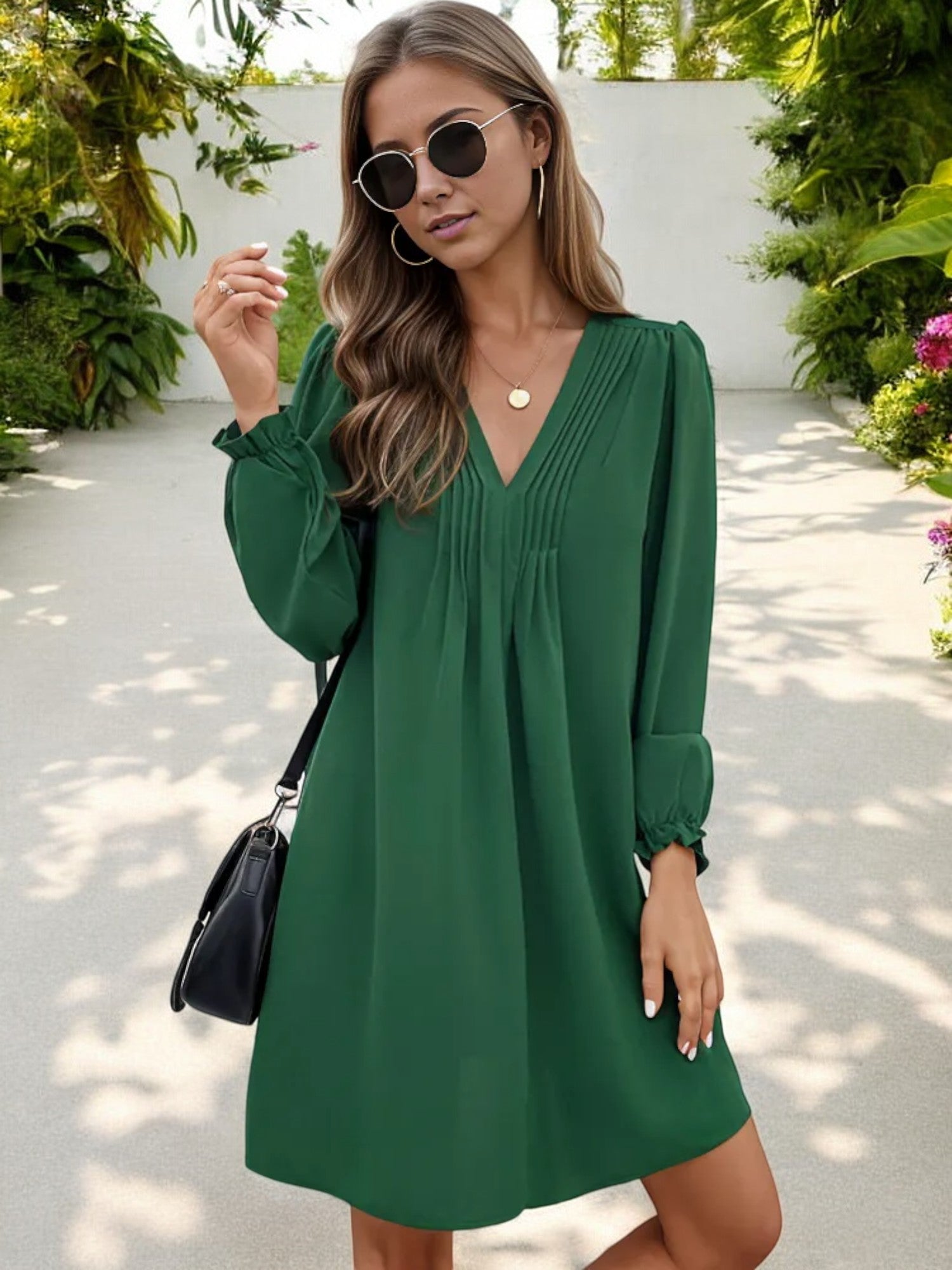 Embrace effortless elegance with this Long Sleeve V-Neck Shift Dress, featuring delicate pleated details along the neckline and a relaxed silhouette. The flowy design ensures comfort, while the gathered cuffs add a touch of sophistication. Perfect for both casual and dressy occasions, this versatile dress can be paired with sandals or boots for a chic, go-to look. Whether you're attending a brunch or a special event, this dress is an easy choice for stylish comfort.
