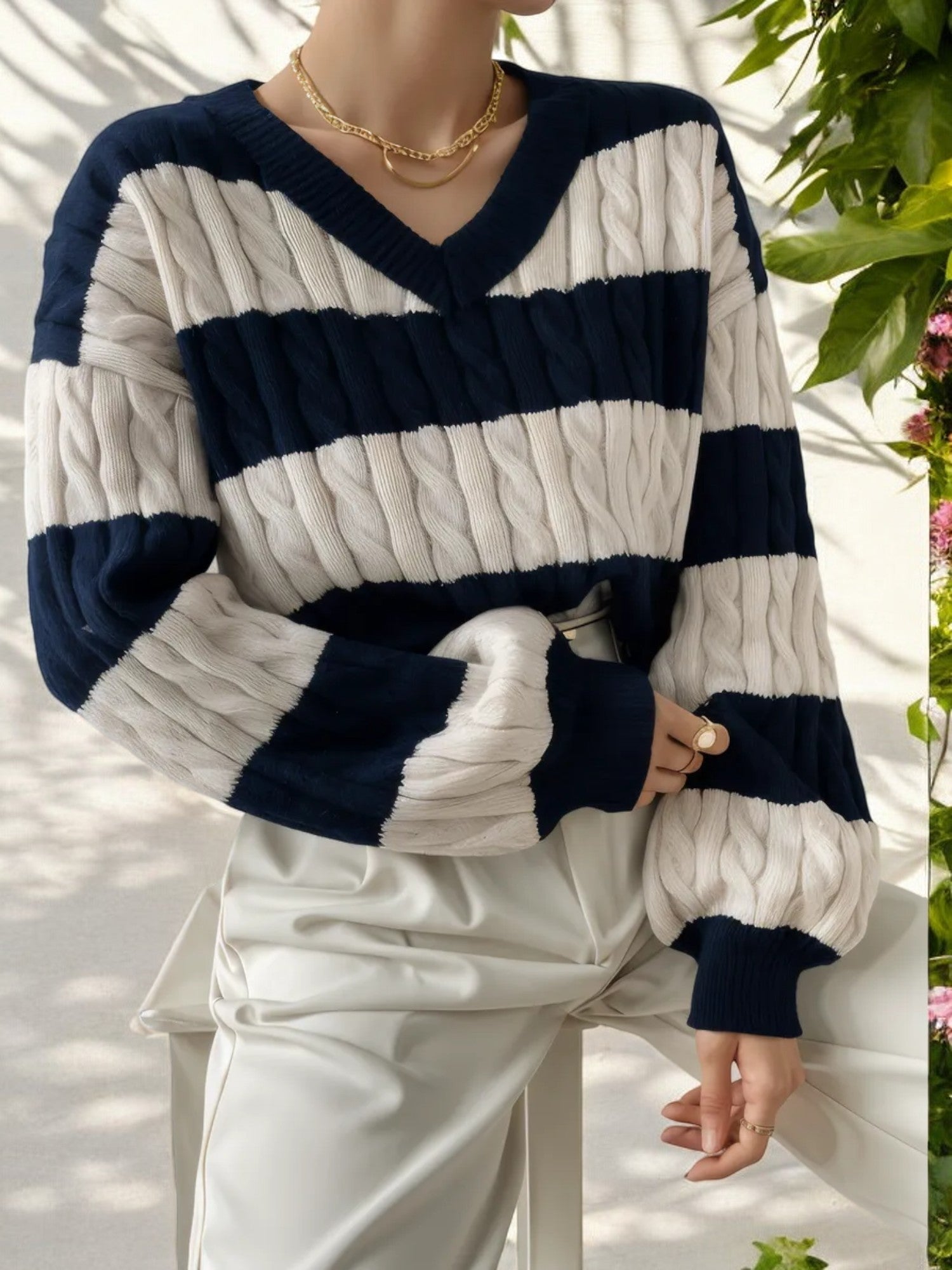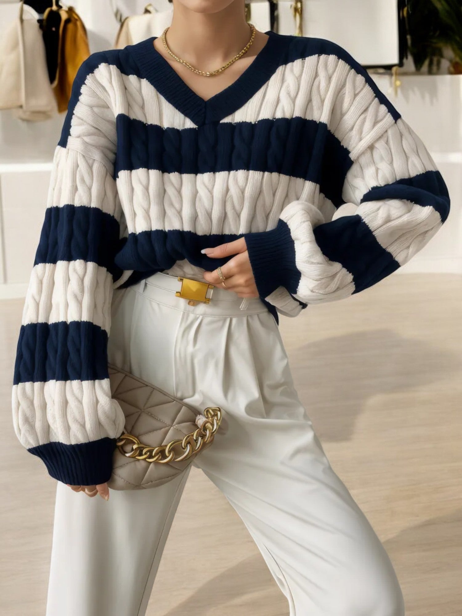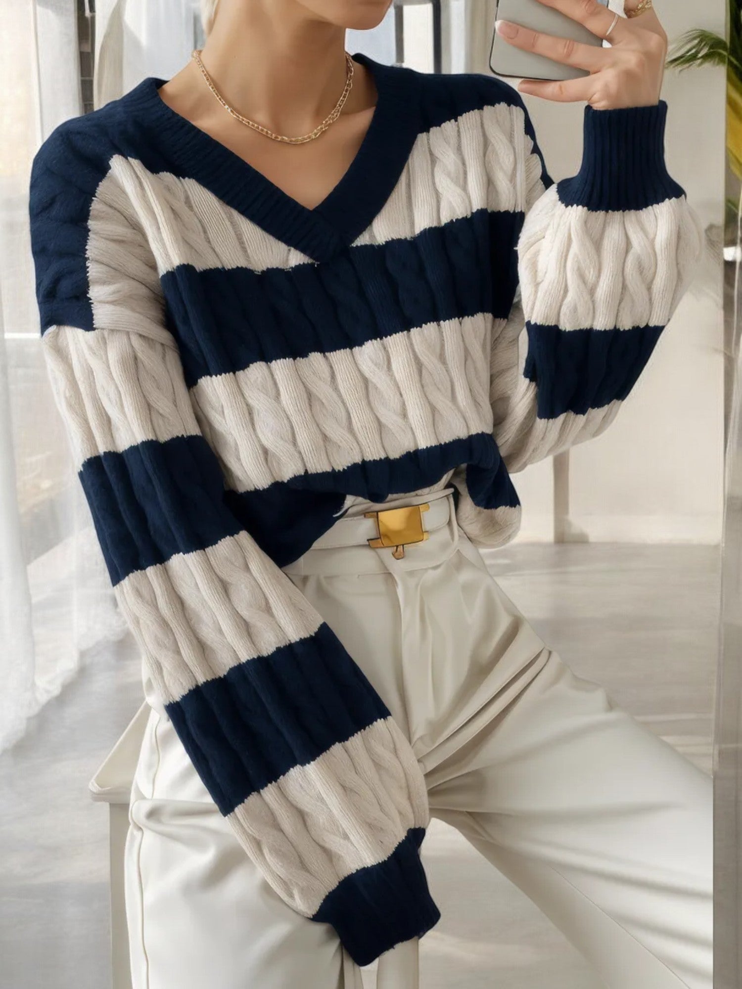 Chunky Striped Cable Knit Sweater with V-Neckline
