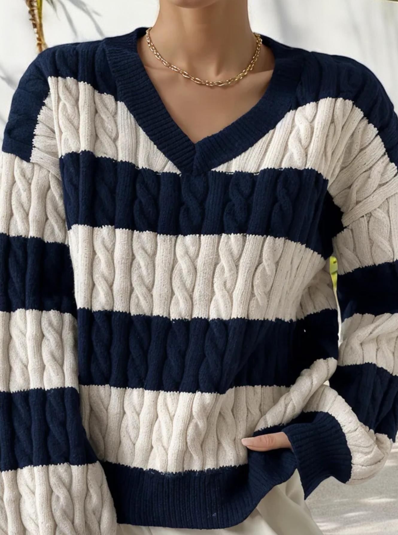 Stay warm and stylish with this Chunky Striped Cable Knit Sweater, featuring bold stripes and a flattering V-neckline. The classic cable knit pattern adds texture and warmth, while the relaxed fit ensures comfort for all-day wear. Perfect for casual outings or cozy days at home, this sweater pairs effortlessly with jeans, trousers, or leggings. Whether you're layering up for cooler weather or looking for a chic addition to your wardrobe, this striped knit sweater is a versatile and timeless choice.