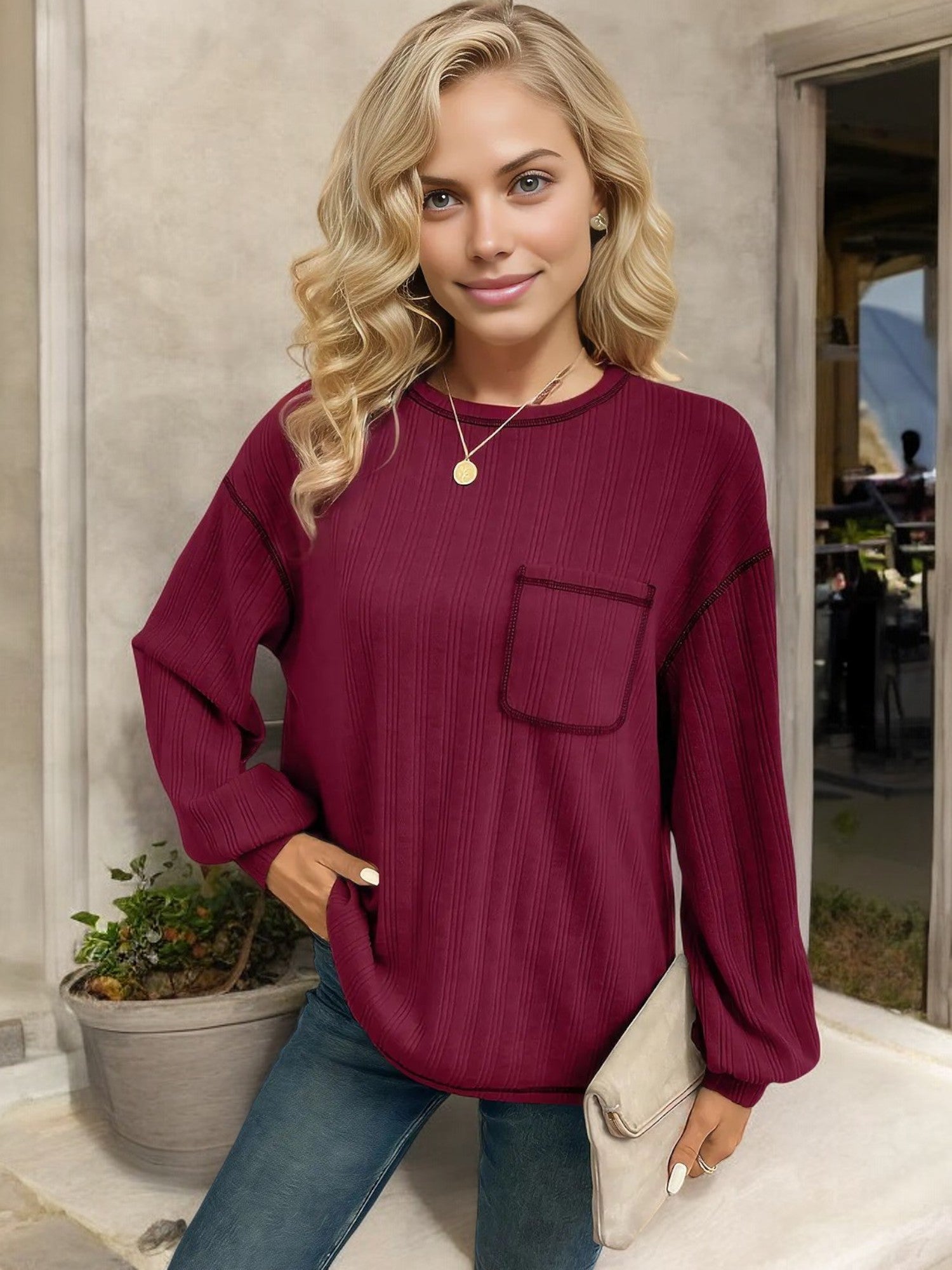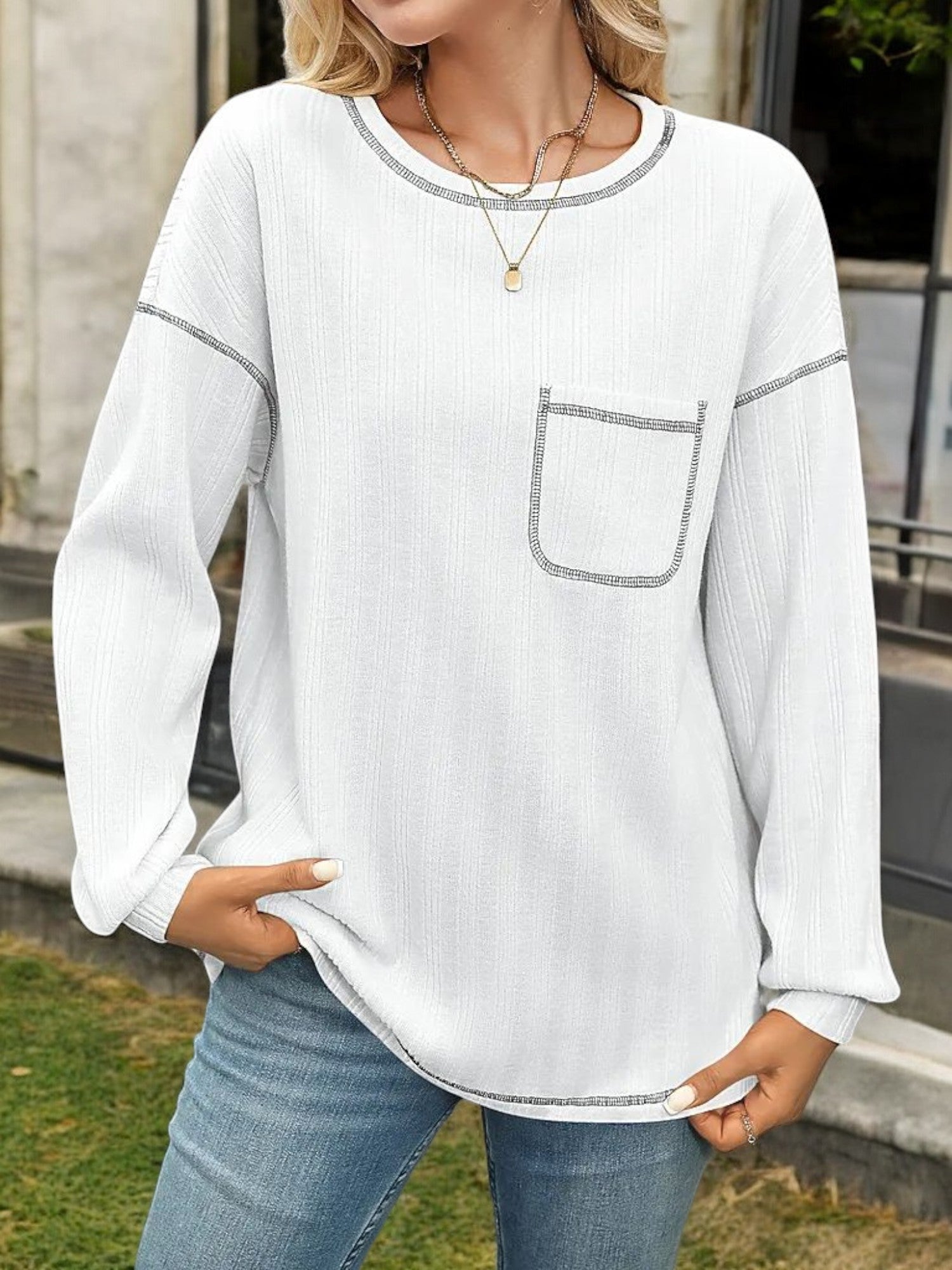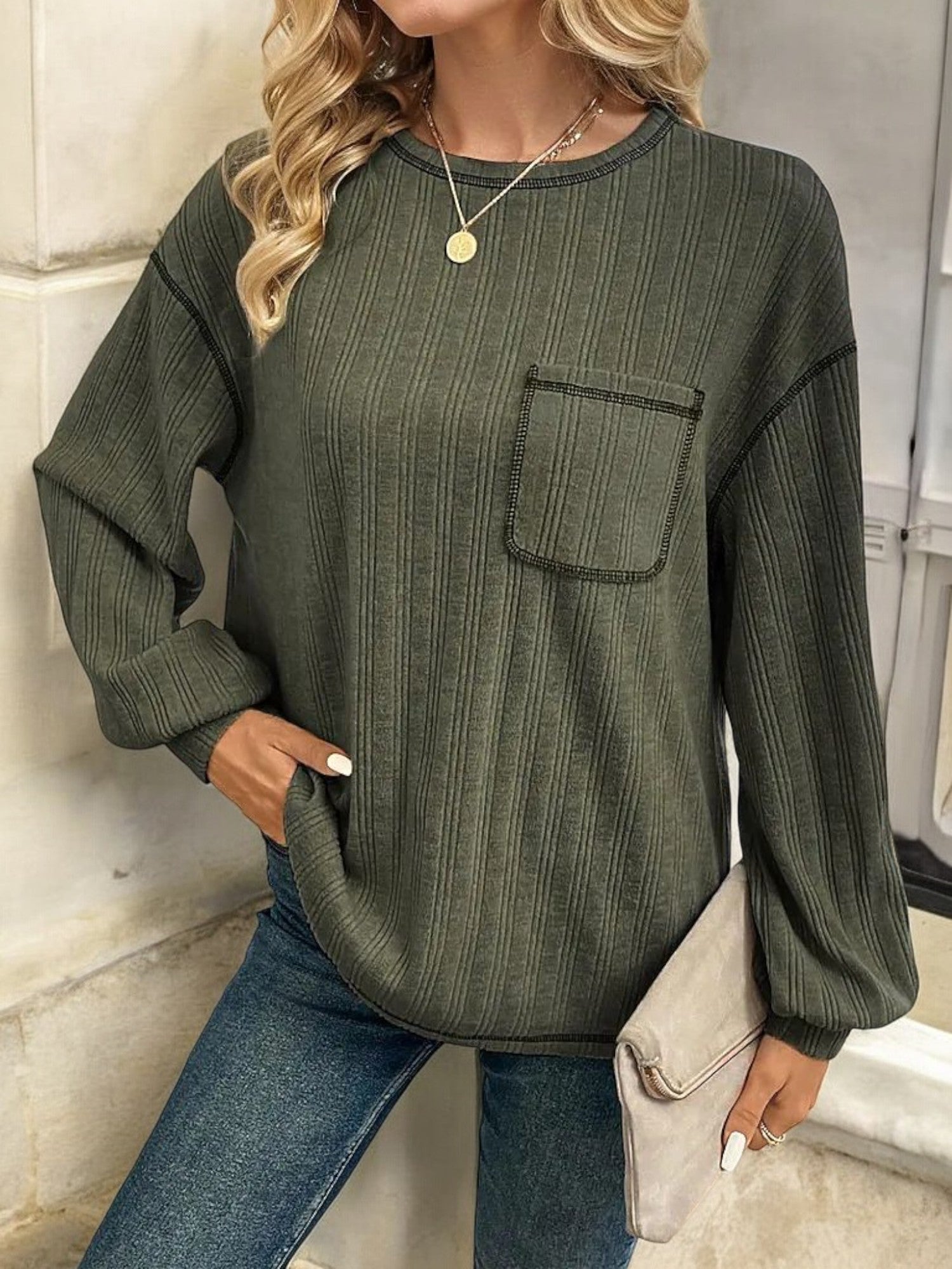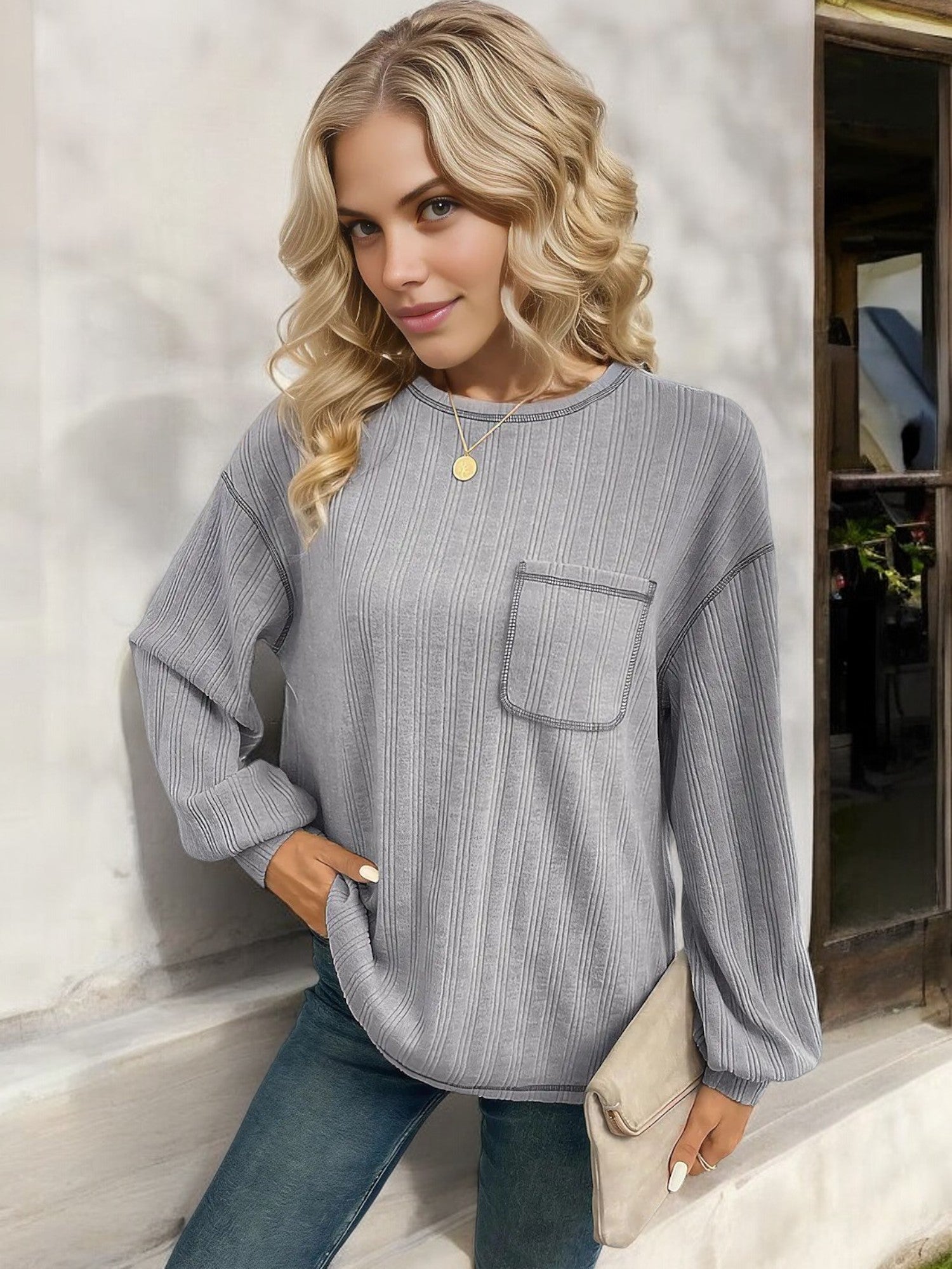 Striped Long Sleeve Top with Front Pocket and Relaxed Fit