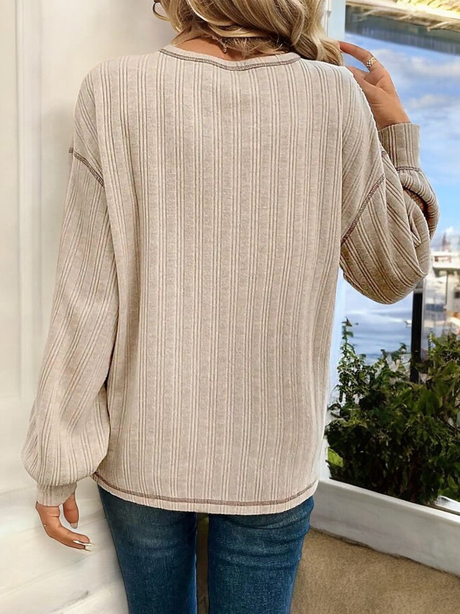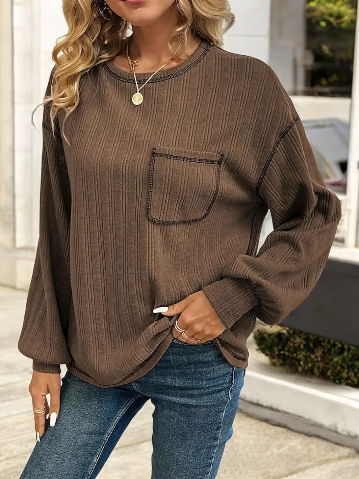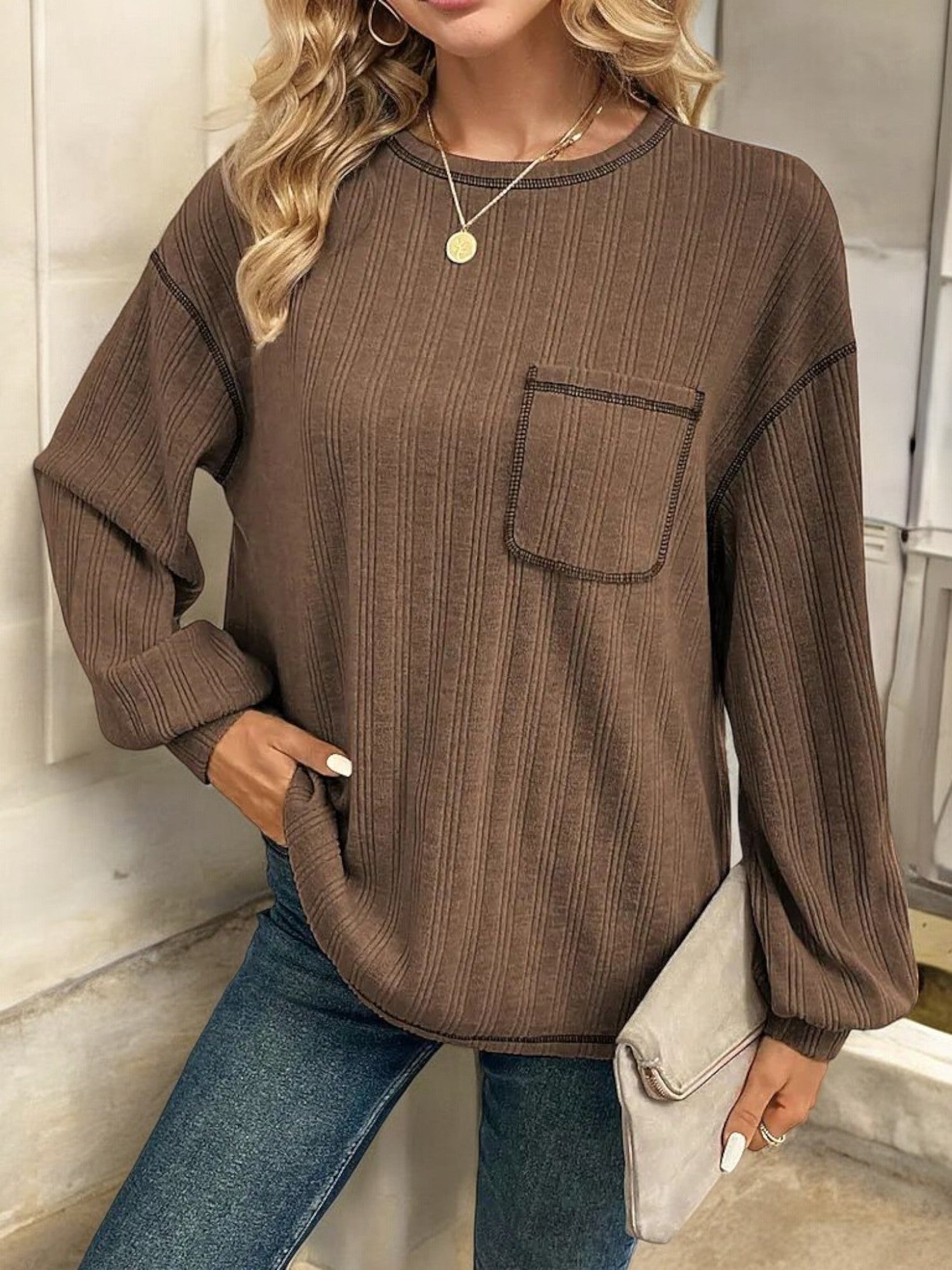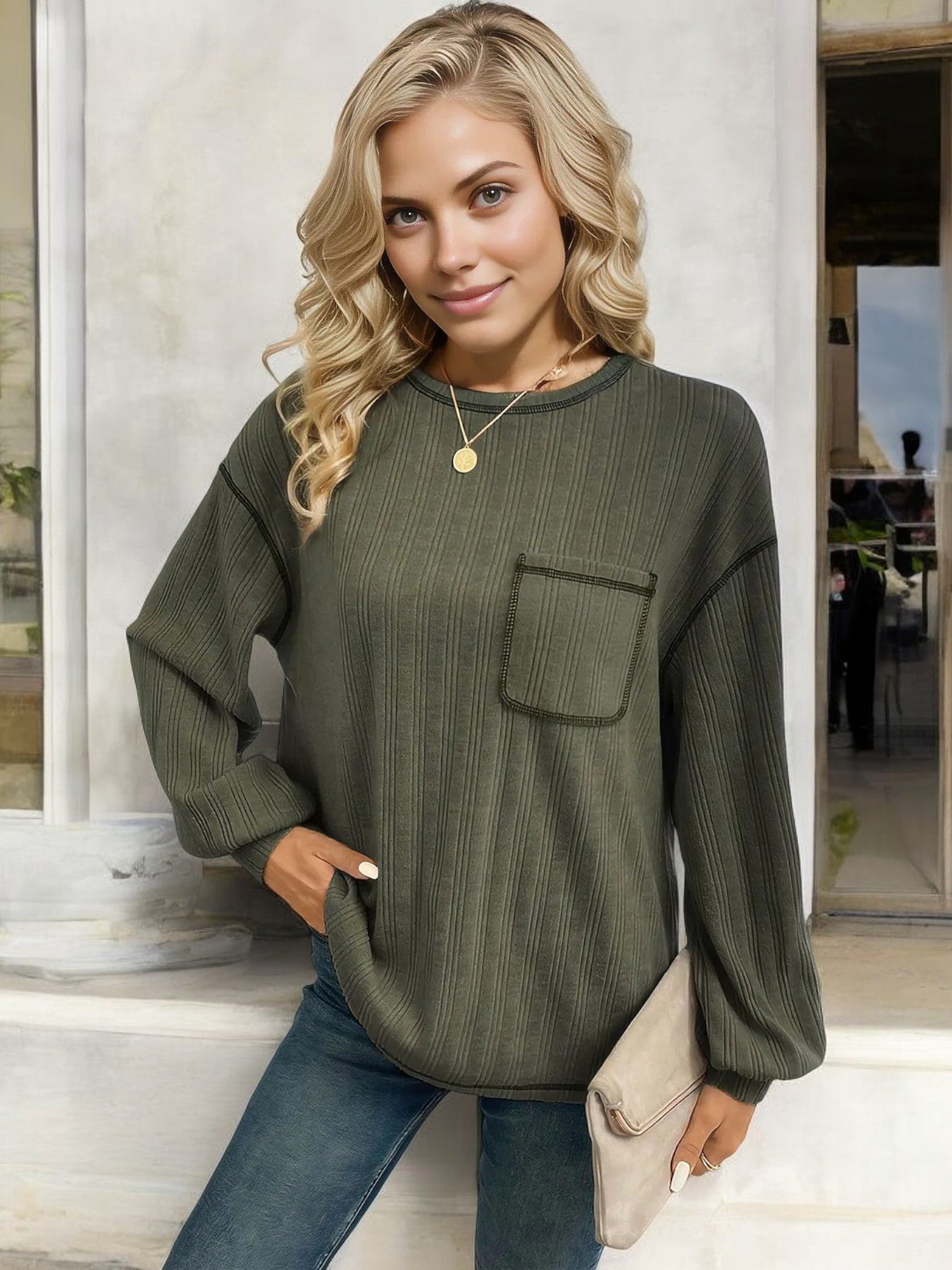 Striped Long Sleeve Top with Front Pocket and Relaxed Fit