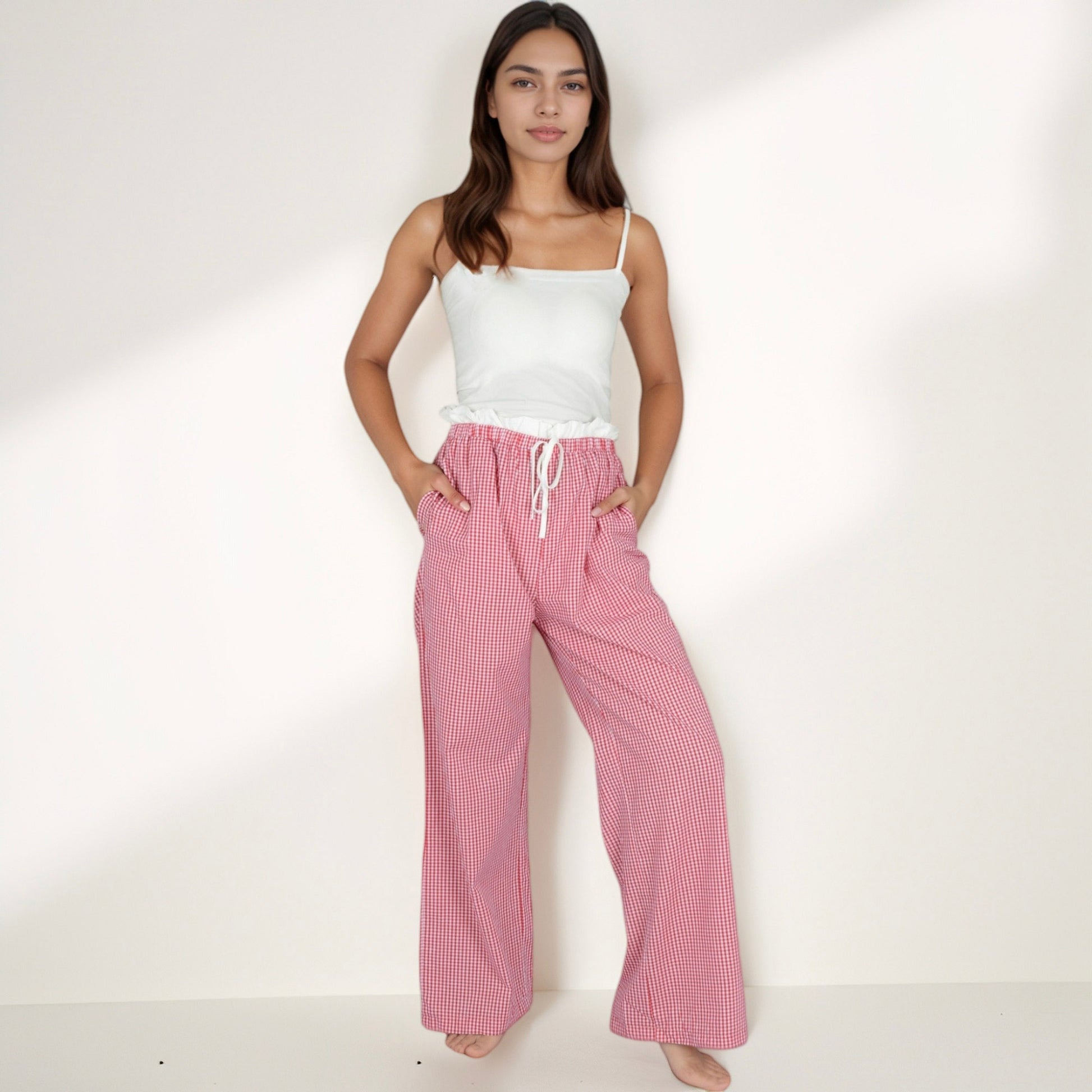 These women's lounge pants feature a charming gingham check pattern and a relaxed straight-leg silhouette for laid-back comfort. The elastic waistband with an adjustable drawstring ensures a secure and customizable fit. Crafted from soft, lightweight fabric, they are perfect for cozy days at home or casual lounging.