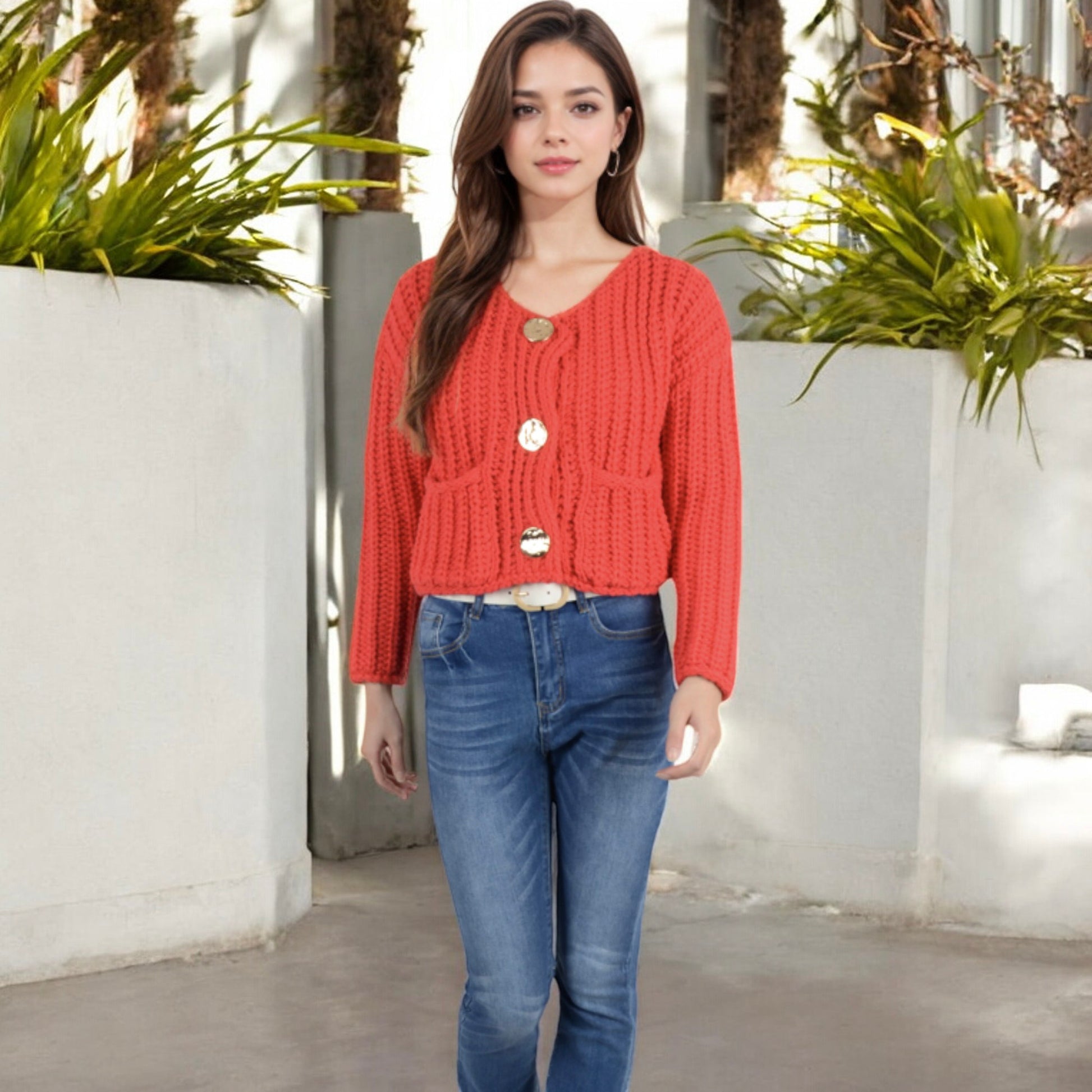 Chunky Knit Cardigan with Statement Button Front and Deep Pockets