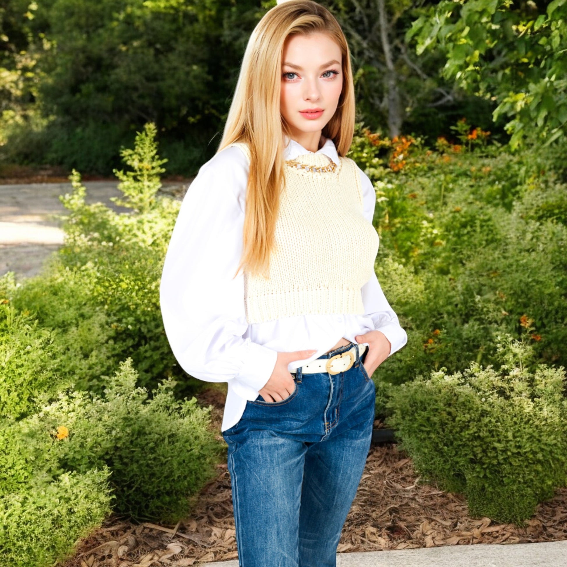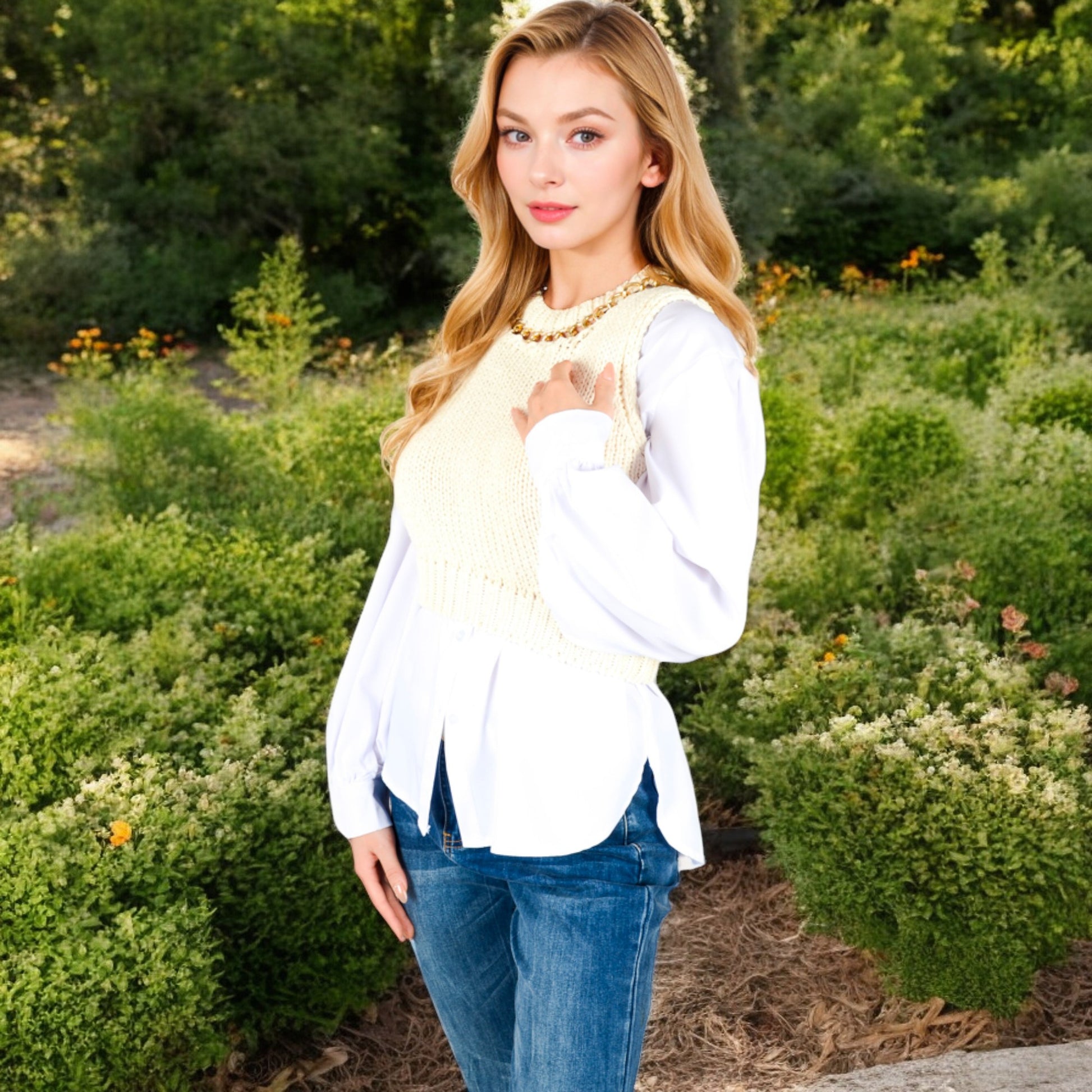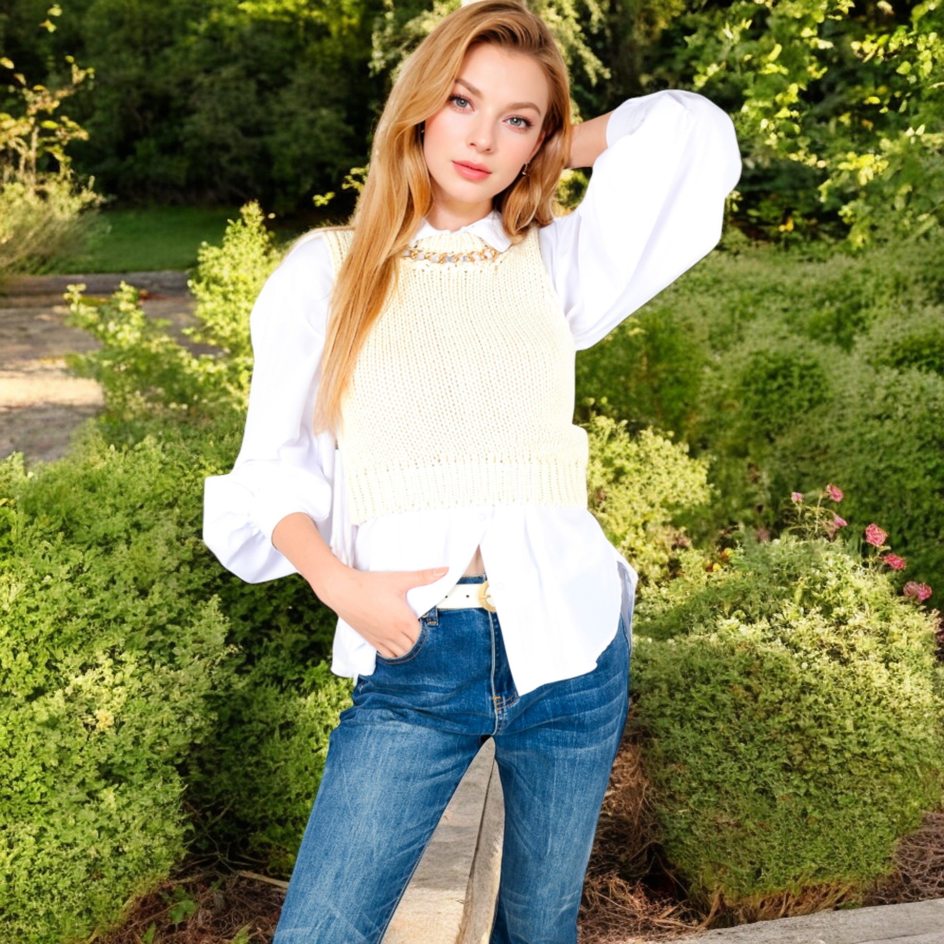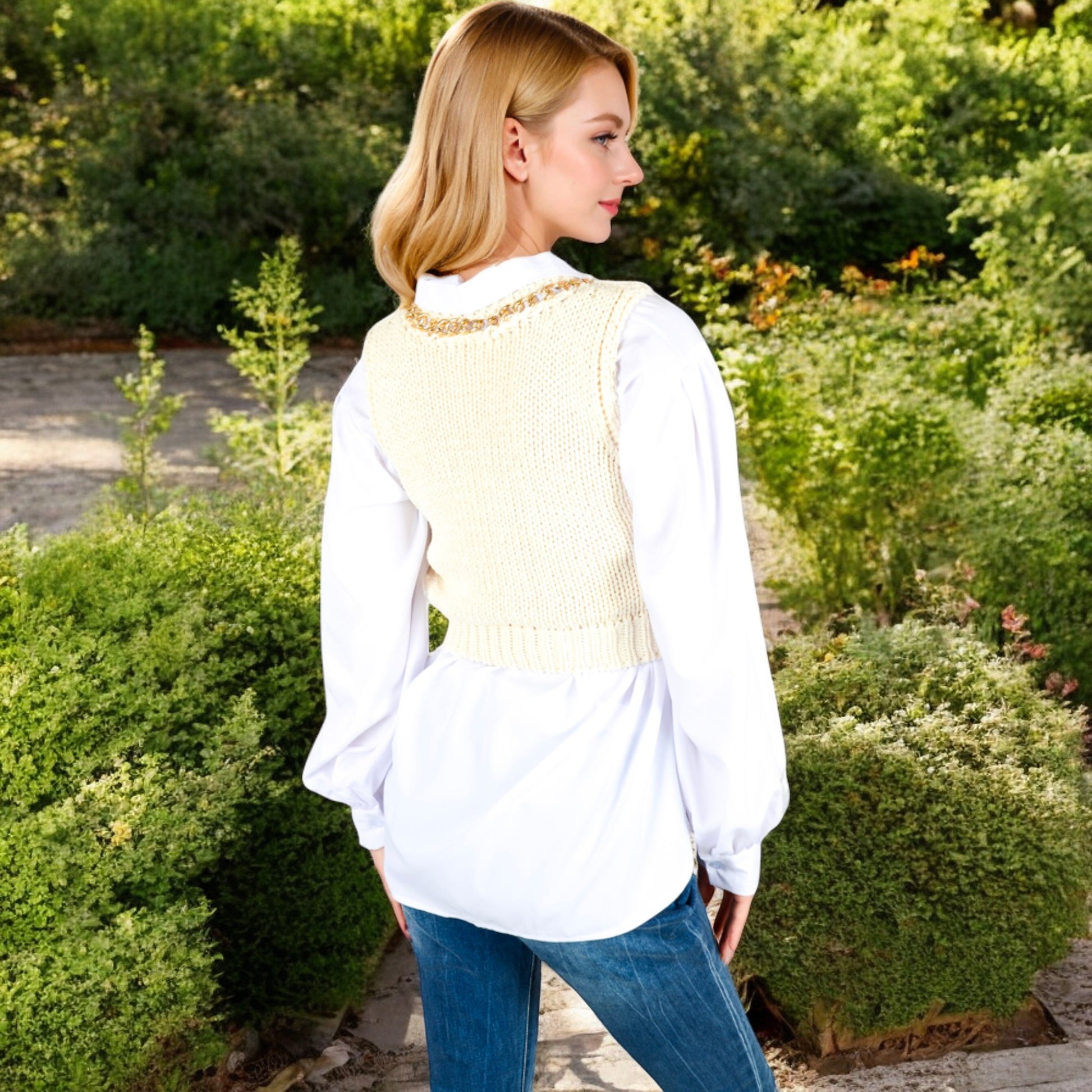 This chunky knit sweater vest combines cozy texture with a touch of glam, featuring a striking chain detail along the crew neckline. Perfect for layering over shirts or dresses, its fitted silhouette offers stylish warmth and comfort. Ribbed hems add a polished finish, making it a versatile piece for both casual and chic ensembles. Pair it with denim or trousers for a standout look.
