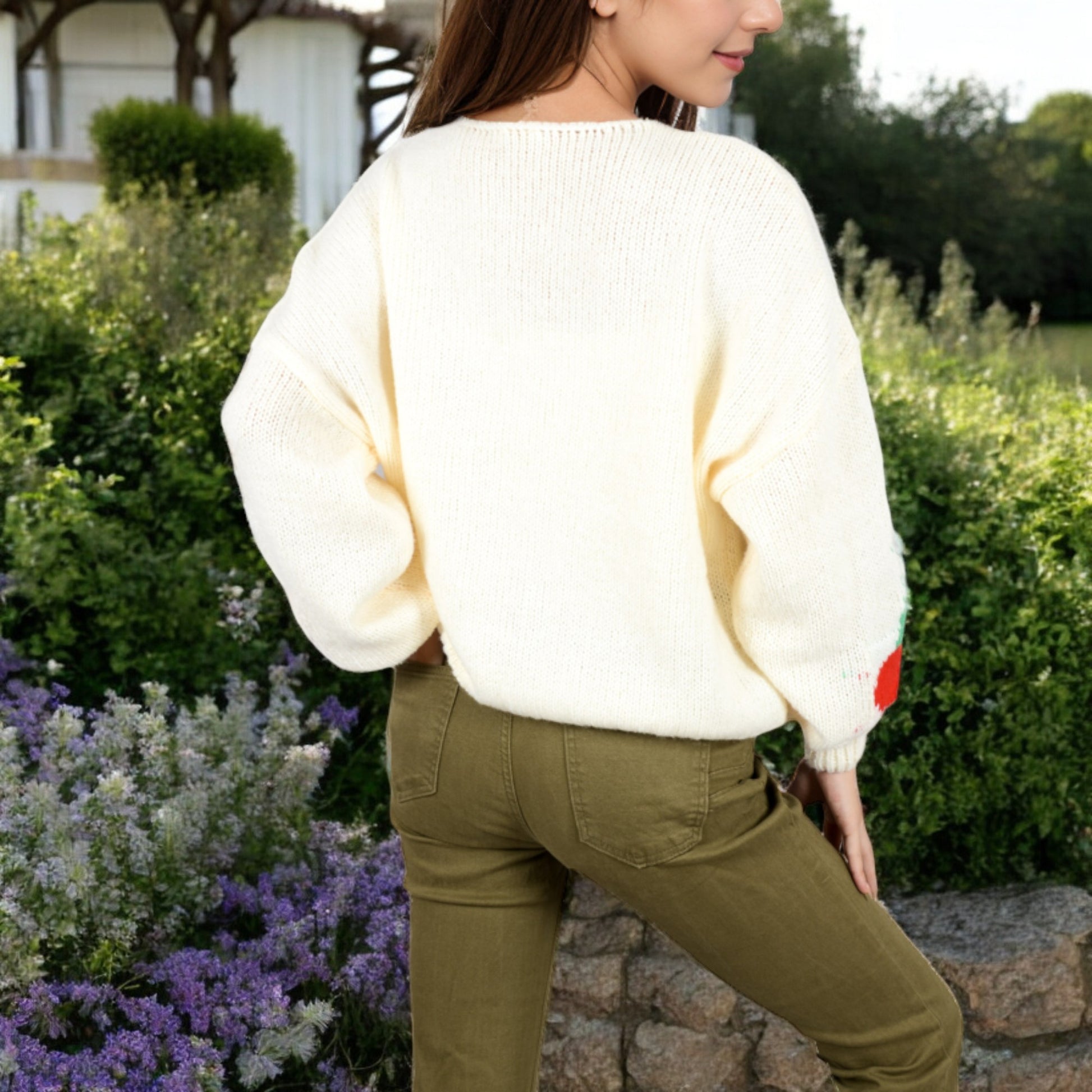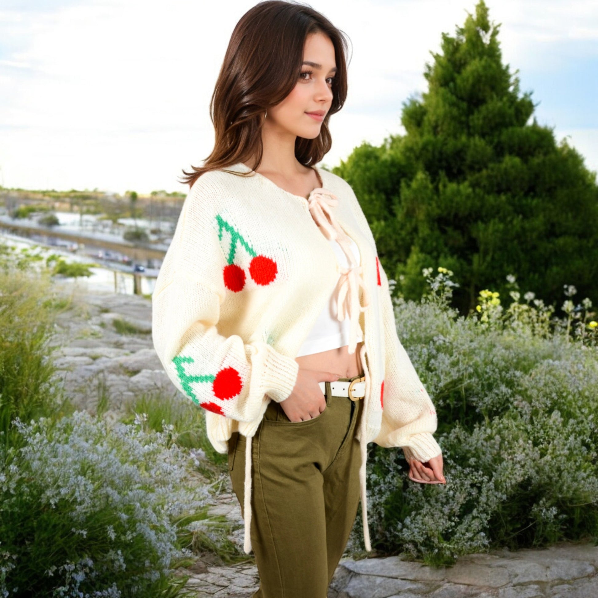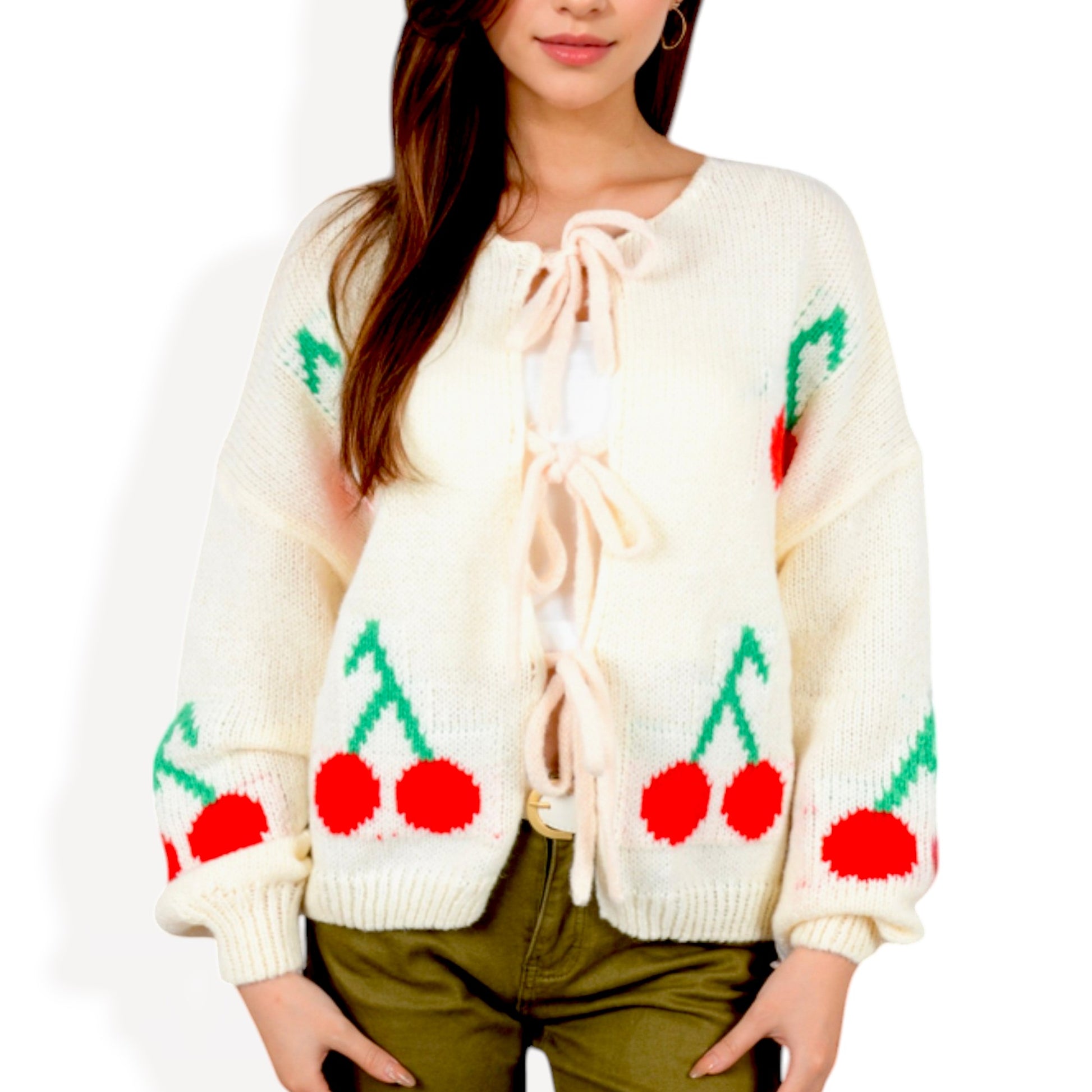 Anna-Kaci Women's Chunky Knit Tie-Front Cardigan with Cherry Pattern