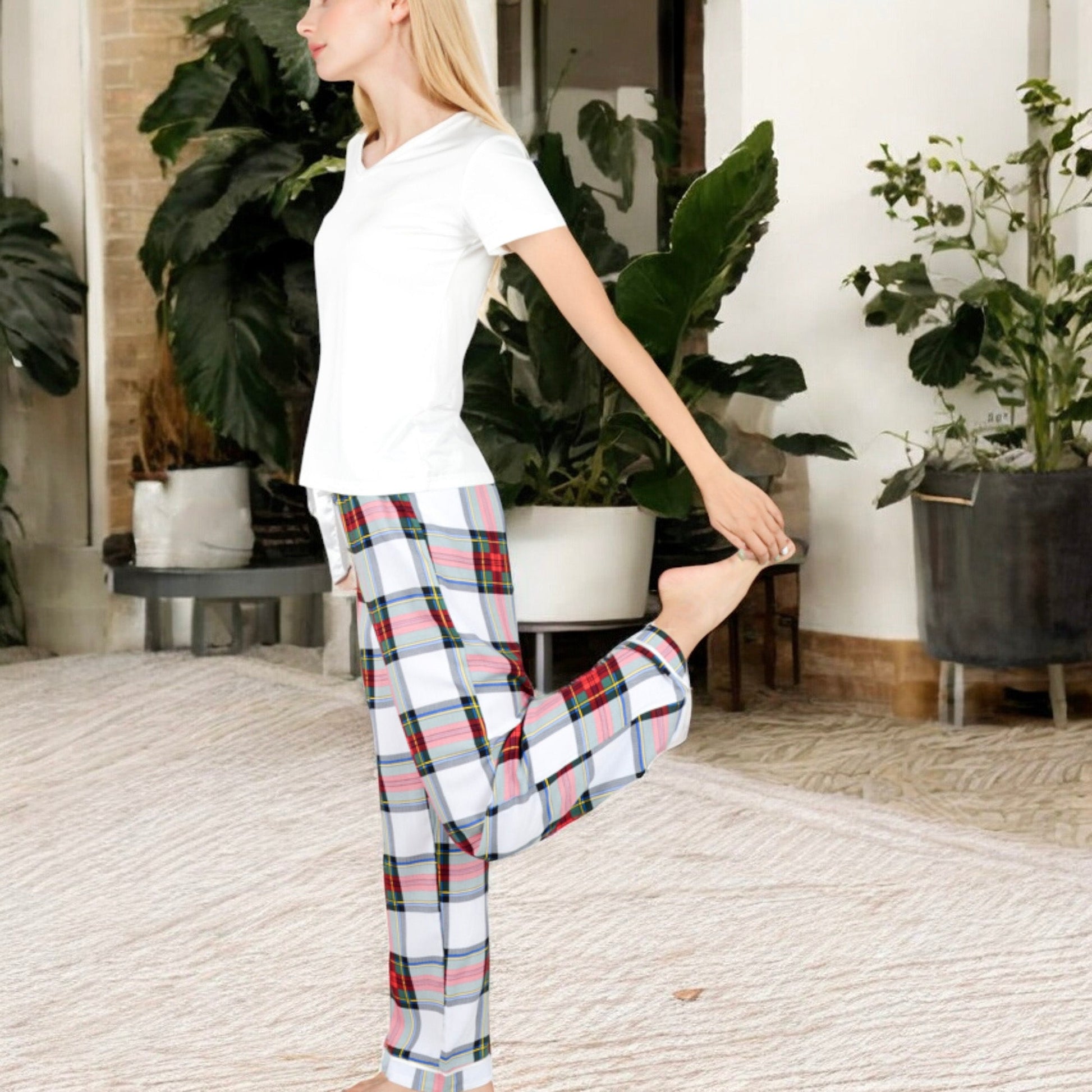 This Anna-Kaci Women's Cozy Pajama Set features a soft short sleeve V-neck tee paired with classic plaid pants, offering a relaxed fit for ultimate comfort. Perfect for lounging or a good night's sleep, the breathable fabric ensures all-day wearability. The stylish plaid design adds a fun touch, while the tee provides a versatile piece that can be mixed and matched with your favorite lounge essentials. Ideal for cozy evenings or lazy weekends.