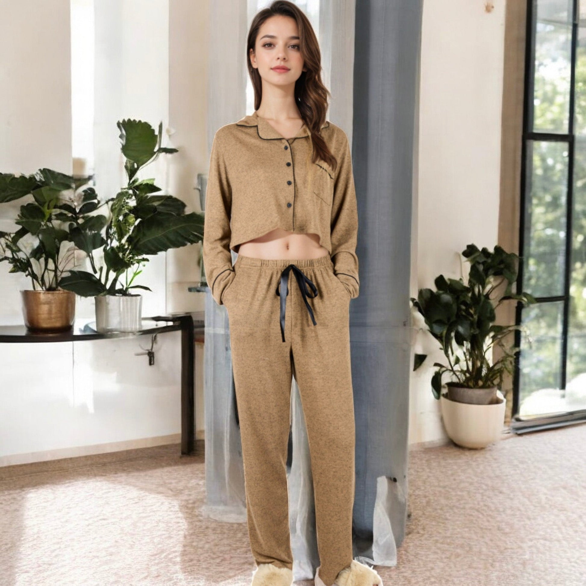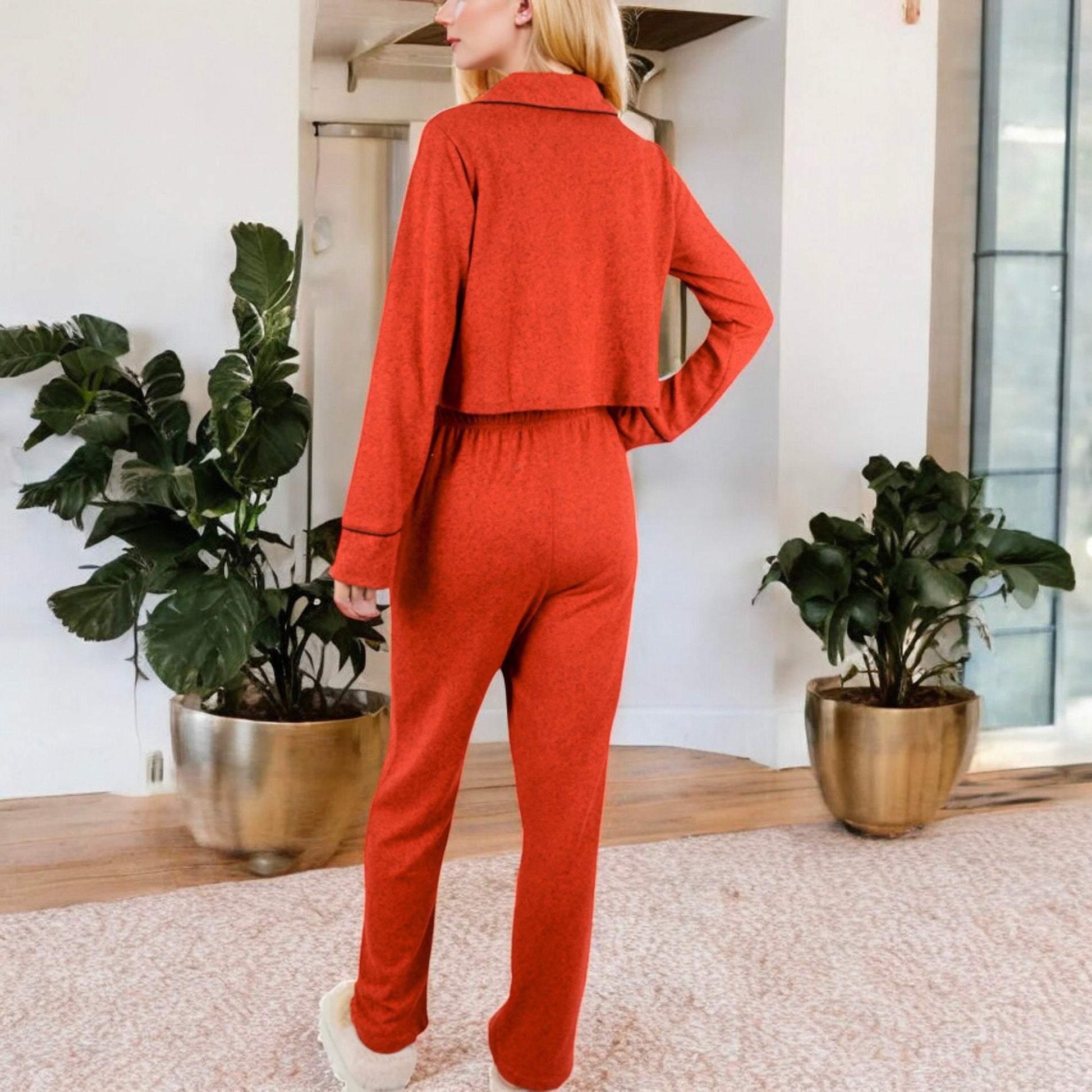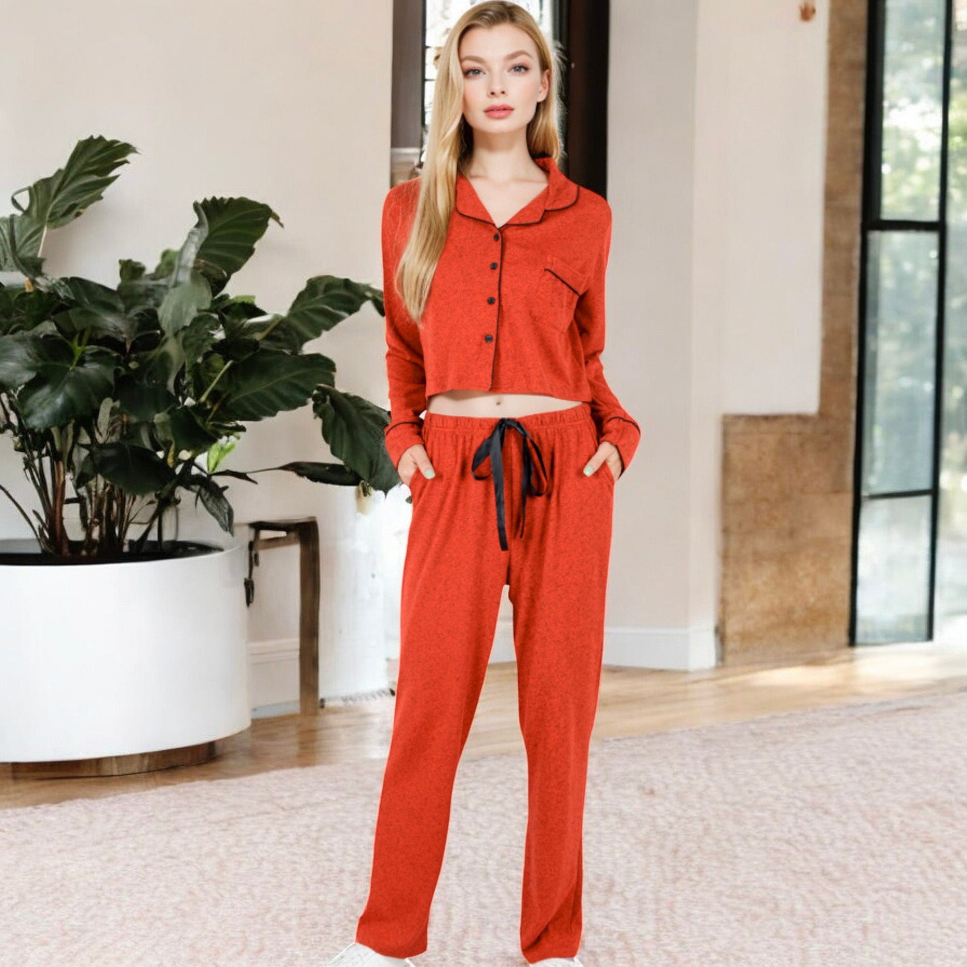 This Anna-Kaci Women's Long Sleeve Pajama Set combines comfort and style, featuring a button-up top with piped trim details and matching pants for a coordinated look. The soft, lightweight fabric ensures a cozy feel, perfect for relaxing at home or getting a restful night's sleep. With its relaxed fit, this set offers both comfort and ease of movement, making it a versatile addition to your loungewear collection. Ideal for year-round wear, this set brings a touch of elegance to your bedtime routine.
