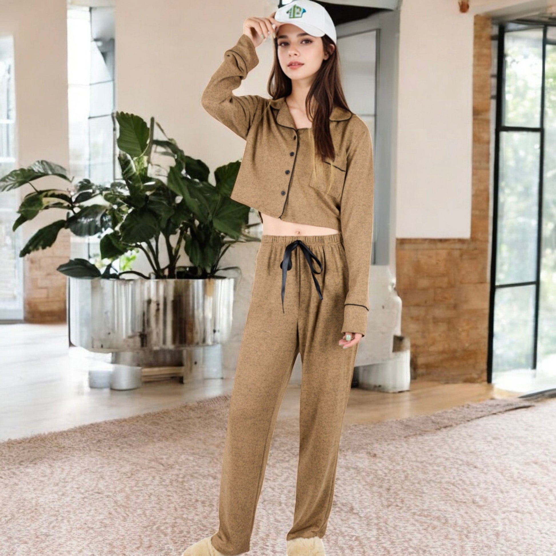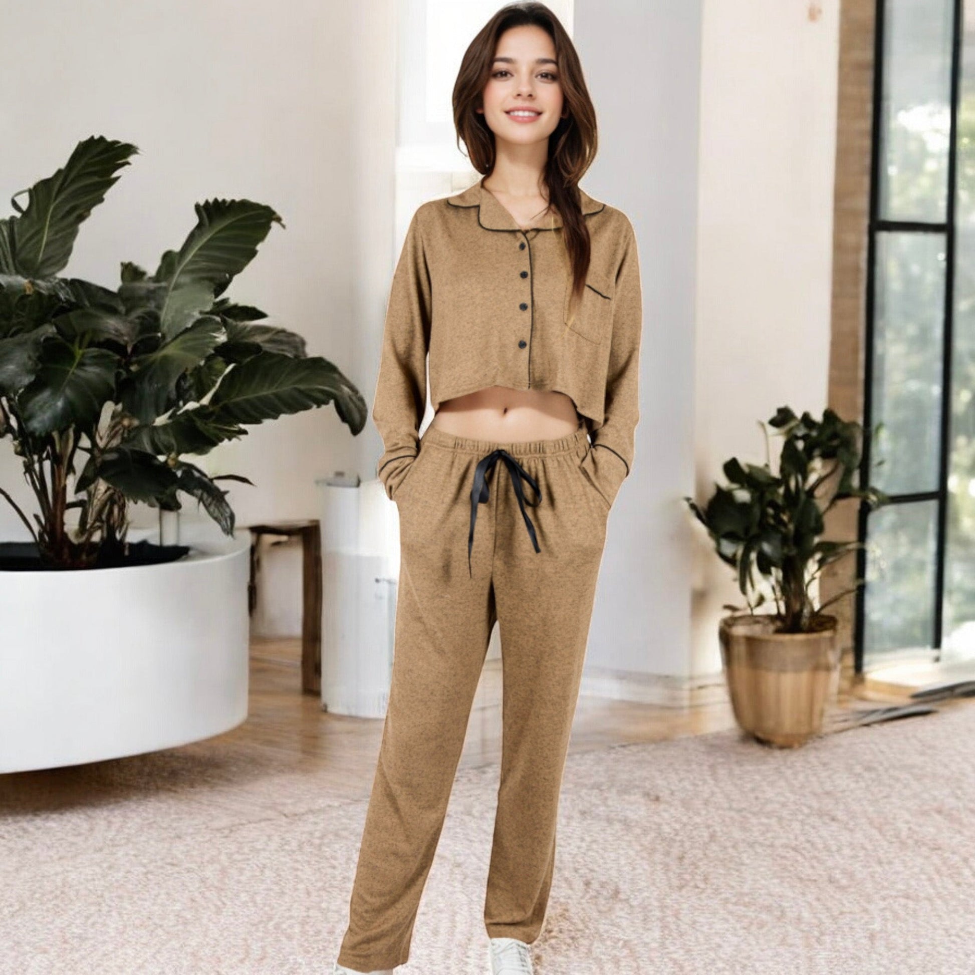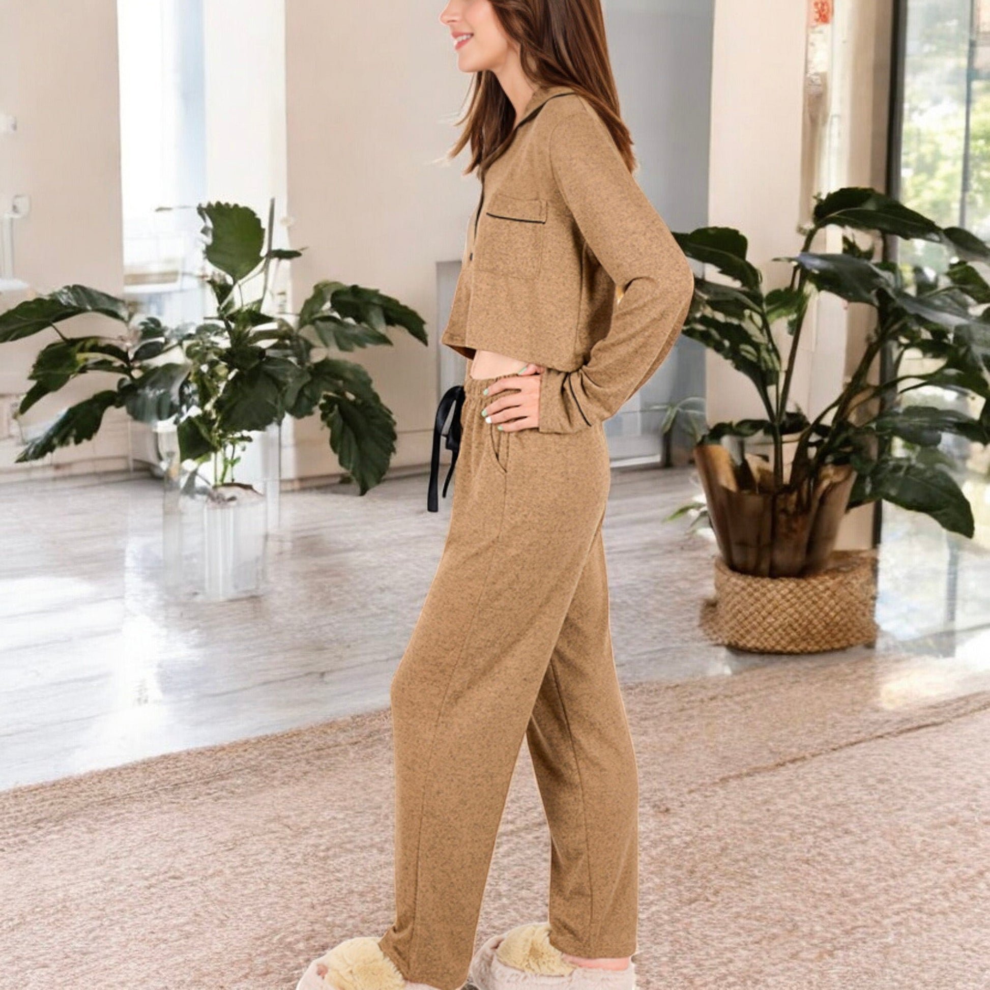 This Anna-Kaci Women's Long Sleeve Pajama Set combines comfort and style, featuring a button-up top with piped trim details and matching pants for a coordinated look. The soft, lightweight fabric ensures a cozy feel, perfect for relaxing at home or getting a restful night's sleep. With its relaxed fit, this set offers both comfort and ease of movement, making it a versatile addition to your loungewear collection. Ideal for year-round wear, this set brings a touch of elegance to your bedtime routine.