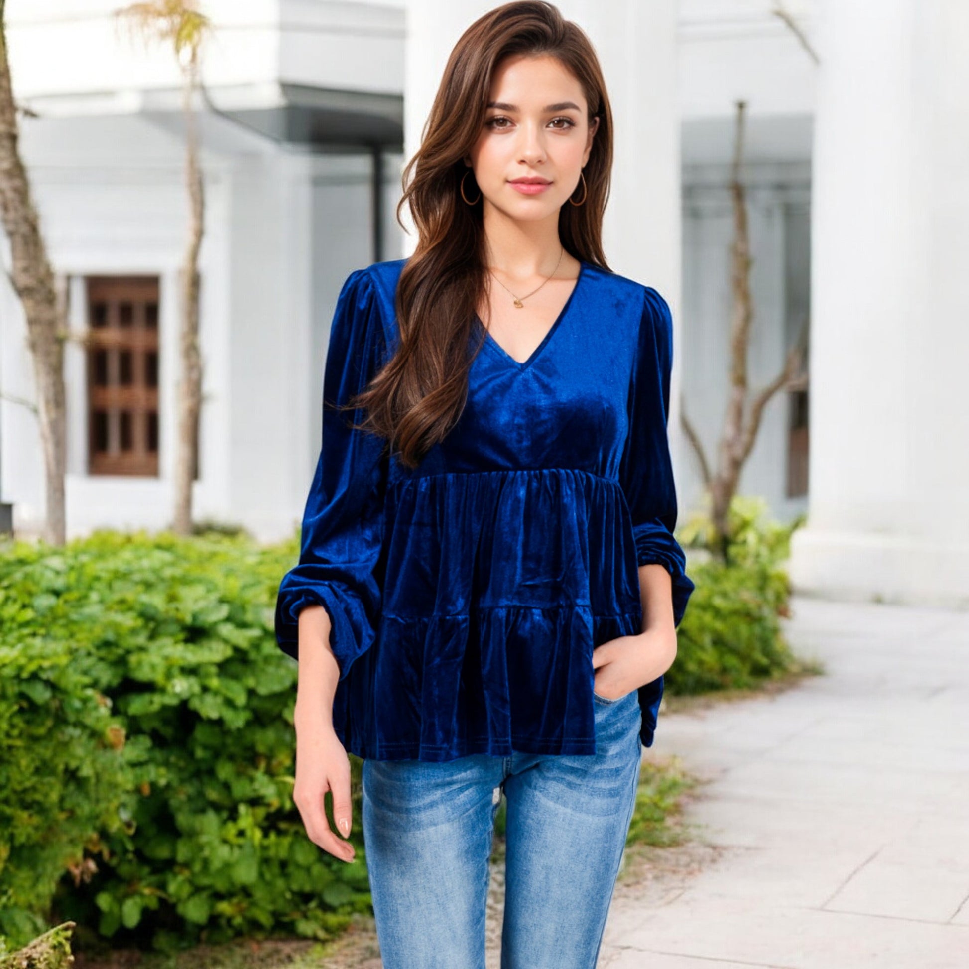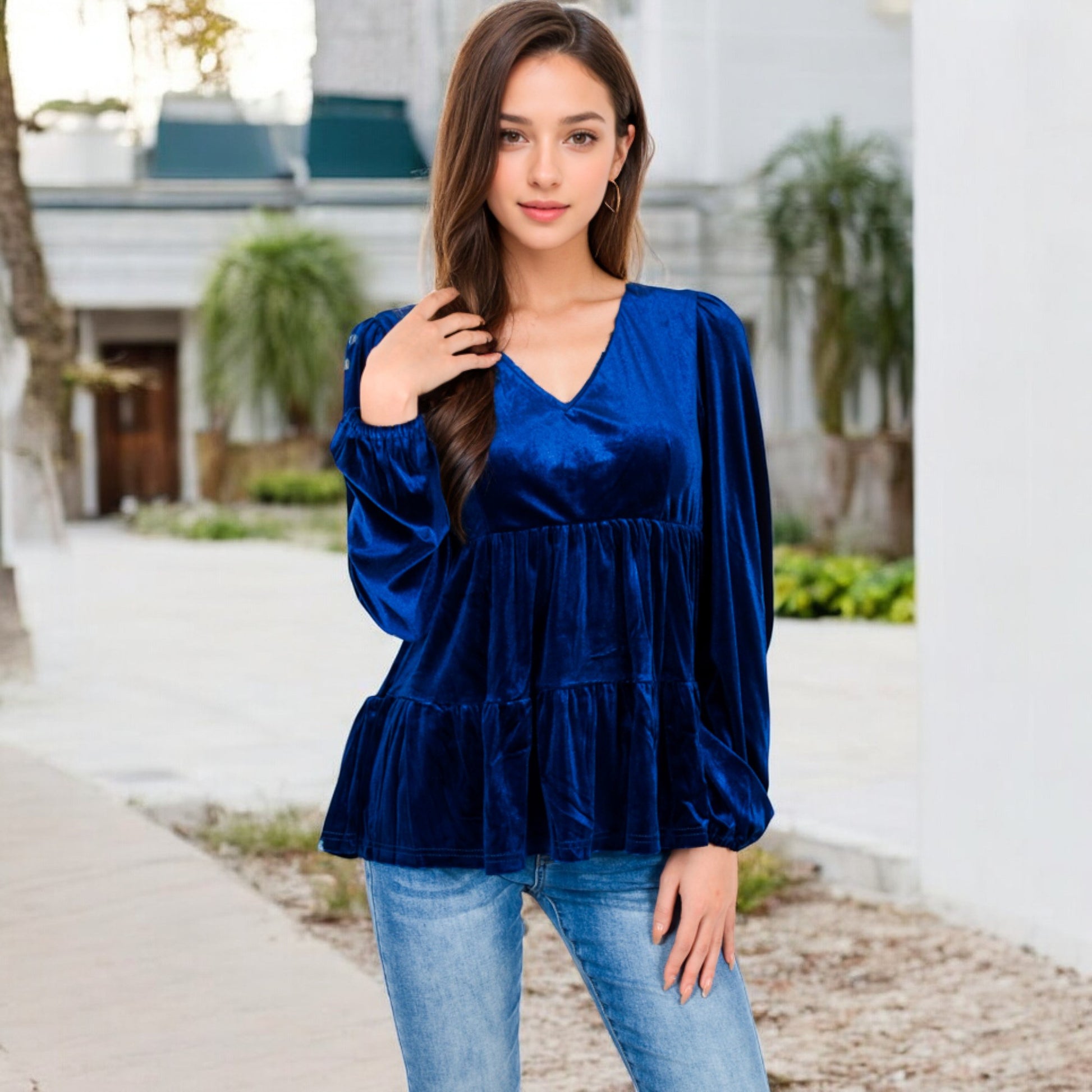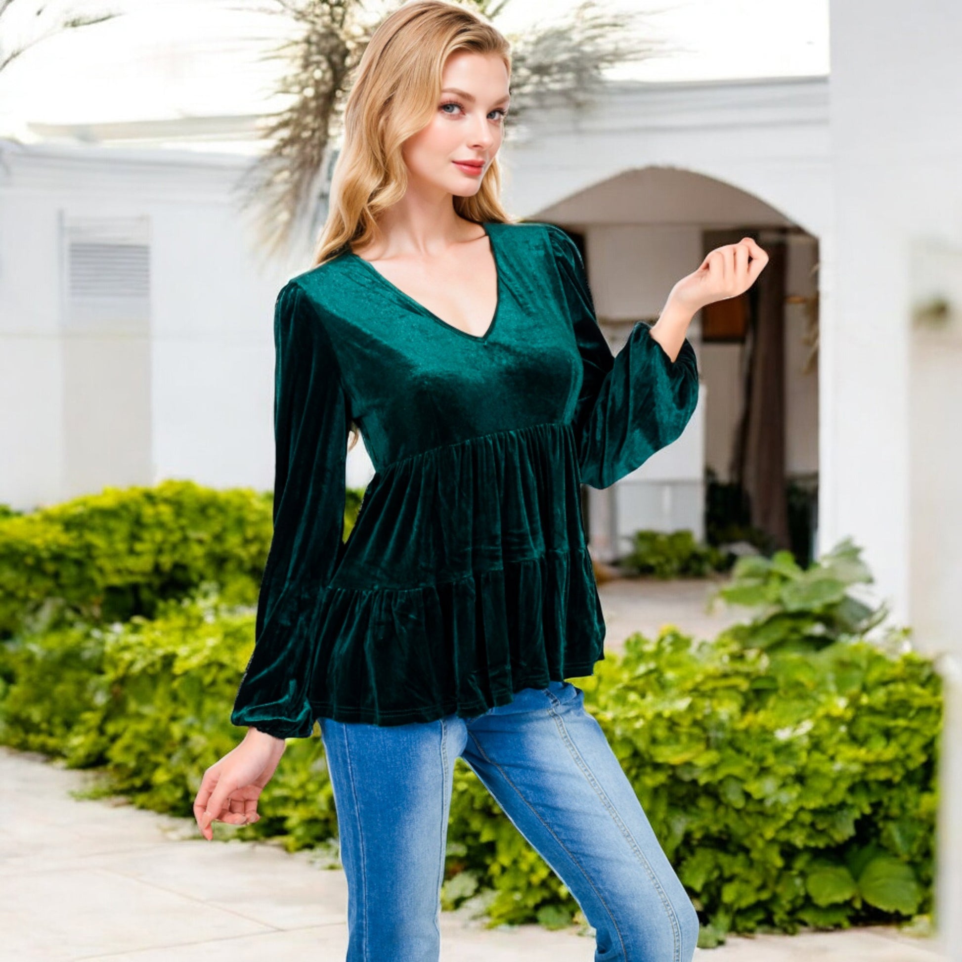 Elevate your style with this luxurious velvet babydoll top, featuring a flattering V-neckline and long gathered sleeves. The tiered waist design adds a touch of sophistication, while providing a relaxed, comfortable fit. Perfect for pairing with jeans or skirts, this elegant top transitions effortlessly from day to night. Soft and chic, it's a must-have addition to your wardrobe for any special occasion or casual outing.