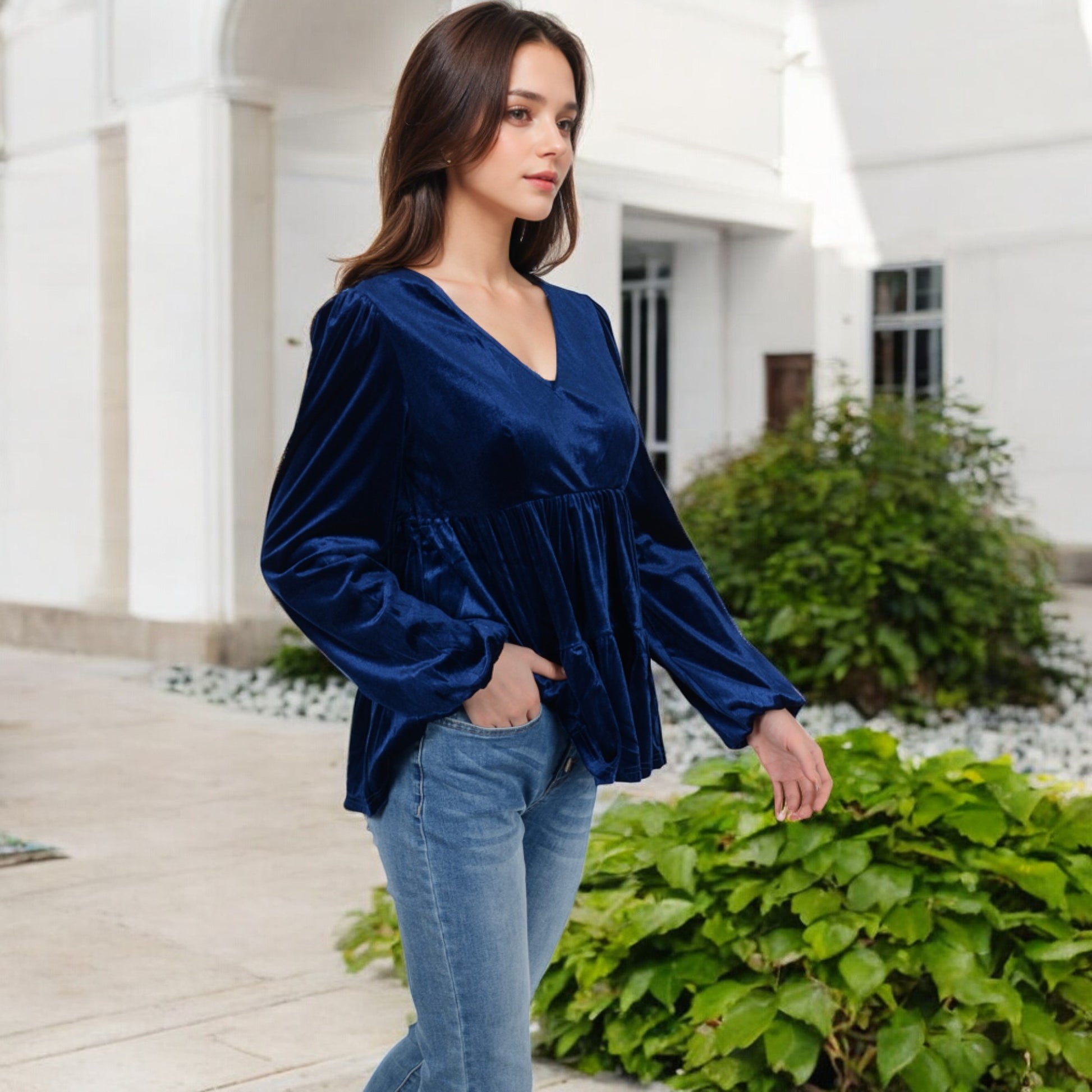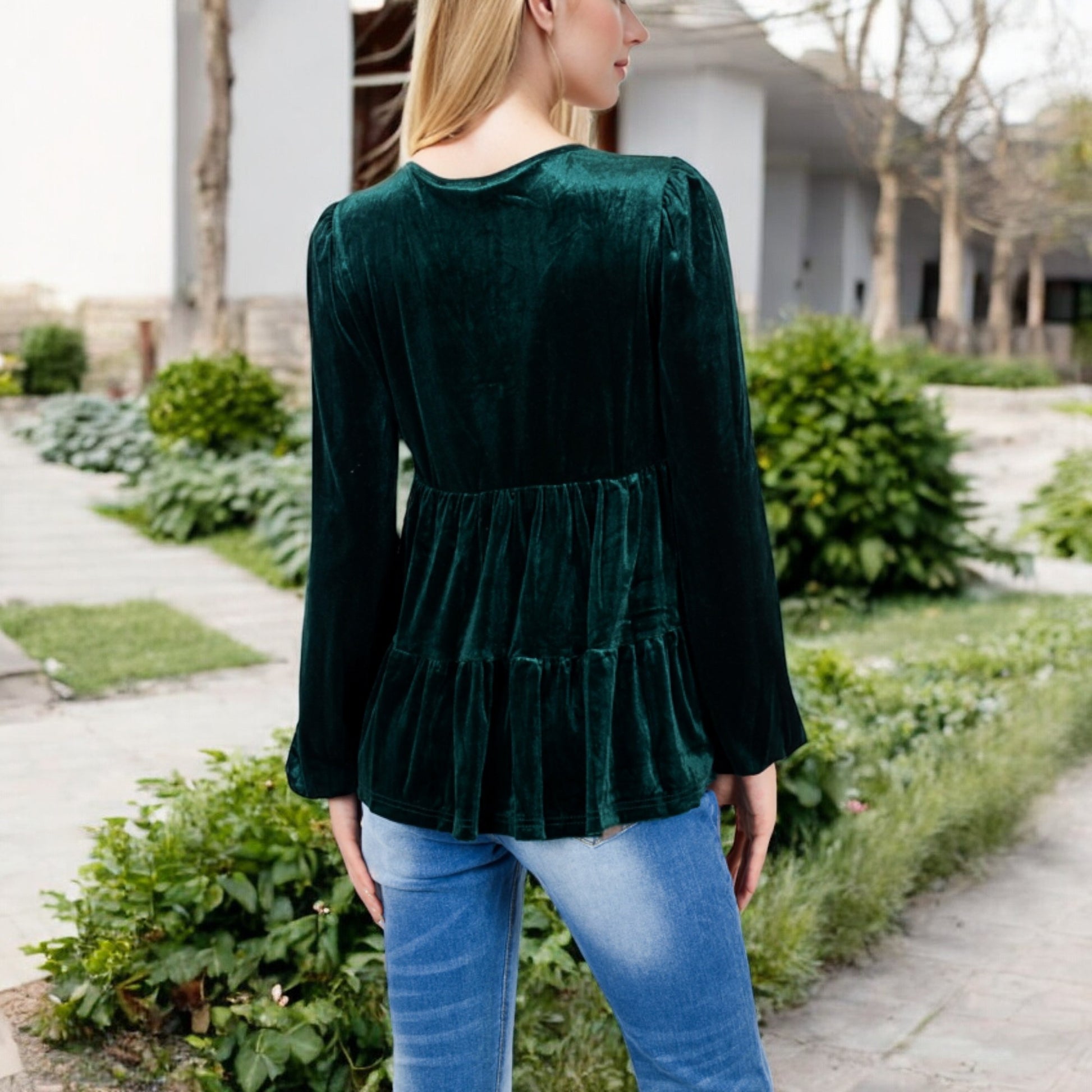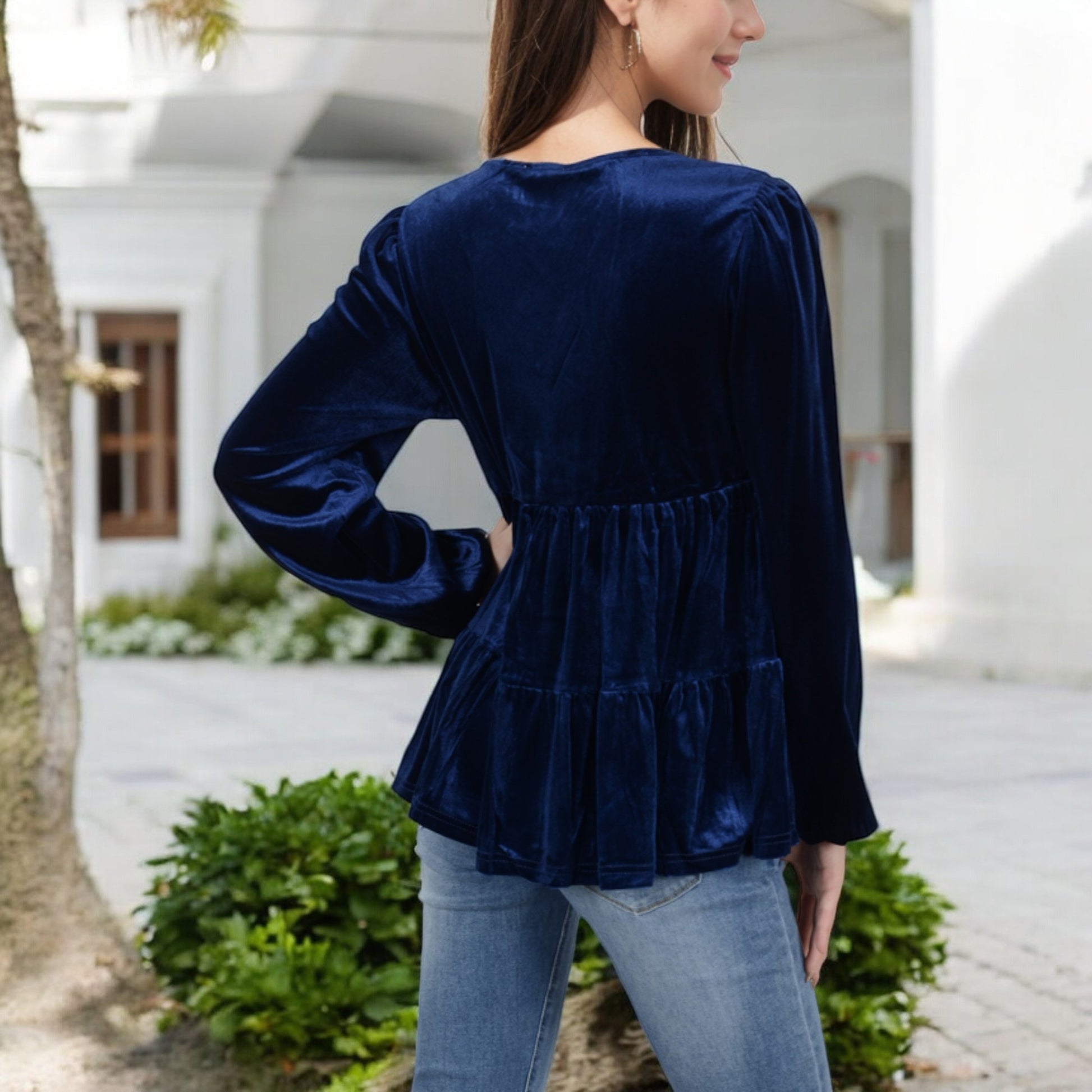Elevate your style with this luxurious velvet babydoll top, featuring a flattering V-neckline and long gathered sleeves. The tiered waist design adds a touch of sophistication, while providing a relaxed, comfortable fit. Perfect for pairing with jeans or skirts, this elegant top transitions effortlessly from day to night. Soft and chic, it's a must-have addition to your wardrobe for any special occasion or casual outing.