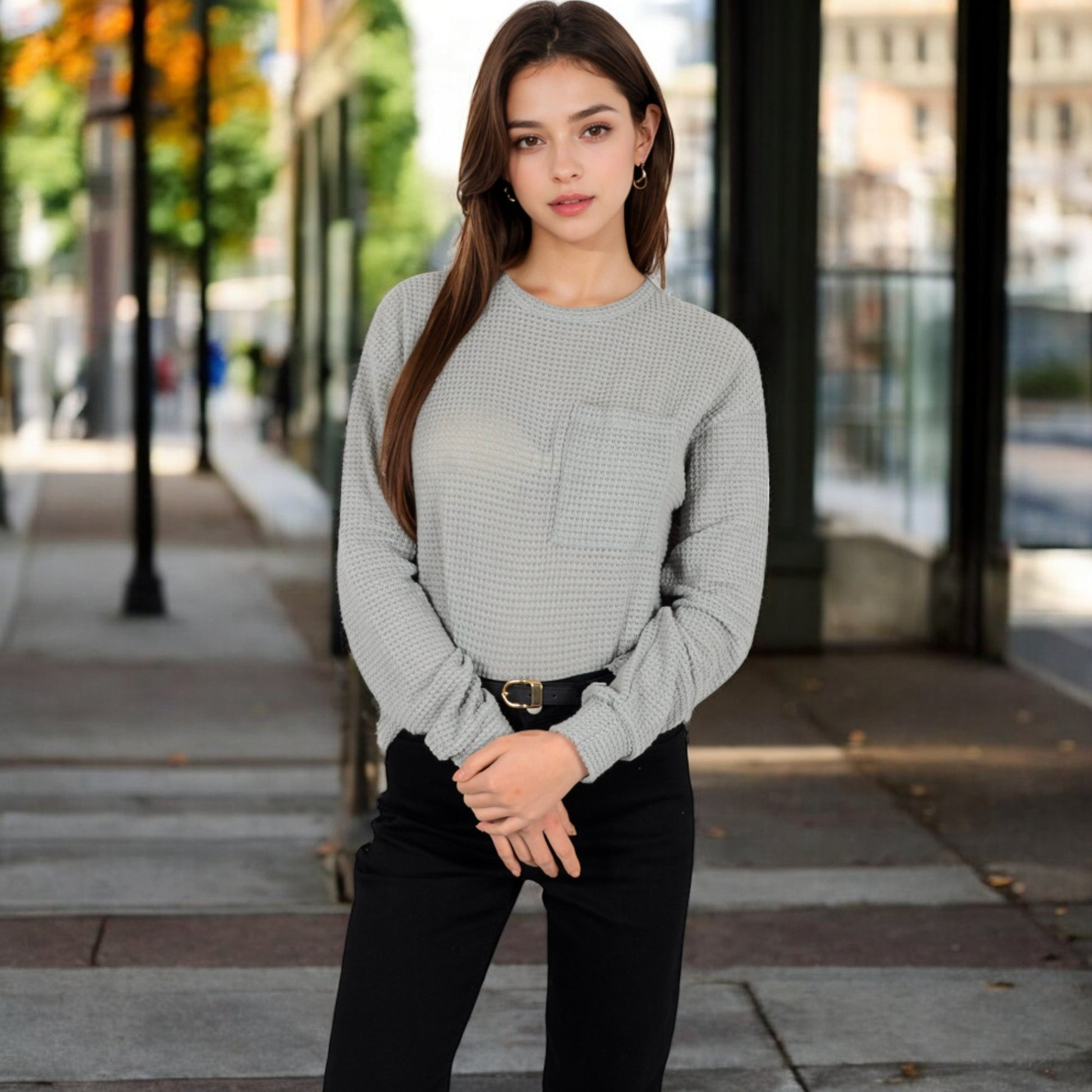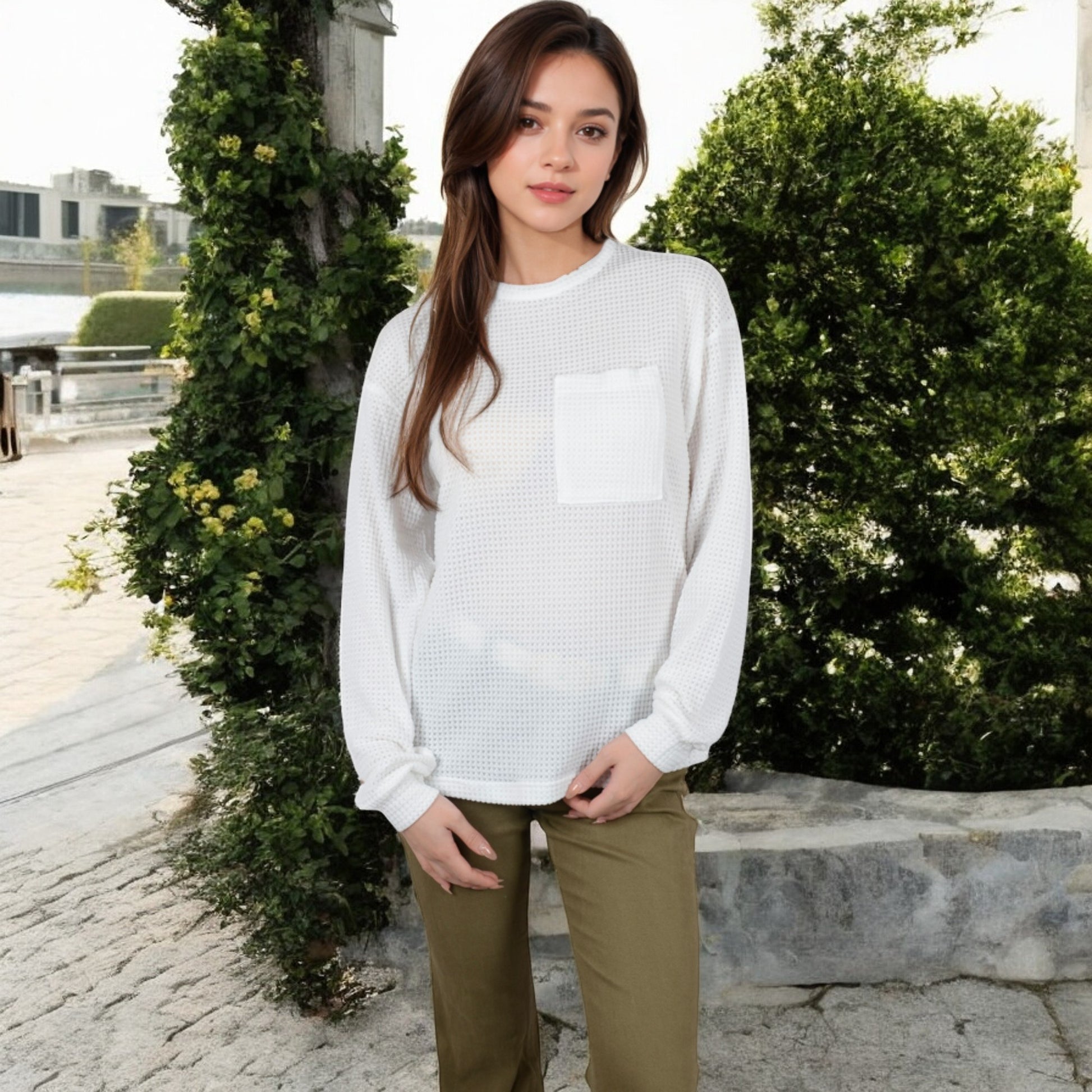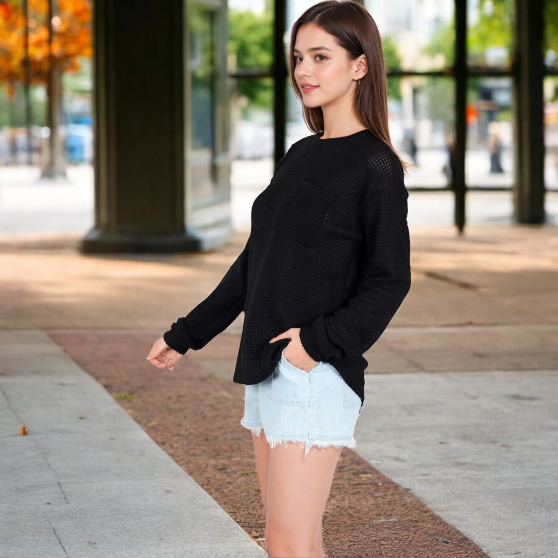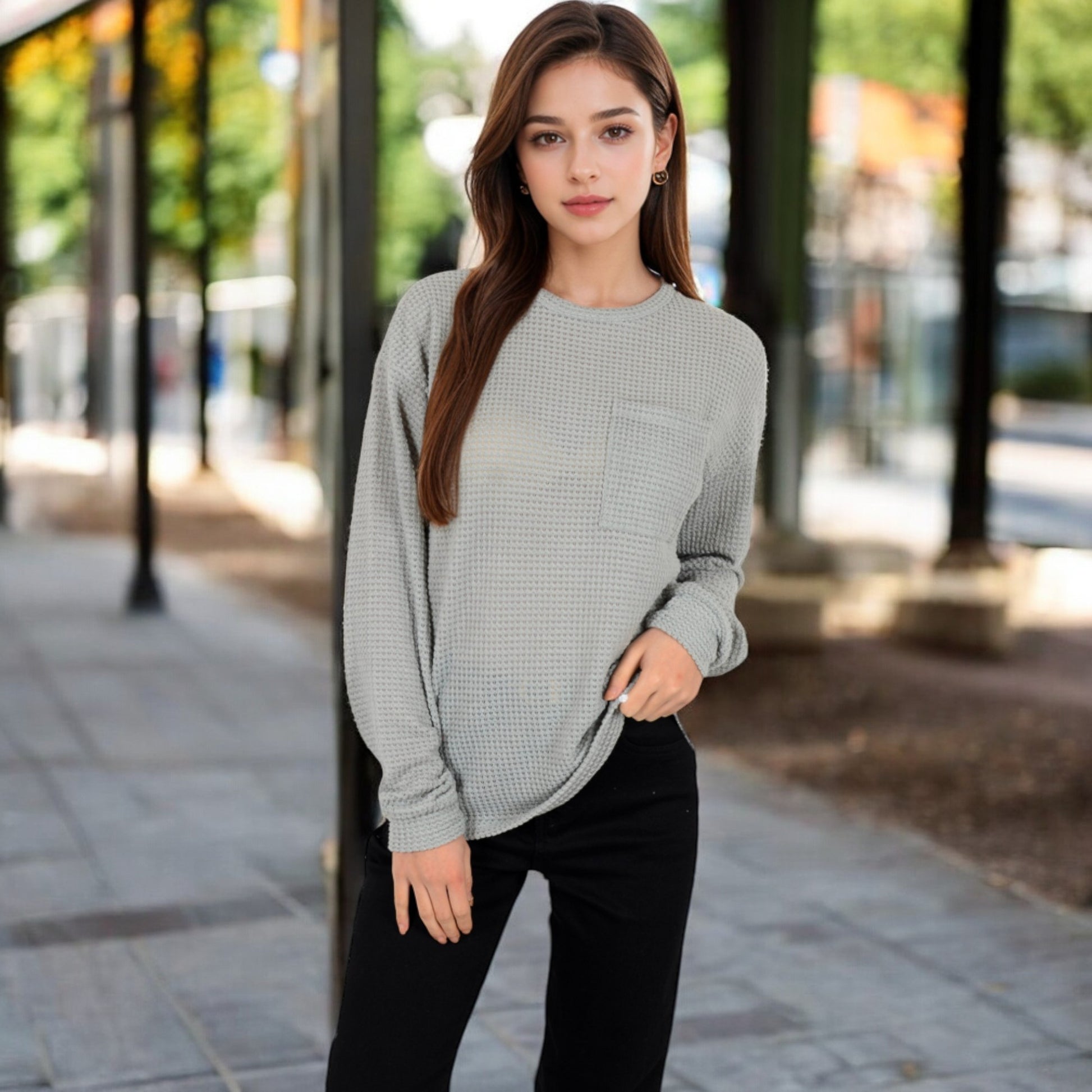 Elevate your casual wardrobe with this long sleeve waffle knit top, featuring a convenient front pocket detail for added style. The textured fabric offers a cozy, lightweight feel, perfect for layering or wearing on its own. Its relaxed fit and rounded hemline provide comfort and versatility for everyday wear. Pair it with jeans or leggings for a laid-back yet polished look.