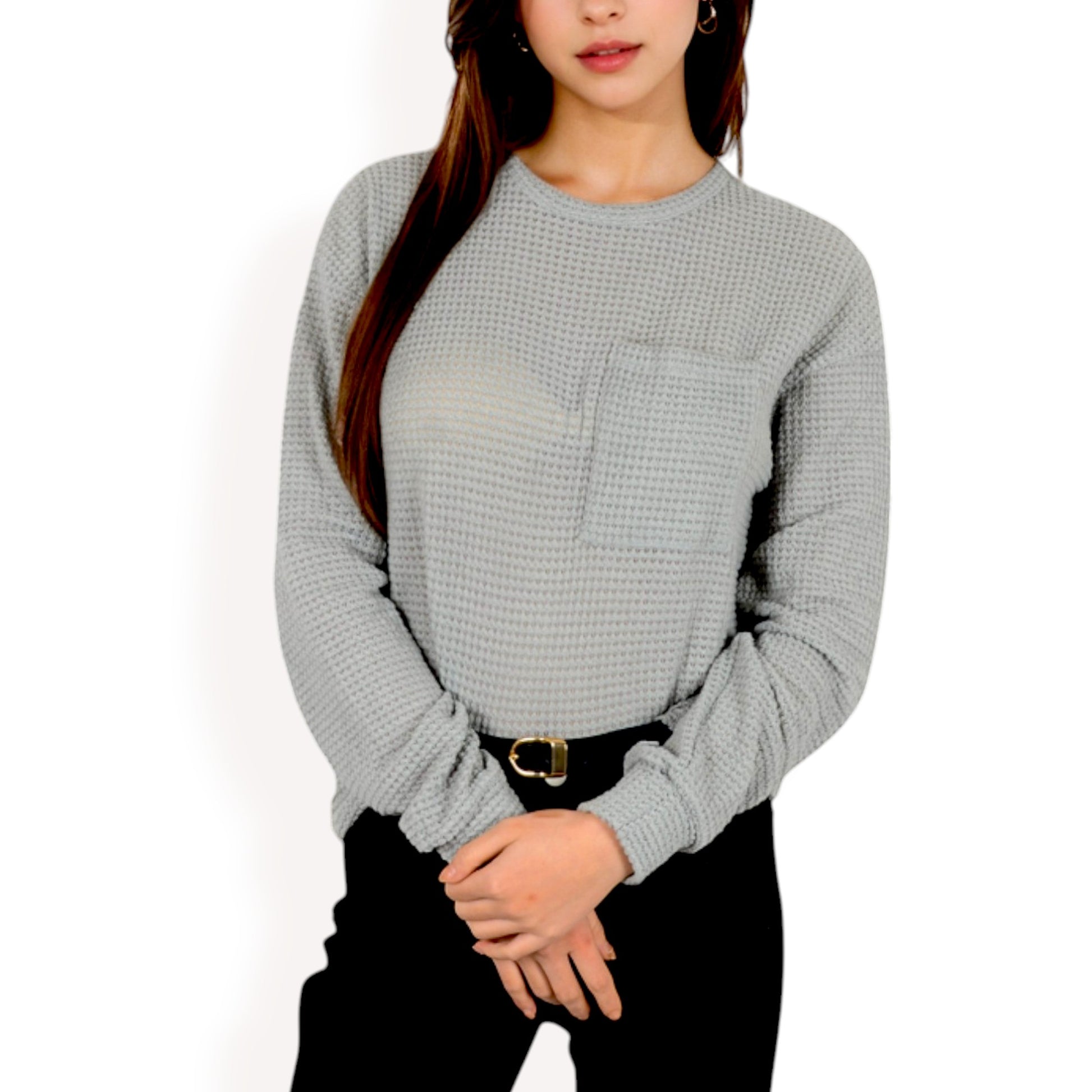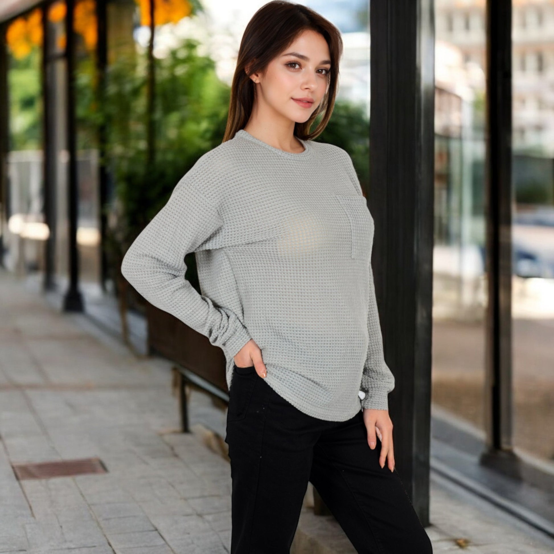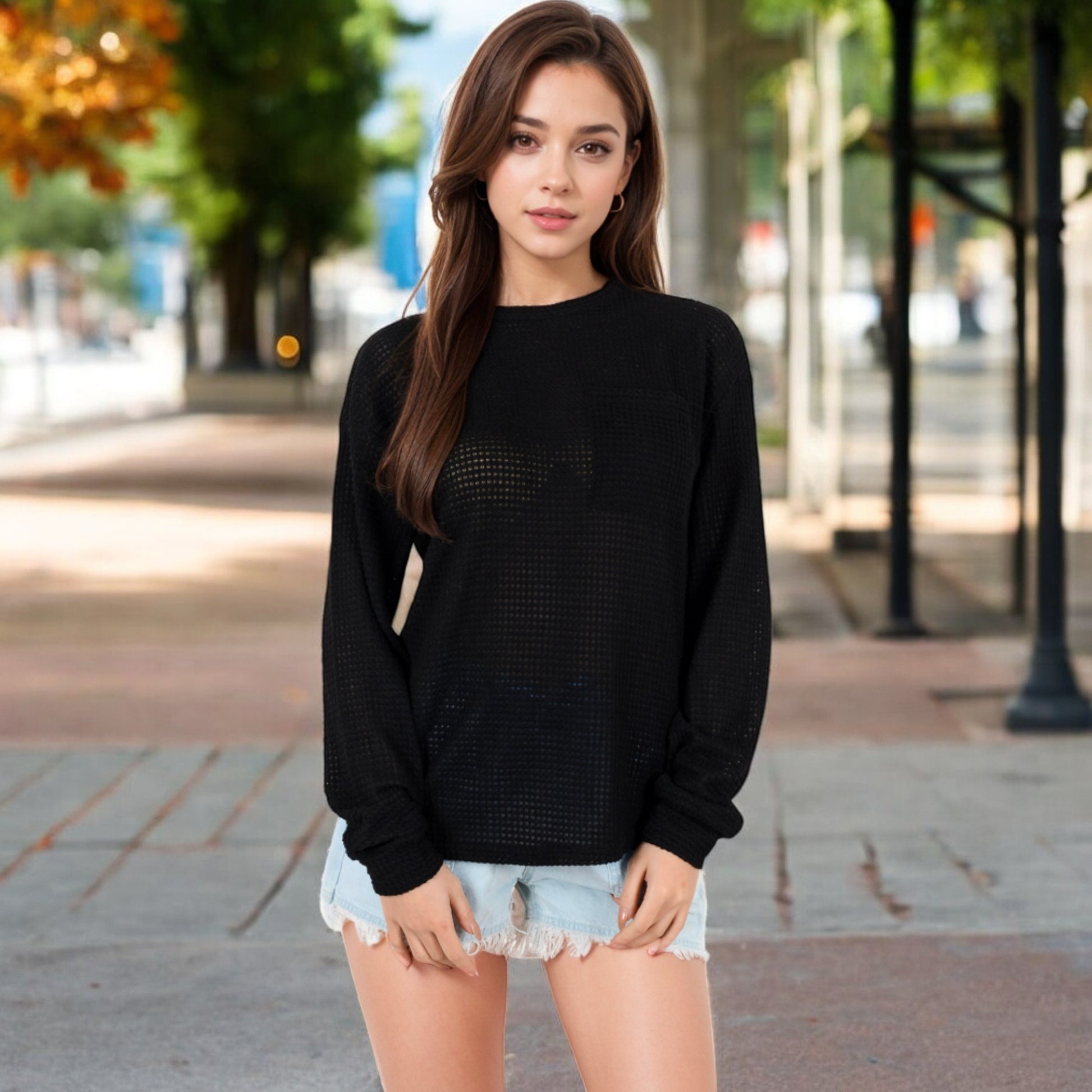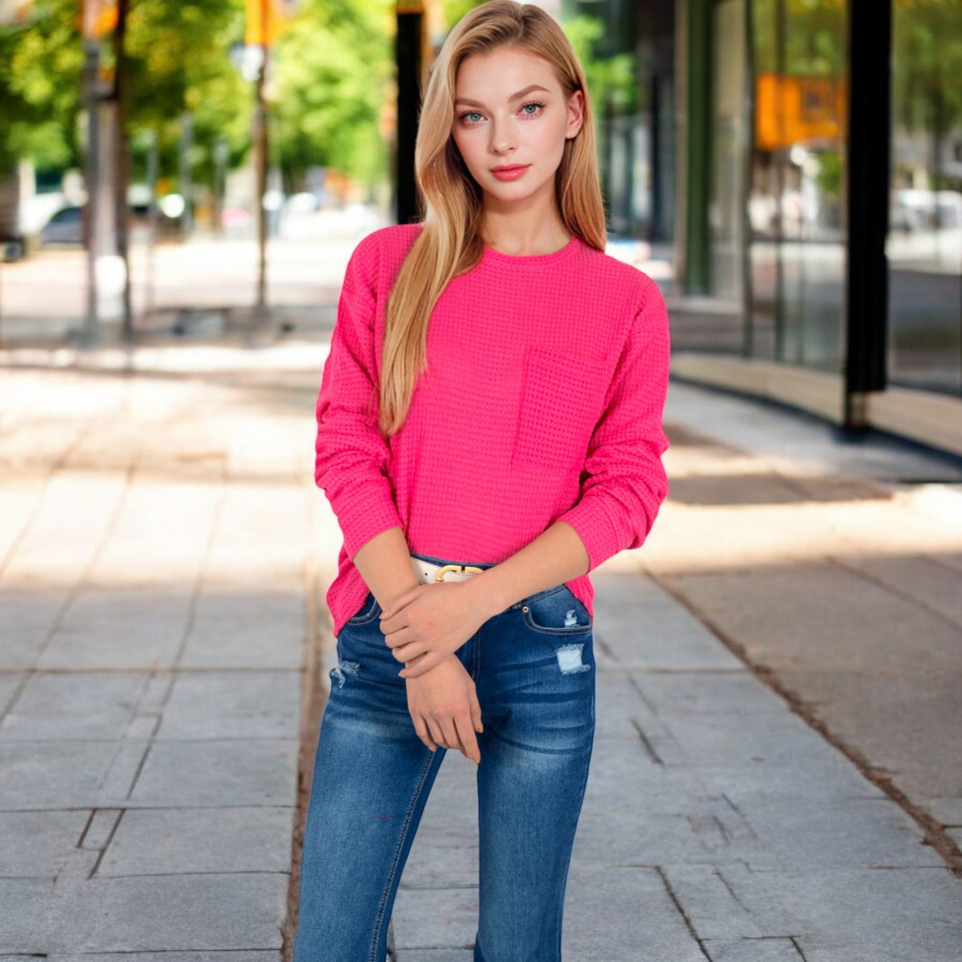 Elevate your casual wardrobe with this long sleeve waffle knit top, featuring a convenient front pocket detail for added style. The textured fabric offers a cozy, lightweight feel, perfect for layering or wearing on its own. Its relaxed fit and rounded hemline provide comfort and versatility for everyday wear. Pair it with jeans or leggings for a laid-back yet polished look.