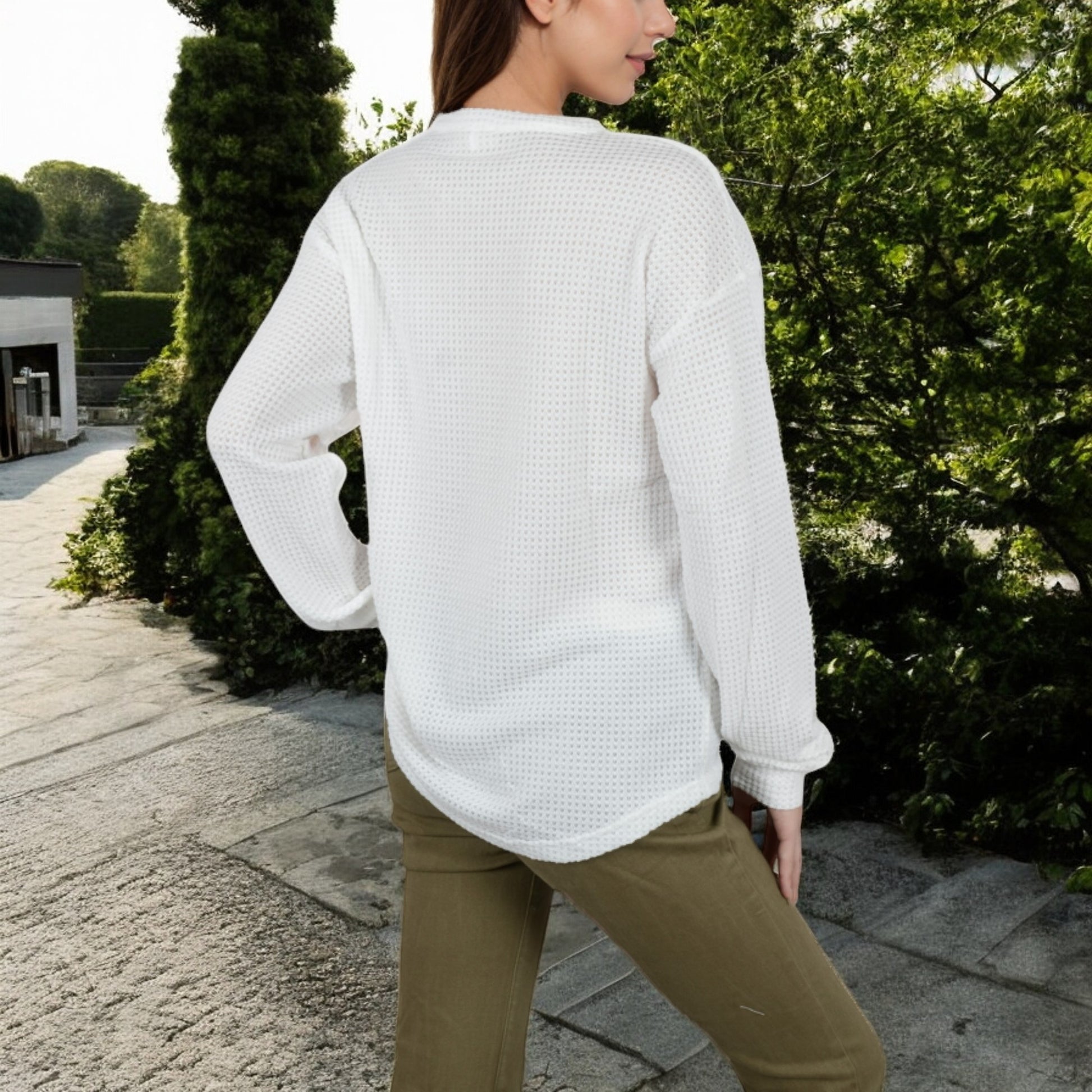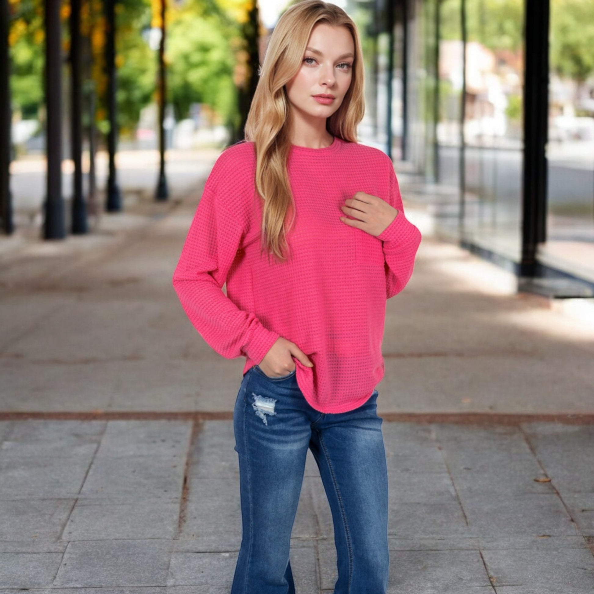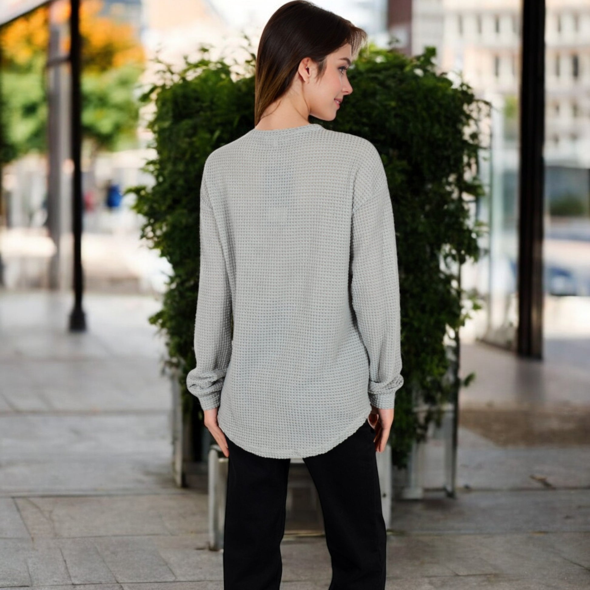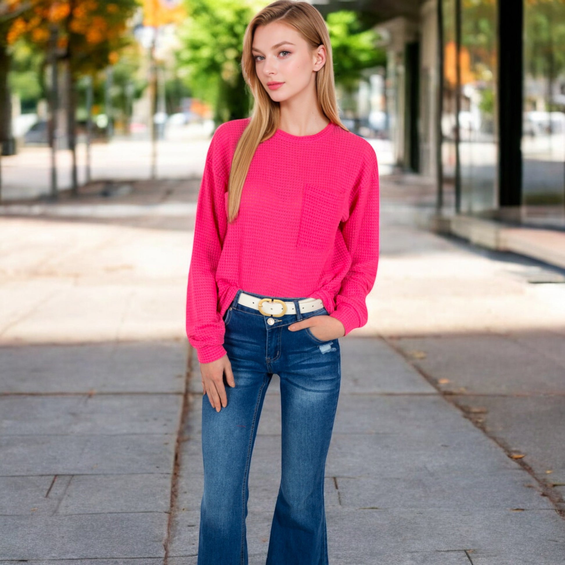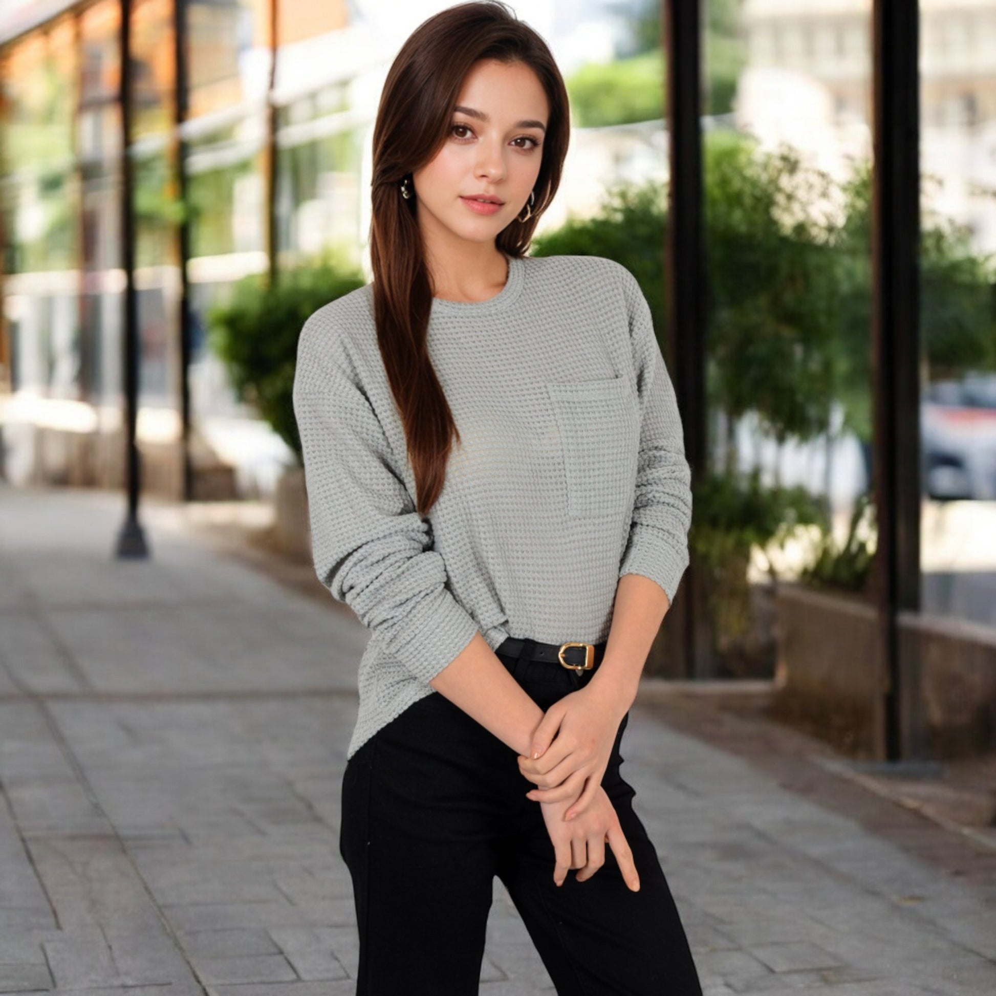 Elevate your casual wardrobe with this long sleeve waffle knit top, featuring a convenient front pocket detail for added style. The textured fabric offers a cozy, lightweight feel, perfect for layering or wearing on its own. Its relaxed fit and rounded hemline provide comfort and versatility for everyday wear. Pair it with jeans or leggings for a laid-back yet polished look.