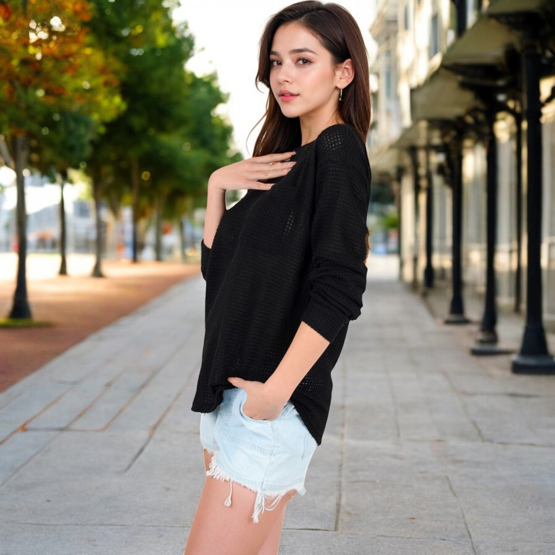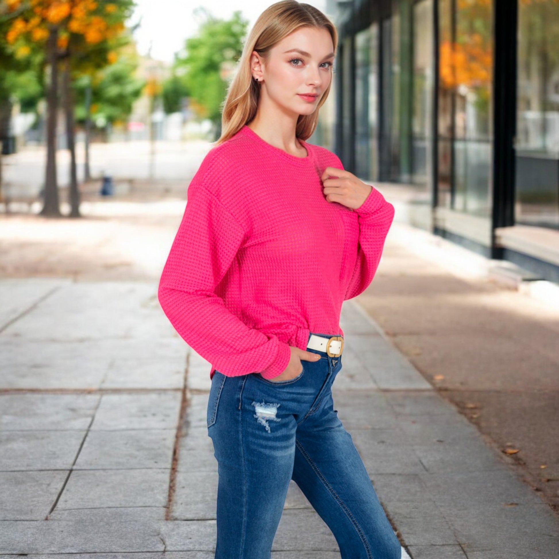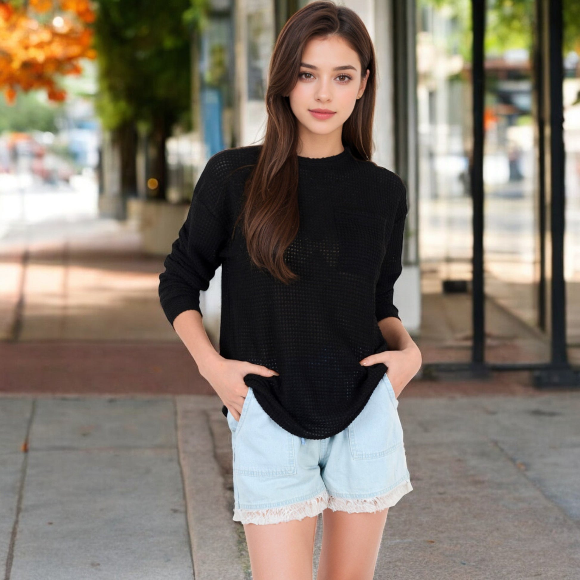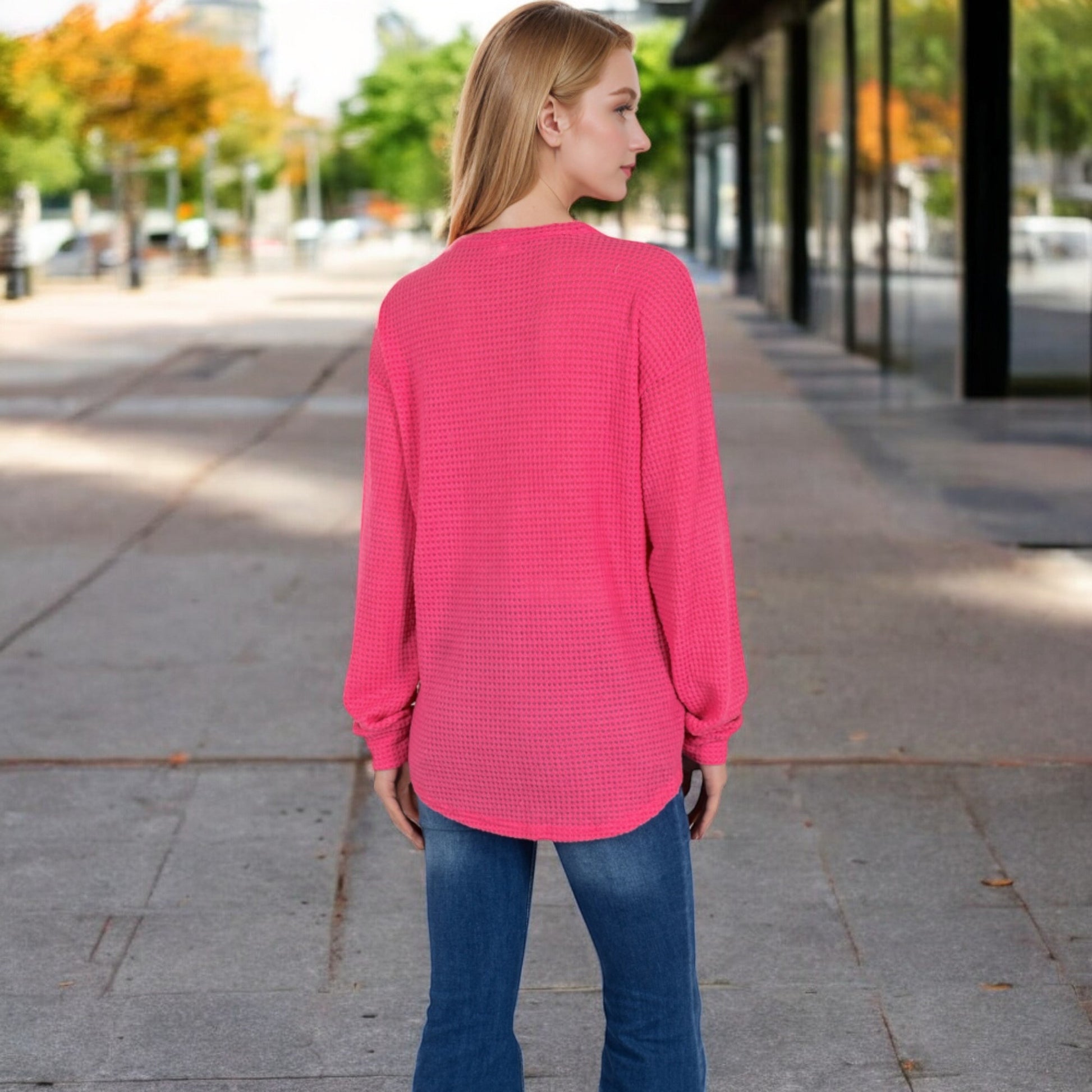 Elevate your casual wardrobe with this long sleeve waffle knit top, featuring a convenient front pocket detail for added style. The textured fabric offers a cozy, lightweight feel, perfect for layering or wearing on its own. Its relaxed fit and rounded hemline provide comfort and versatility for everyday wear. Pair it with jeans or leggings for a laid-back yet polished look.