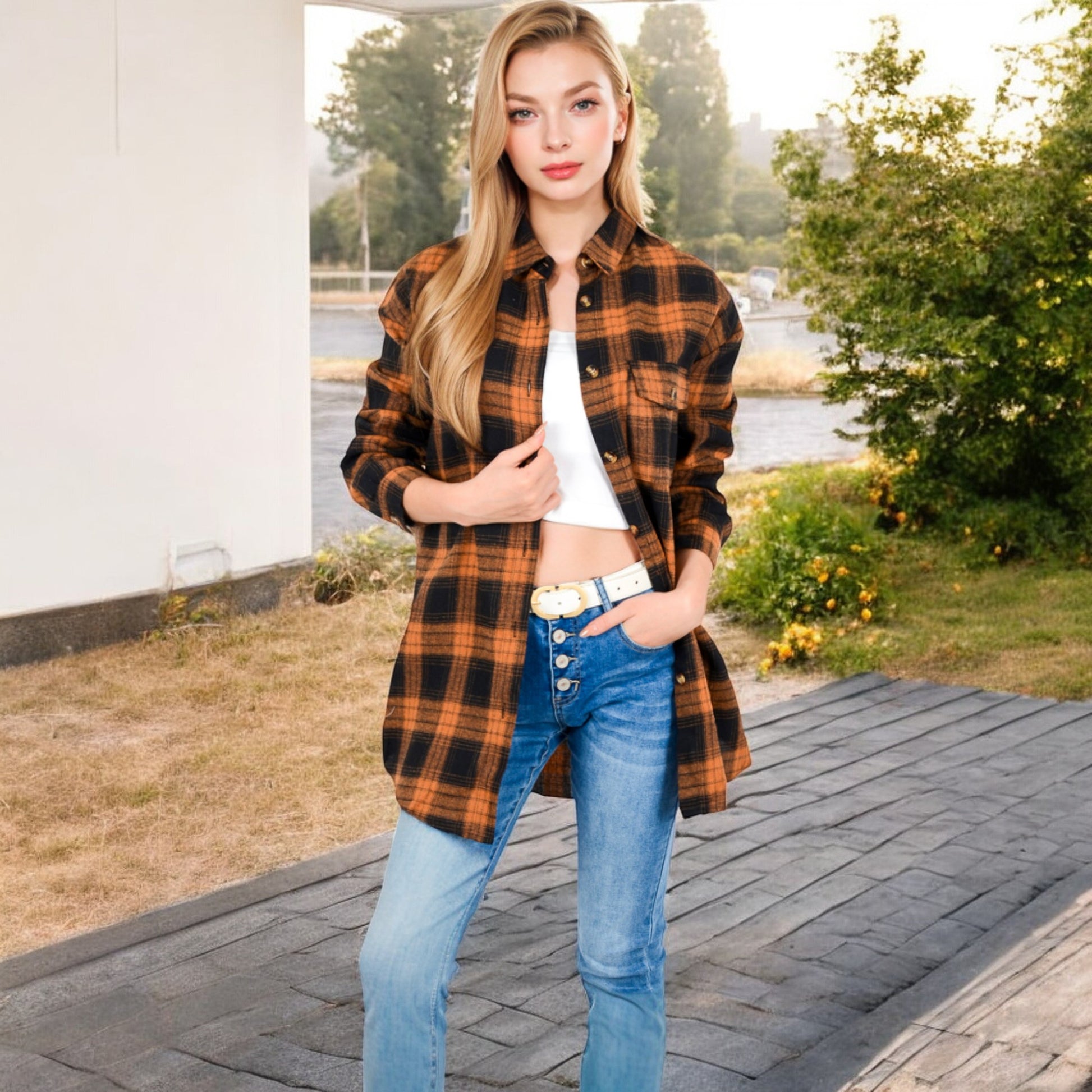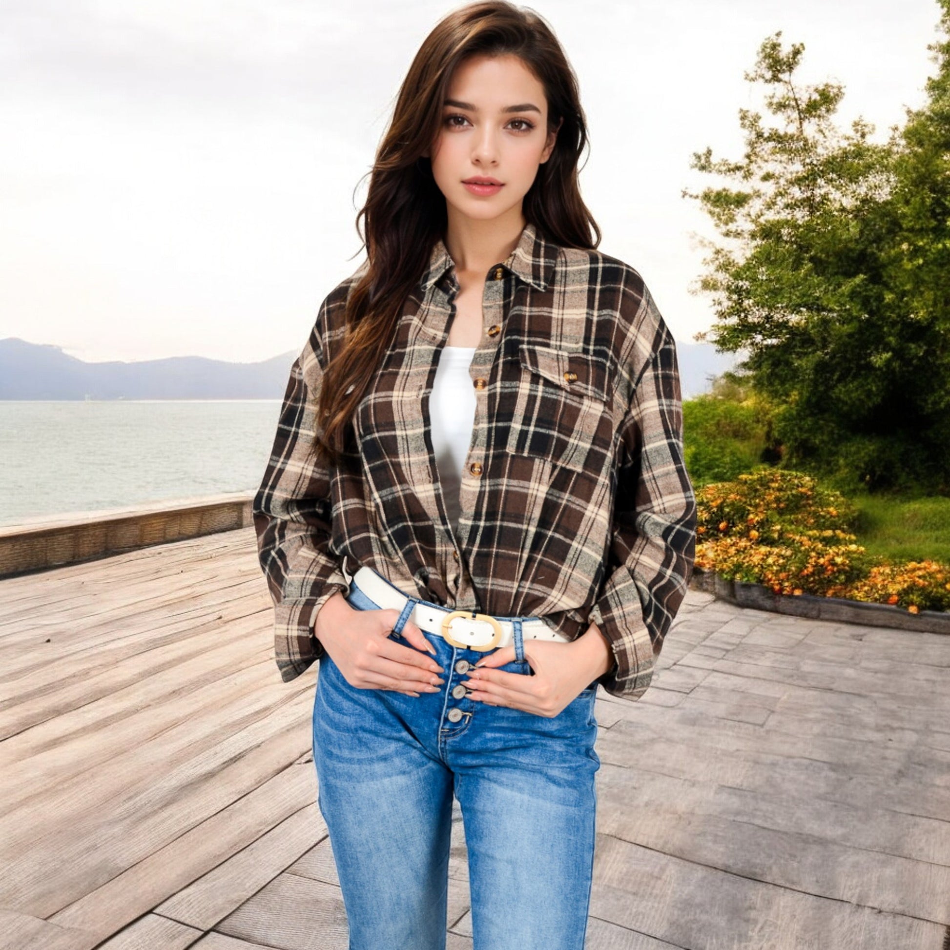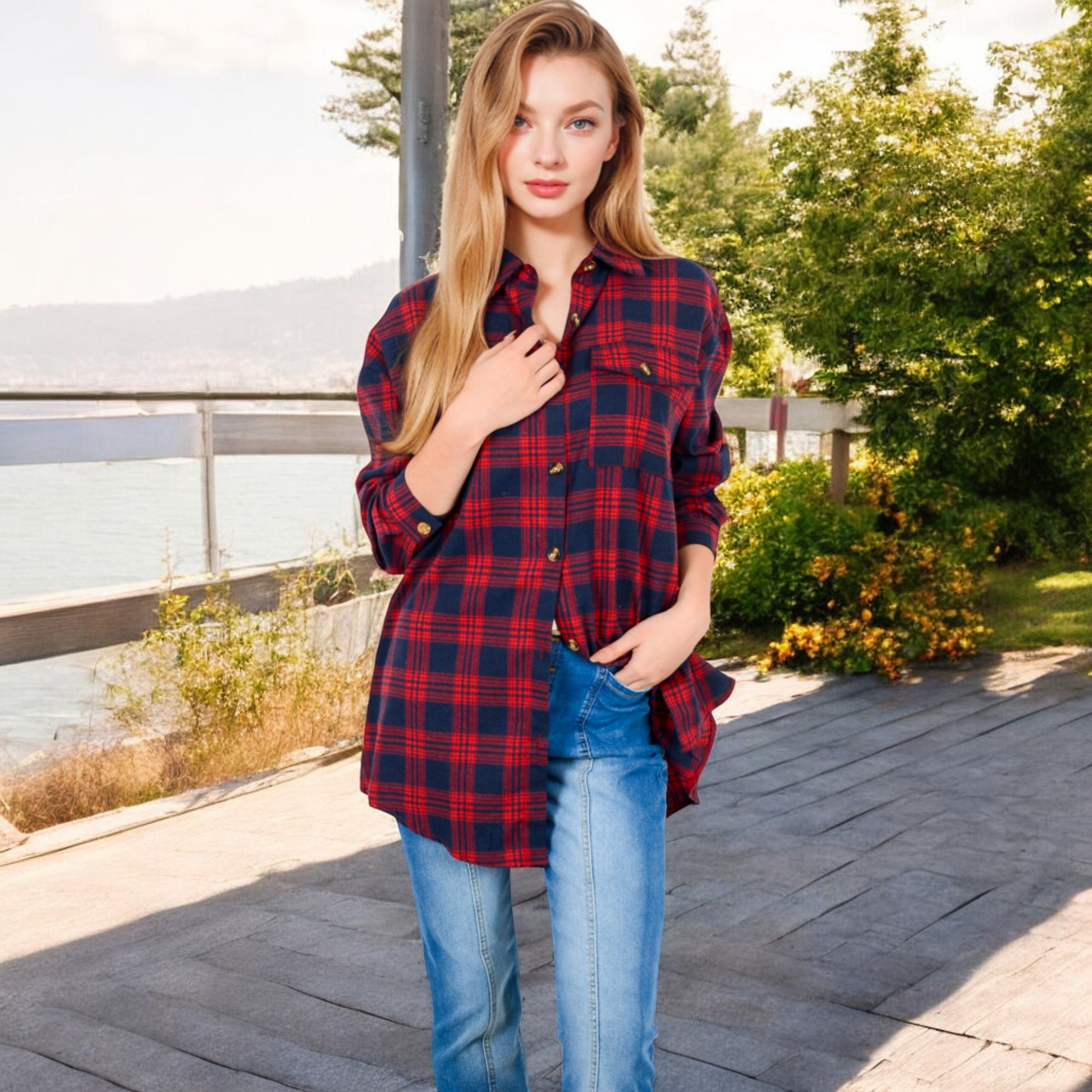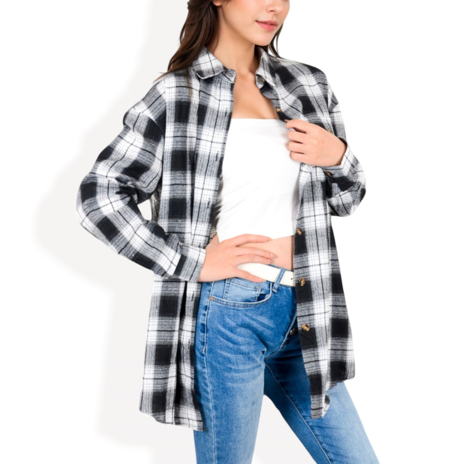 Anna-Kaci Women's Long Sleeve Plaid Button-Up Shirt Jacket with Collared Neckline