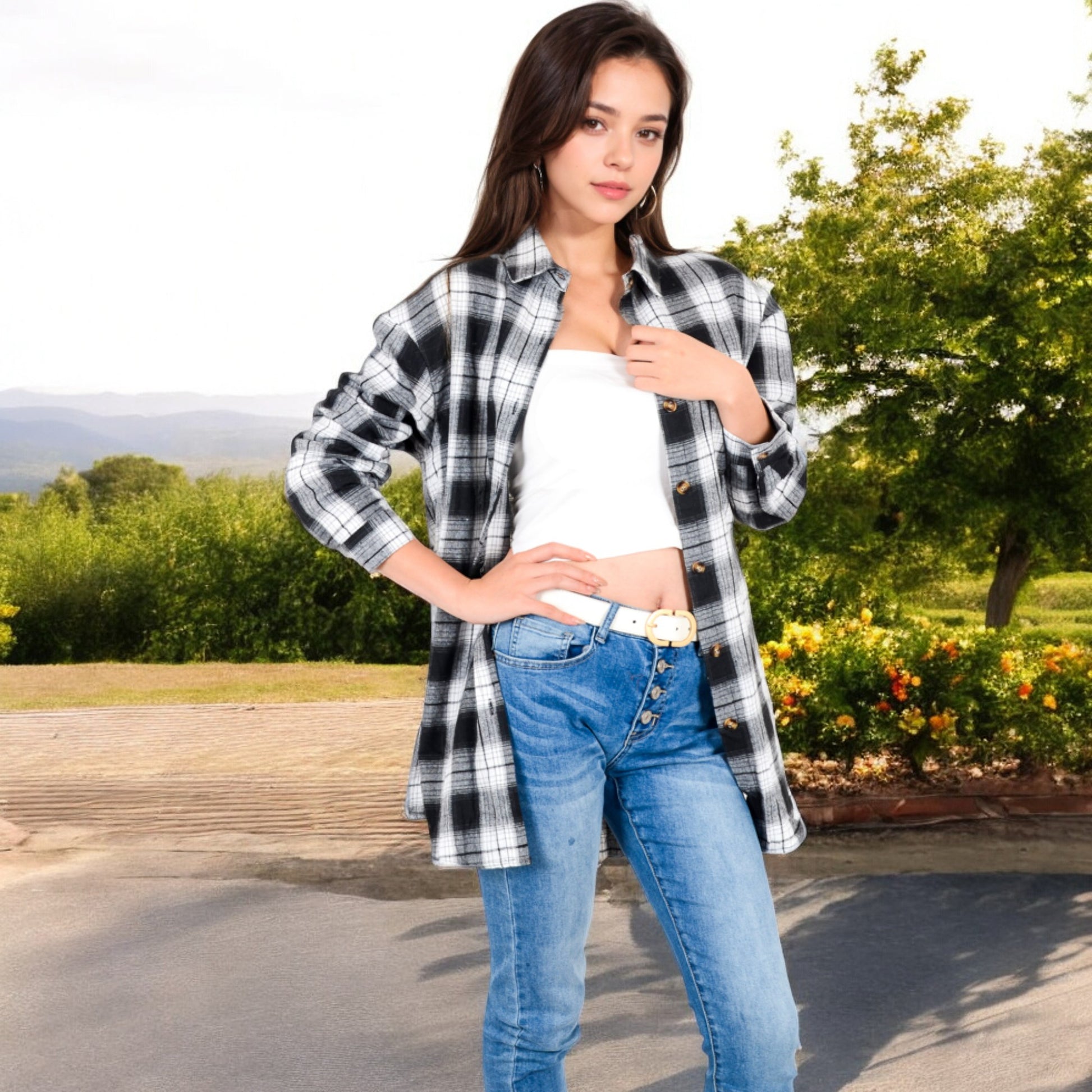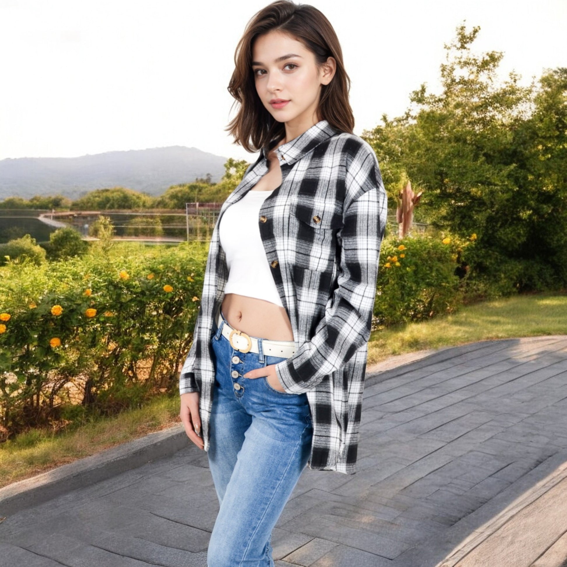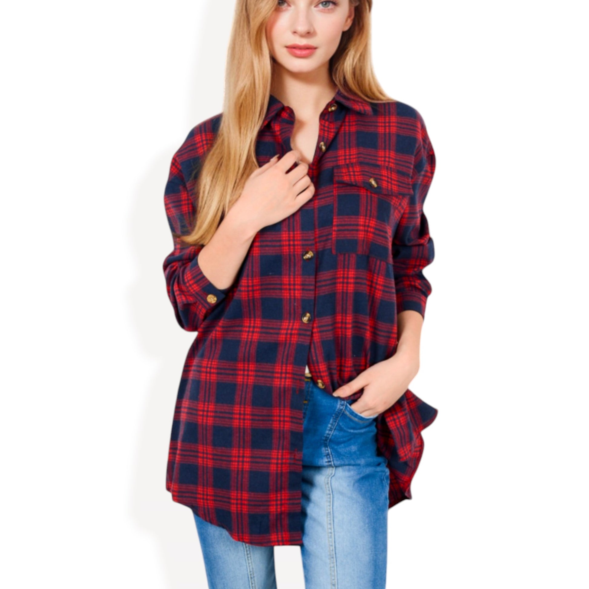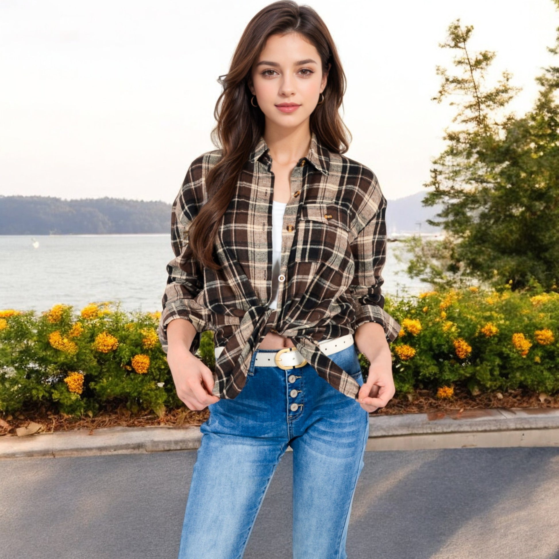 Anna-Kaci Women's Long Sleeve Plaid Button-Up Shirt Jacket with Collared Neckline