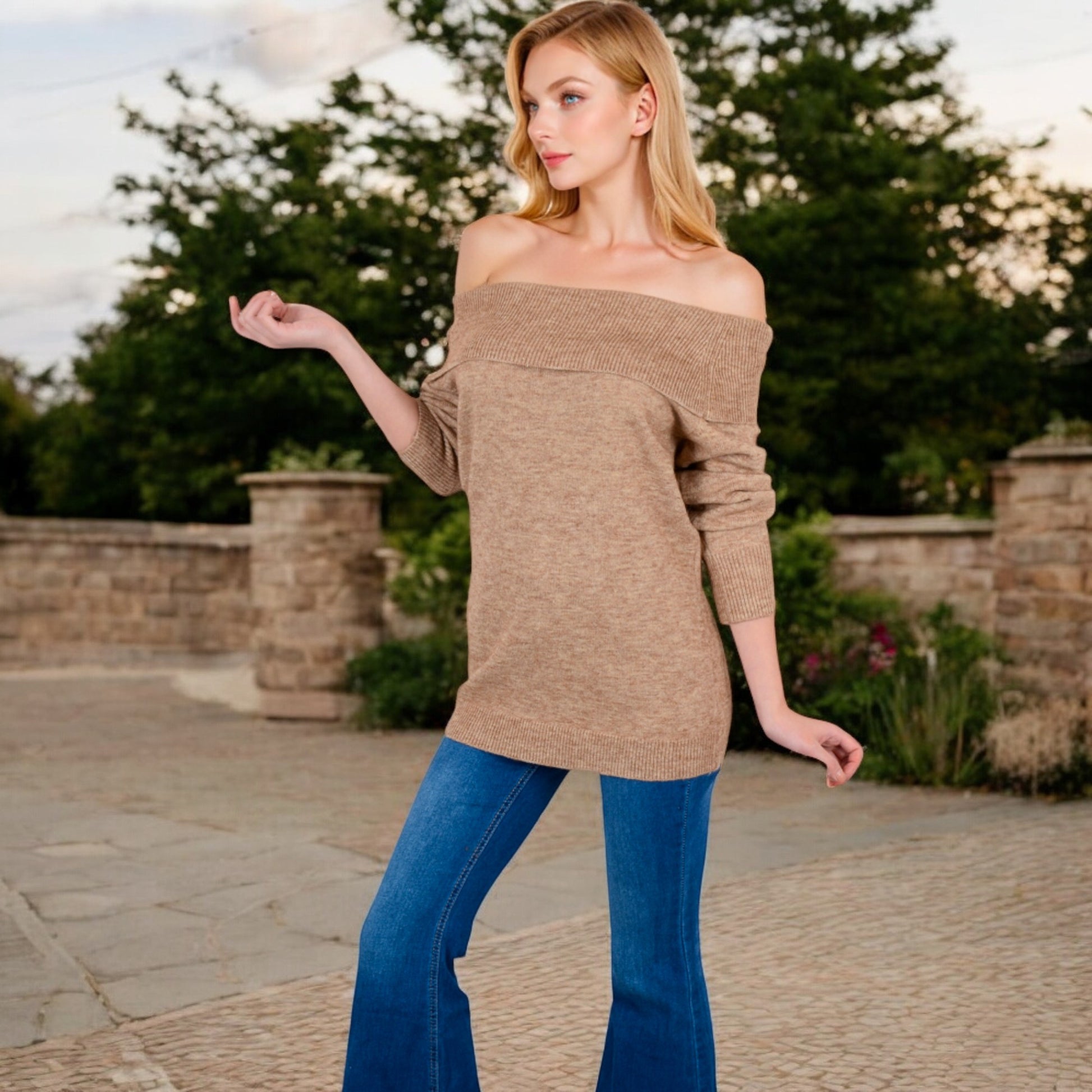 This off-shoulder ribbed knit sweater combines elegance and comfort with its sleek neckline and soft fabric. Designed for versatility, it features long sleeves that add a chic touch to your outfit while keeping you warm. Perfect for pairing with jeans or skirts, it effortlessly elevates your casual or evening style. Embrace a sophisticated look with this cozy wardrobe staple.