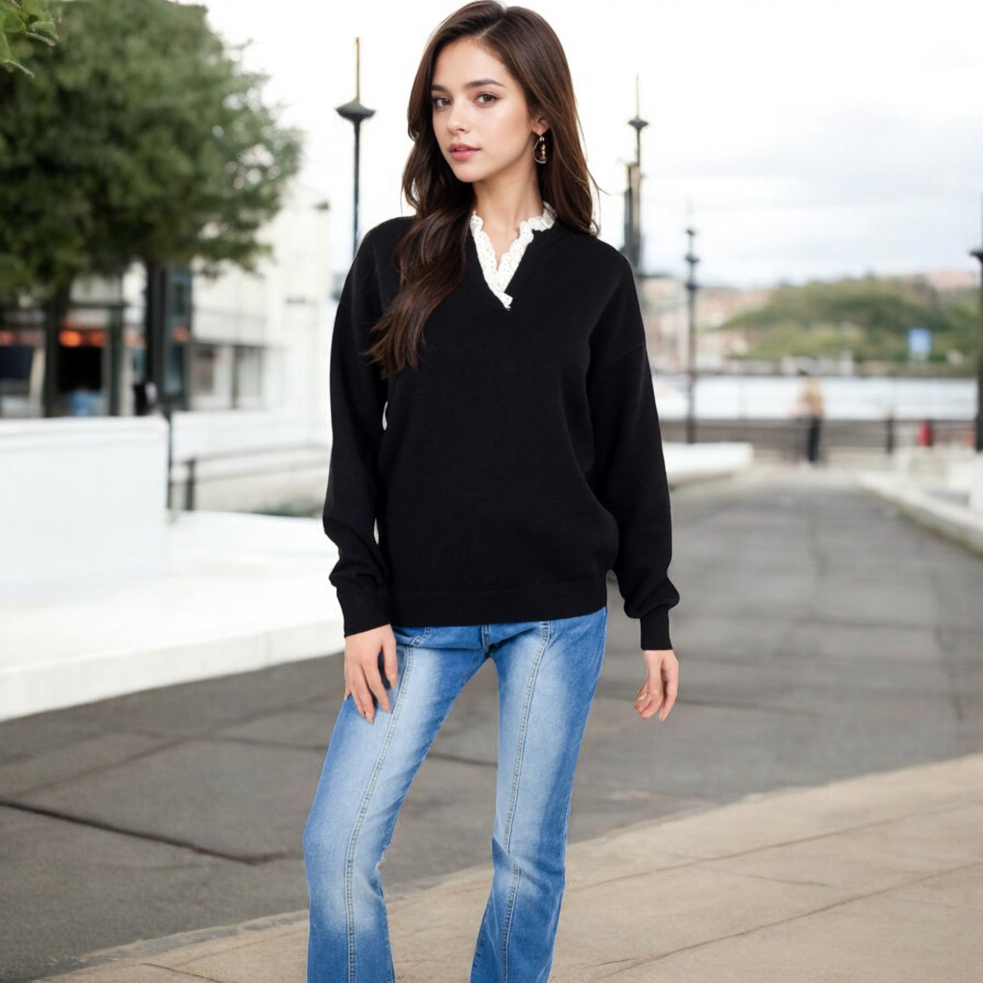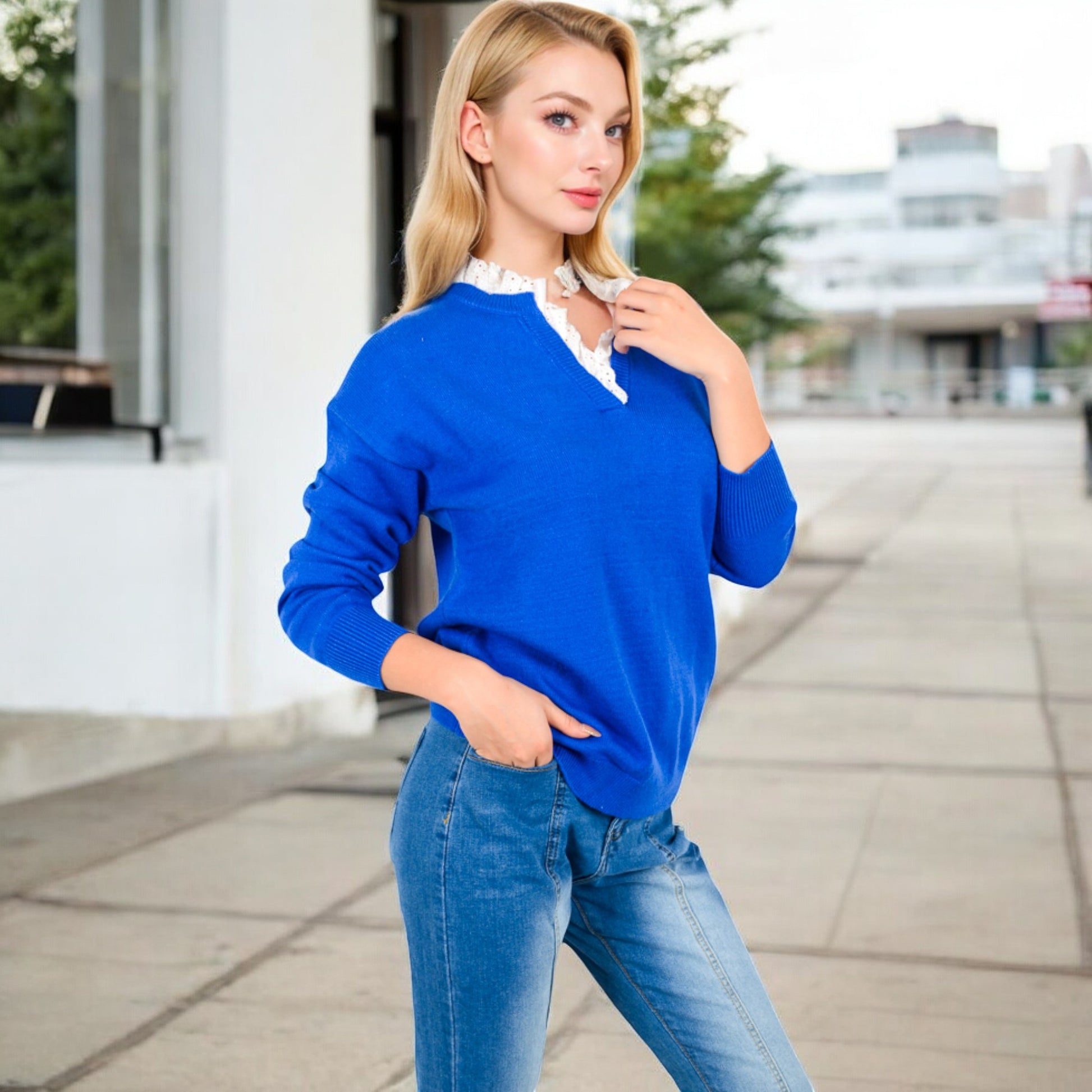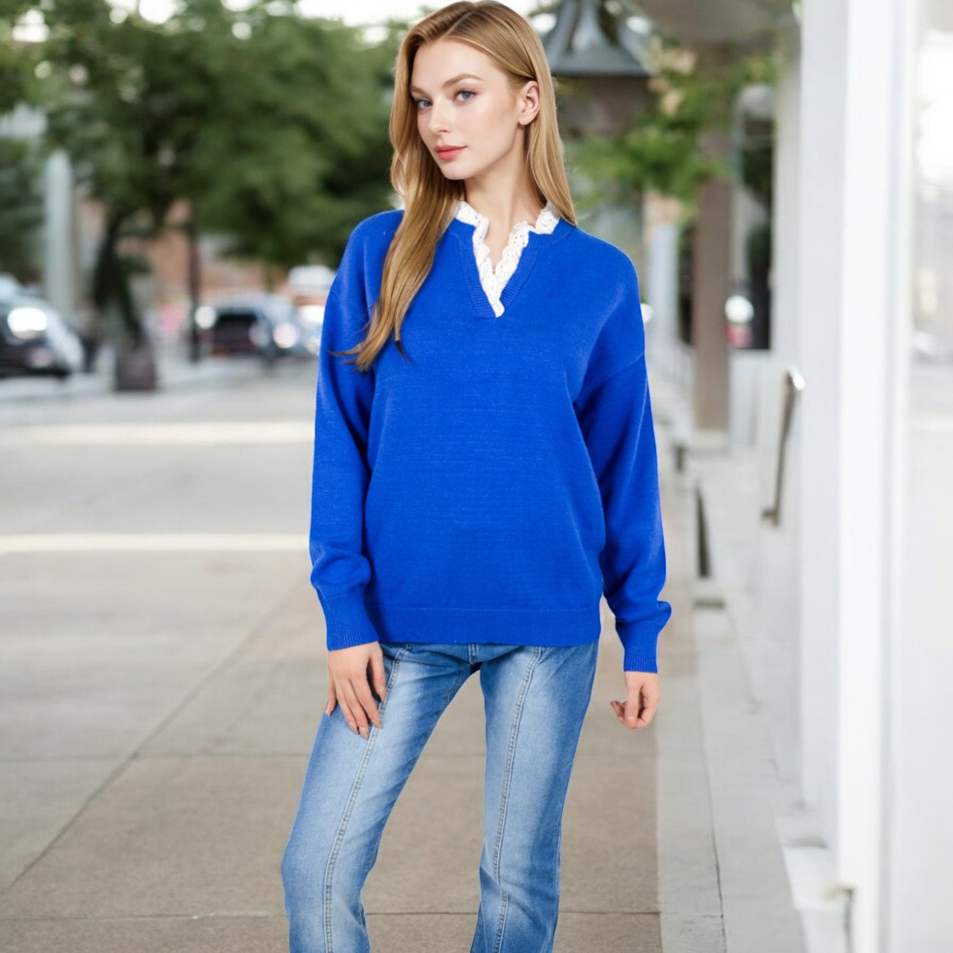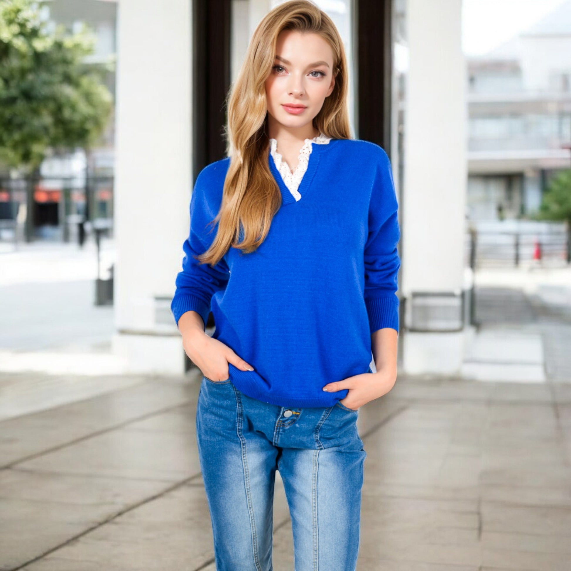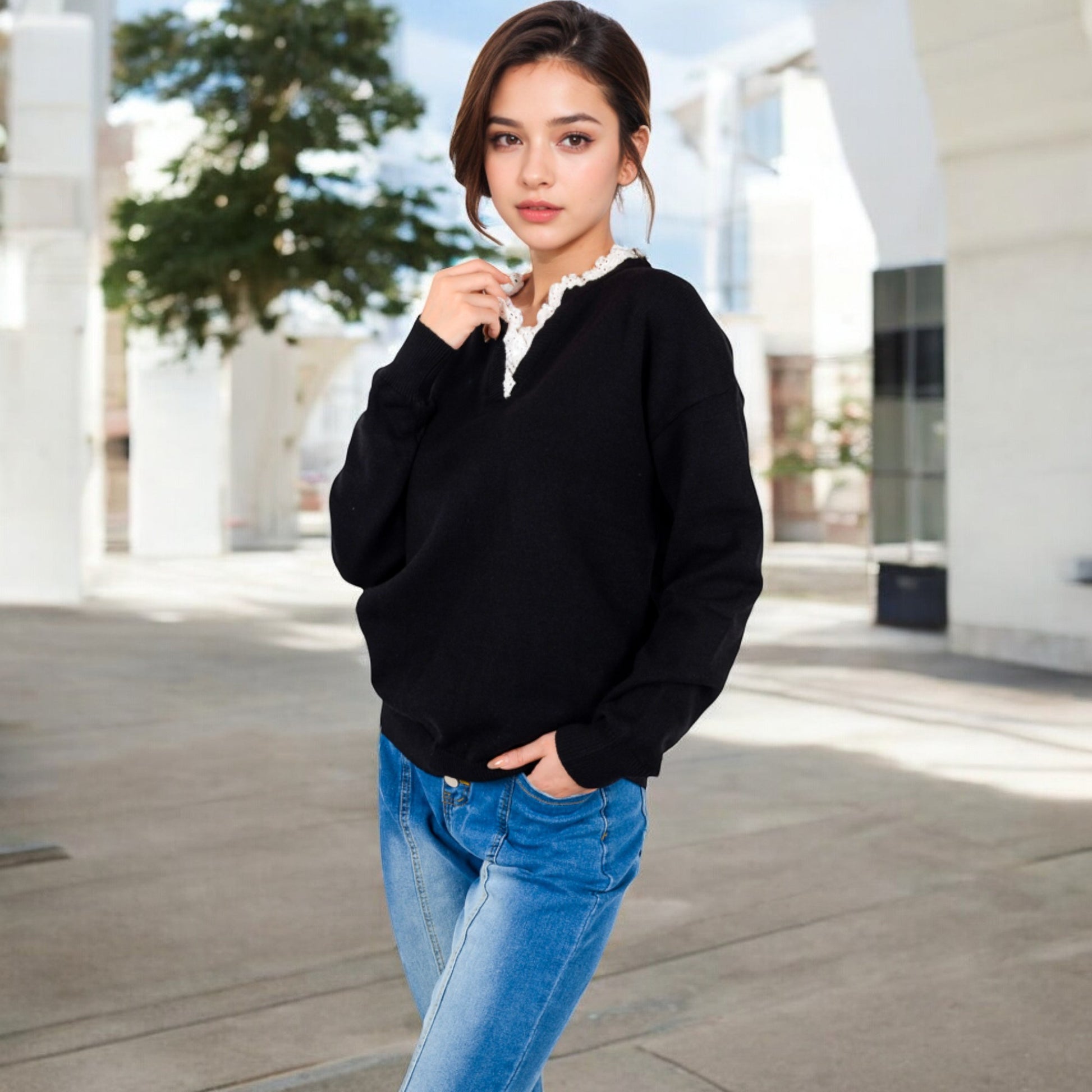 This long sleeve sweater exudes feminine charm with its delicate lace trim adorning the V-neckline. The soft knit fabric ensures a cozy fit, perfect for layering or wearing on its own. With a timeless silhouette, this sweater pairs beautifully with jeans, skirts, or trousers for both casual and dressy occasions. Elevate your wardrobe with this versatile and chic staple.