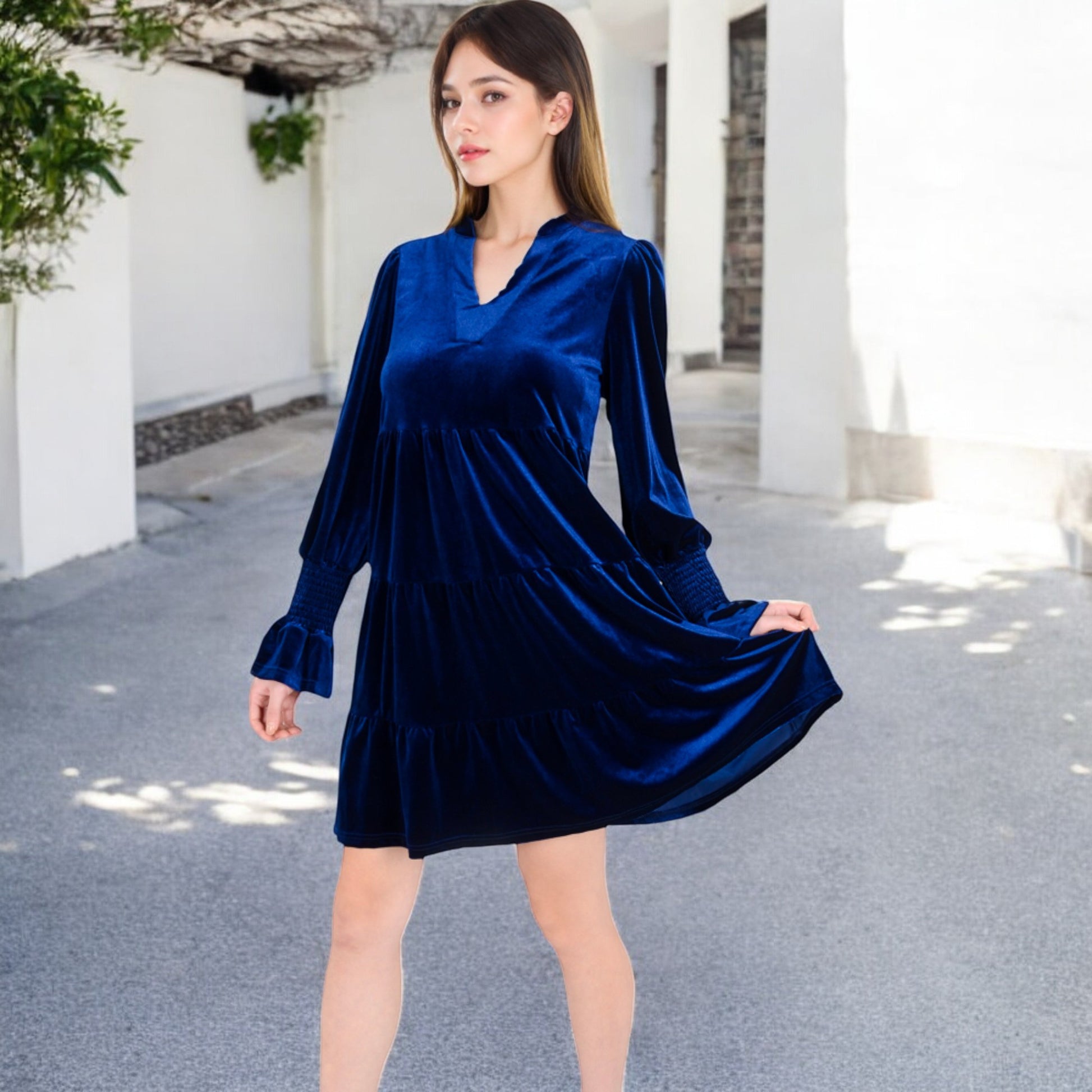 The Anna-Kaci Women's tiered A-line dress offers effortless elegance with its flowy silhouette and soft, velvety texture. Designed with long sleeves and smocked cuffs, this dress features tiered panels for added volume and movement. The subtle V-neckline creates a flattering touch, making this dress both chic and versatile. Pair it with your favorite boots or heels for a polished, sophisticated look that transitions effortlessly through seasons.
