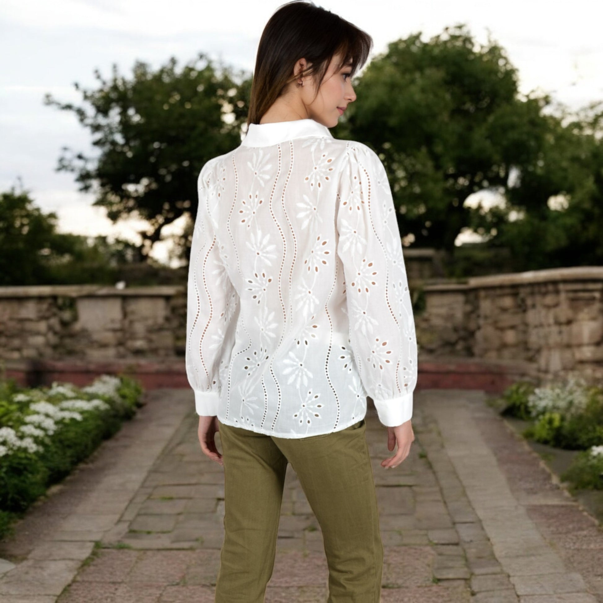Anna-Kaci Women's Embroidered Eyelet Long Sleeve Button-Up Blouse combines classic elegance with delicate details. The intricate eyelet embroidery adds a feminine touch, while the tailored collar and button-up front create a polished look. Made from lightweight and breathable fabric, this blouse ensures all-day comfort. Perfect for pairing with jeans or skirts, it transitions effortlessly from casual outings to sophisticated occasions.