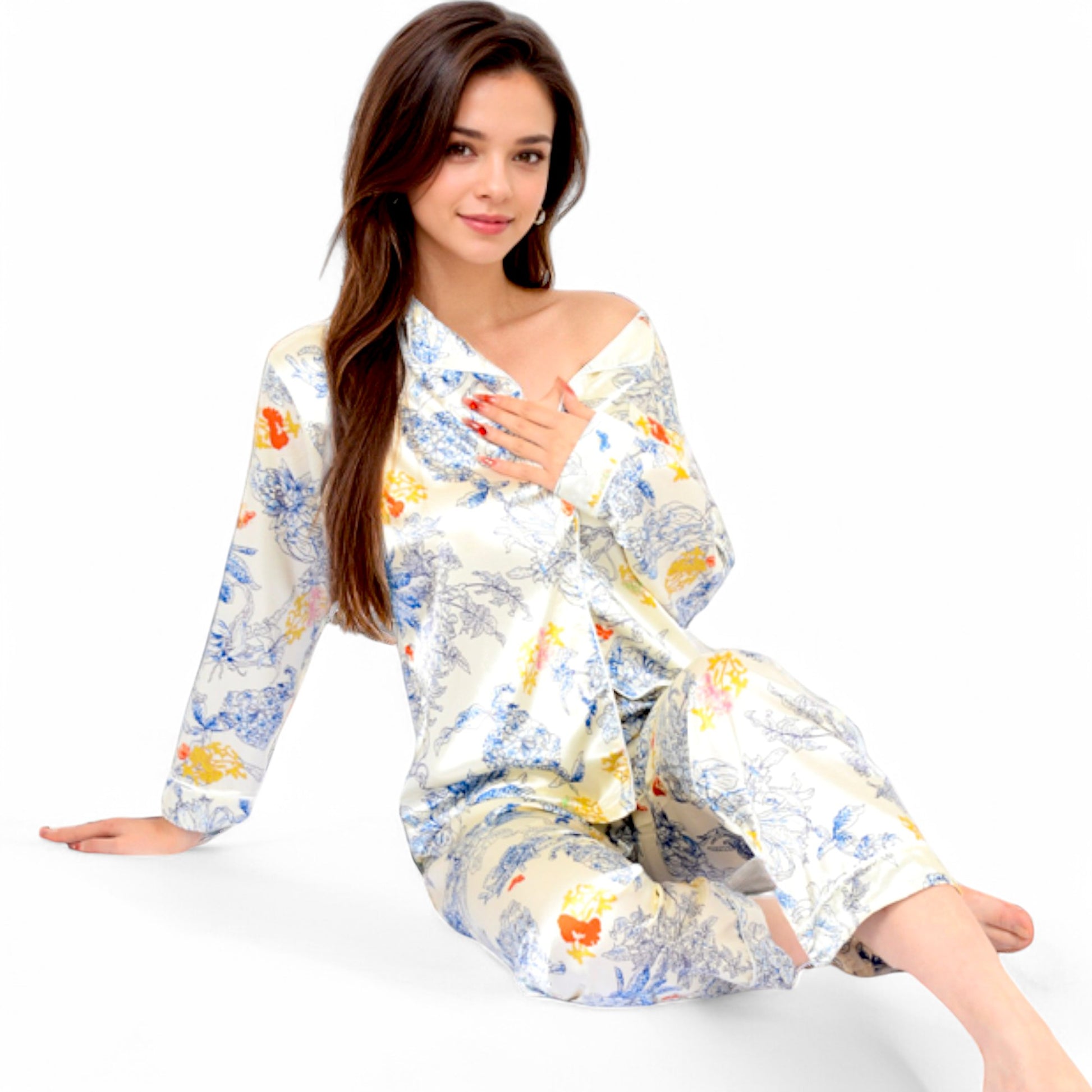 Anna-Kaci Women's Botanical Print Satin Pajama Set with Button-Up Top and Long Pants