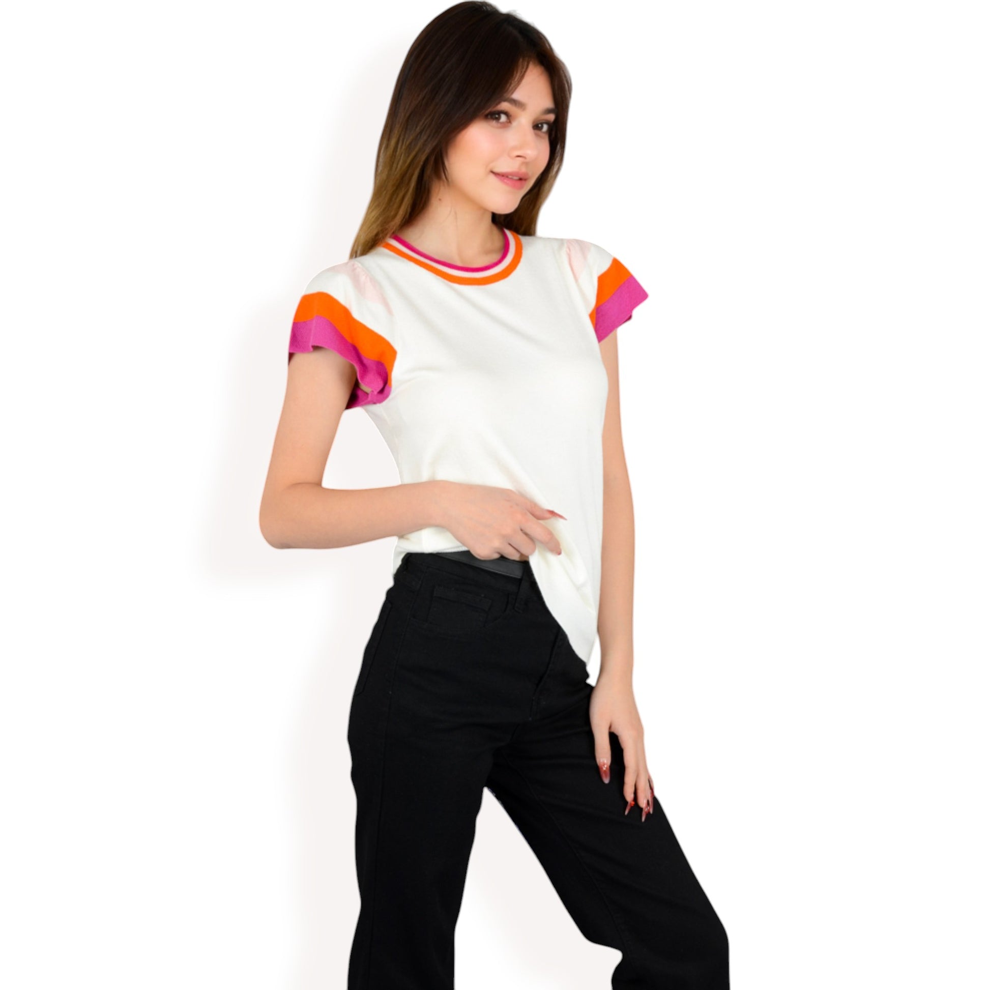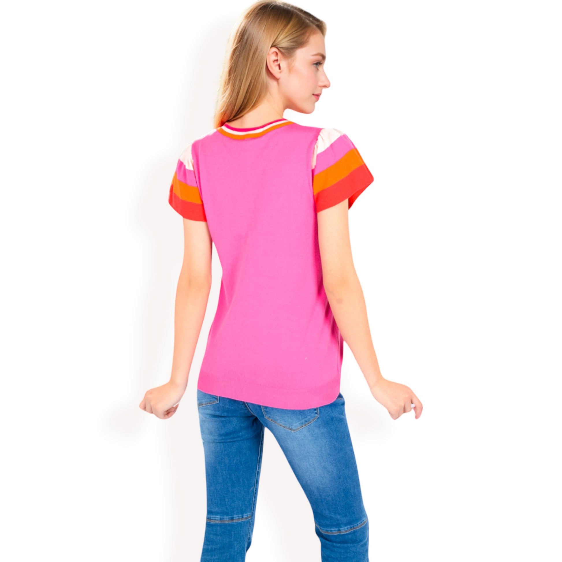 Anna-Kaci Women's Colorblock Knit Short Sleeve Top with Bold Striped Sleeves