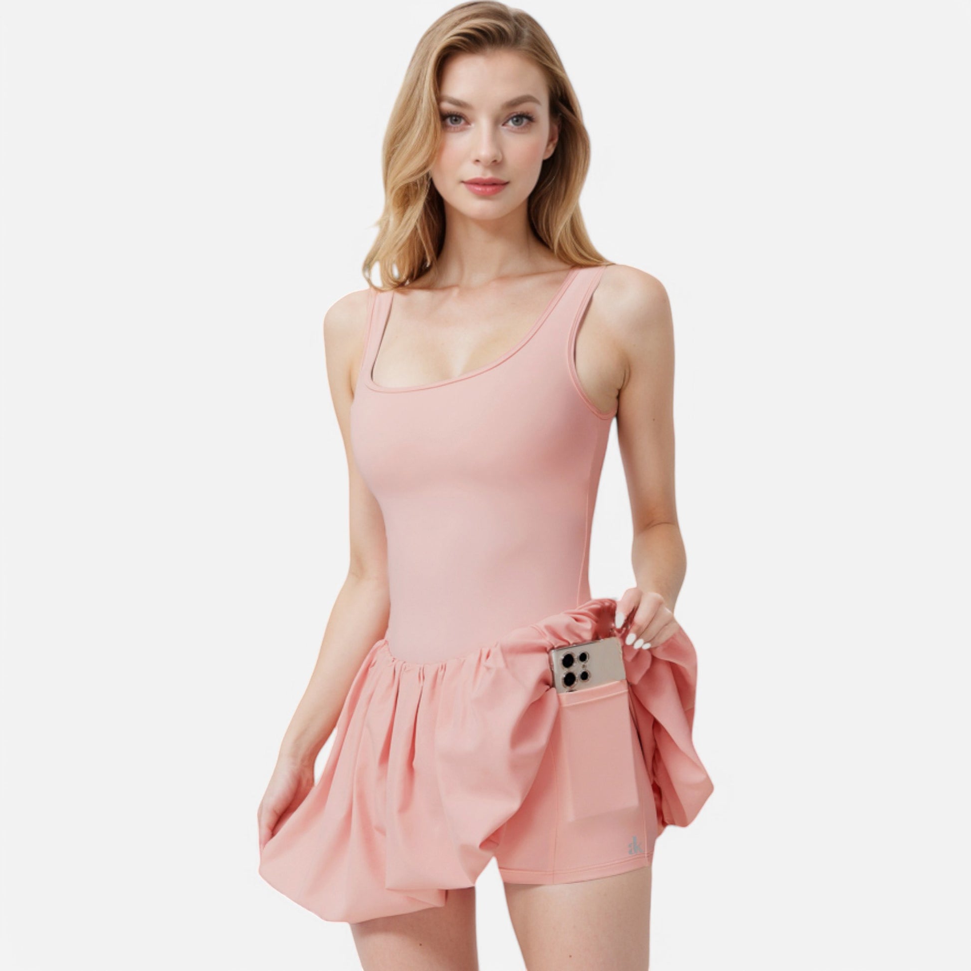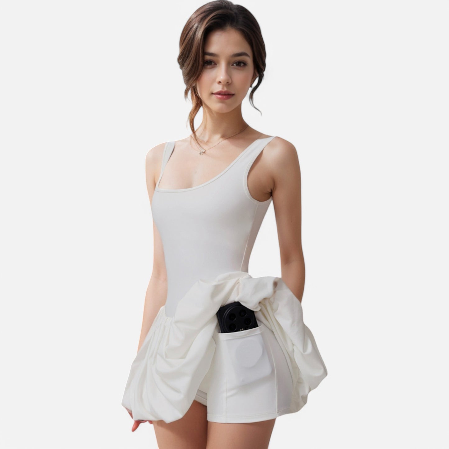 Anna-Kaci Active Women's Sleeveless Fitted Bodysuit Dress with Bubble Hem Skirt and Scoop Neck
