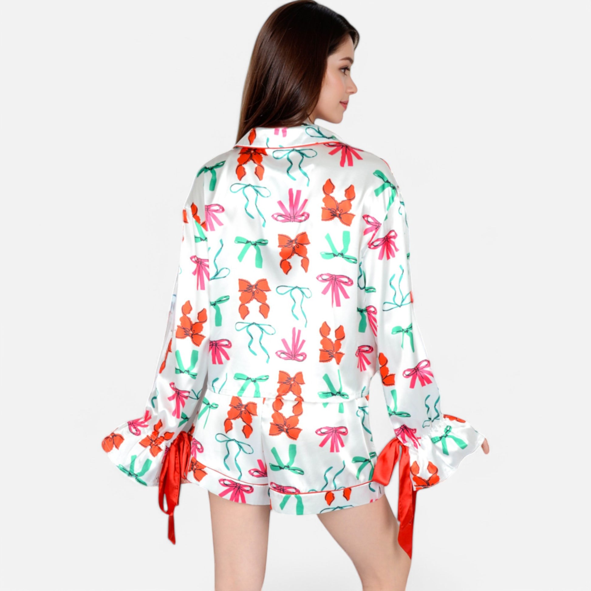 Anna-Kaci Lounge Women's Holiday Bow Print Pajama Set with Ribbon Tie Details and Button-Up Top