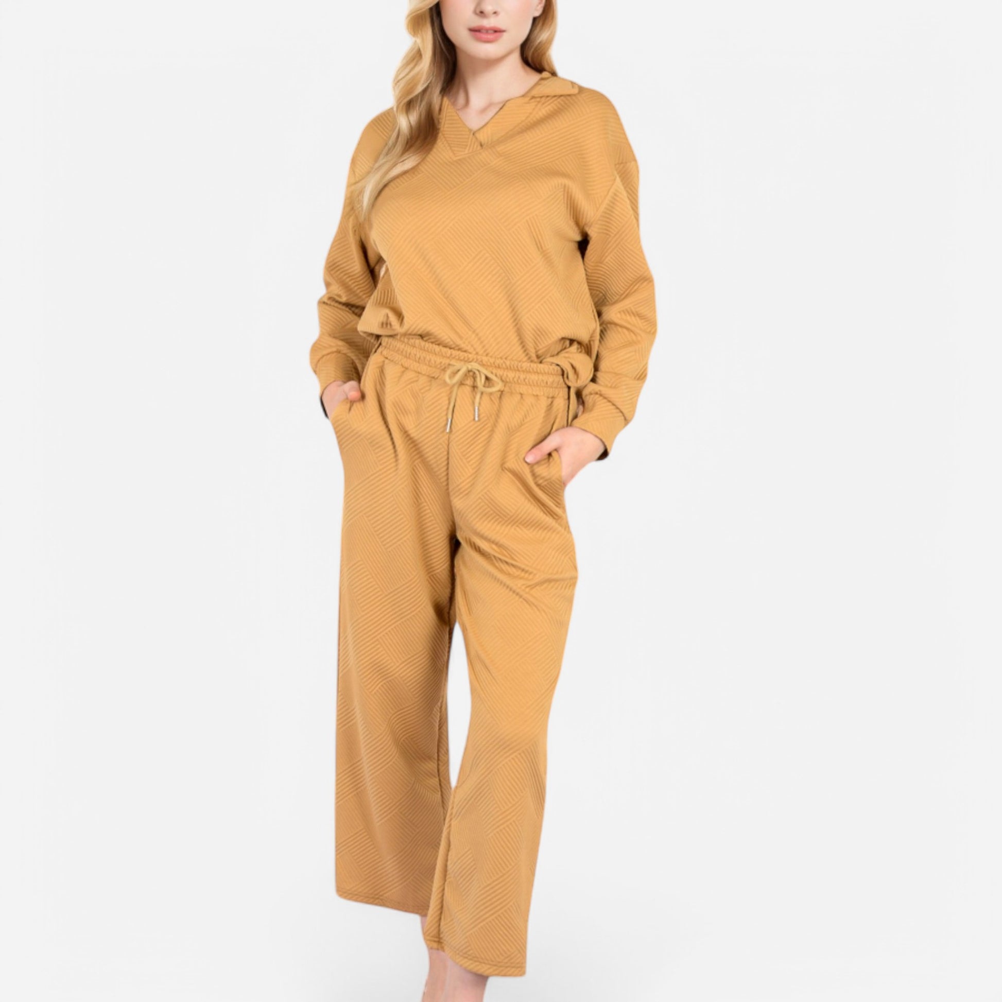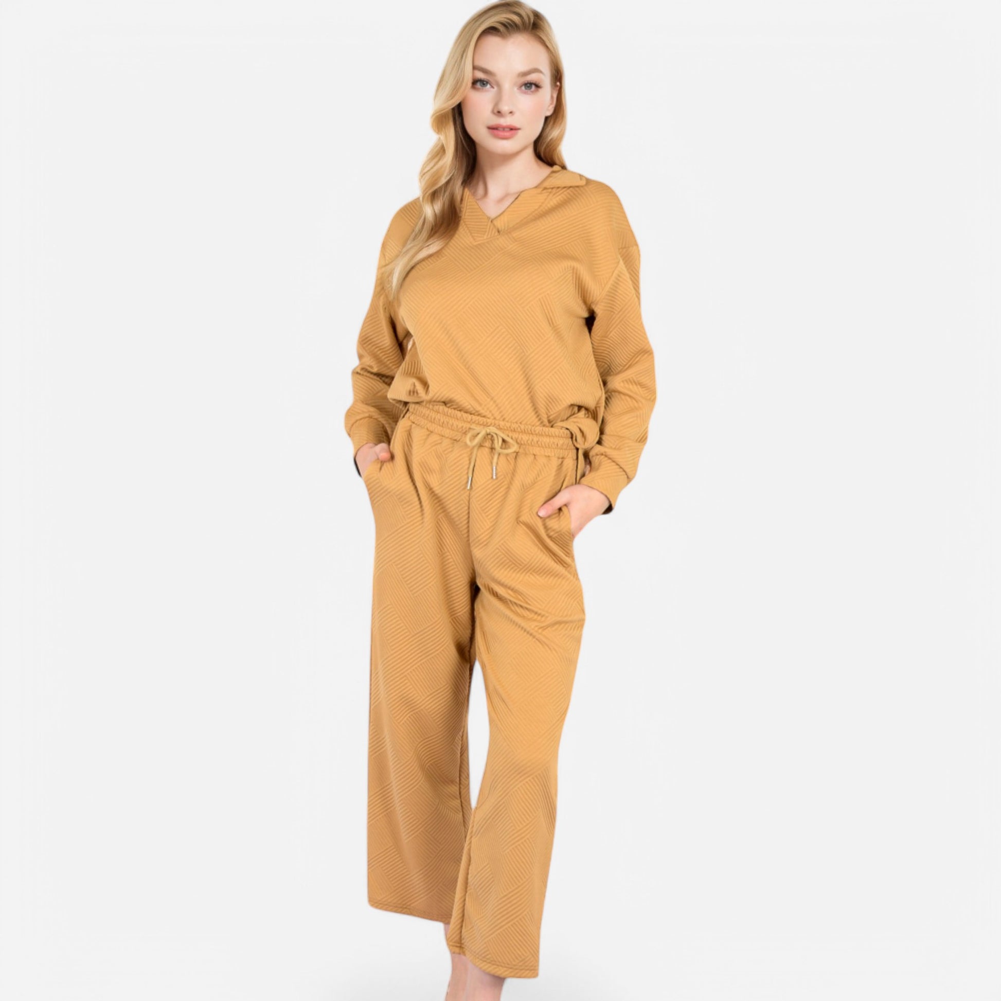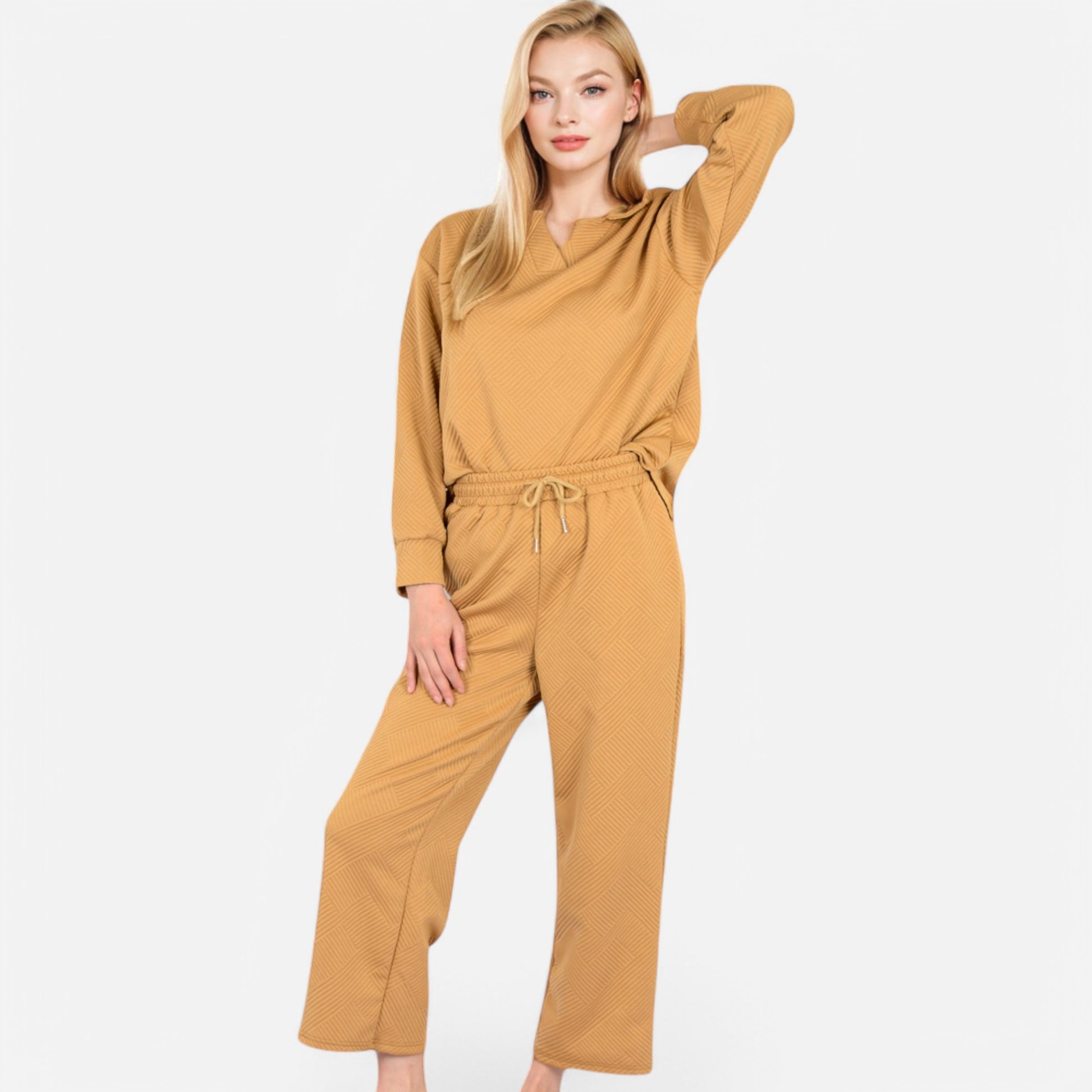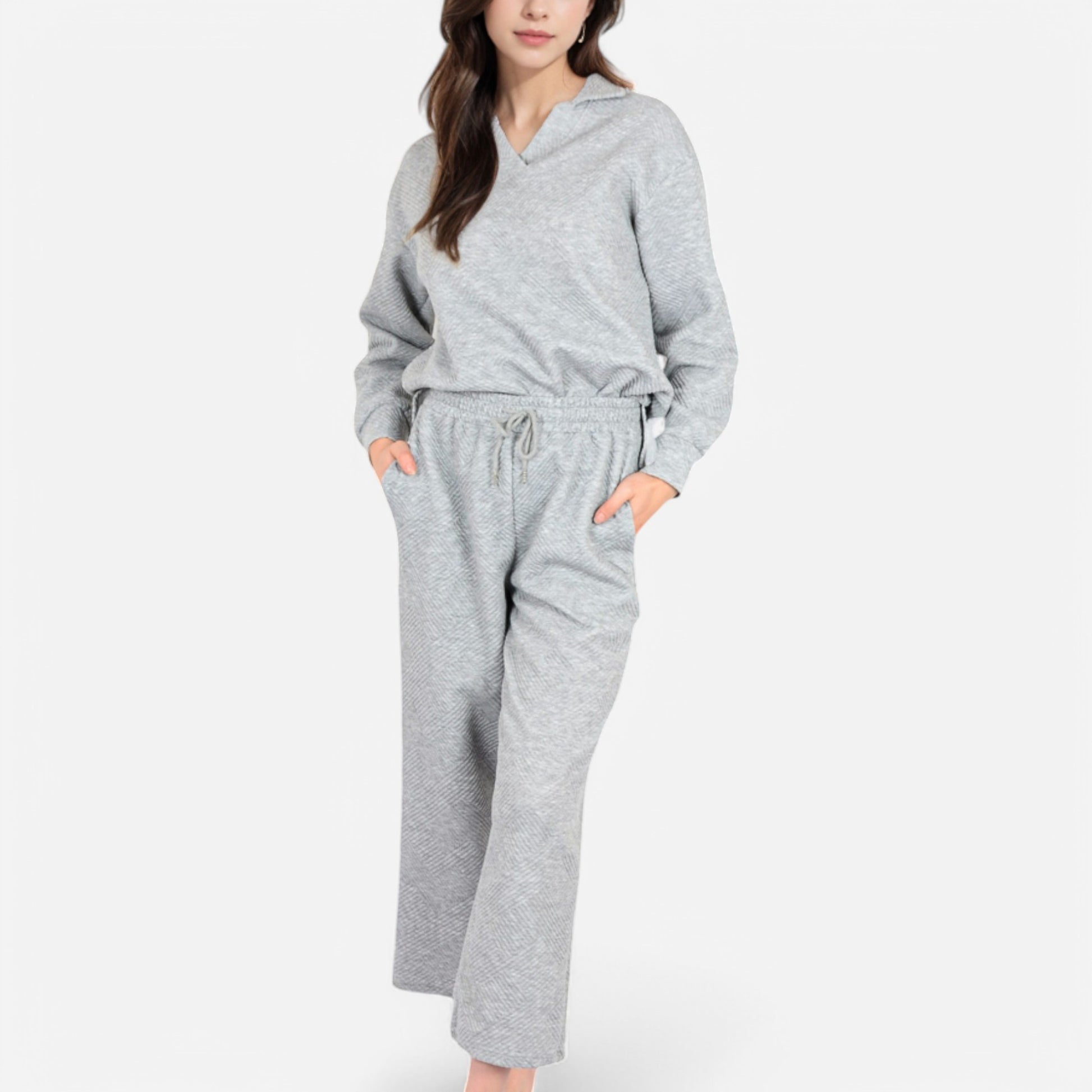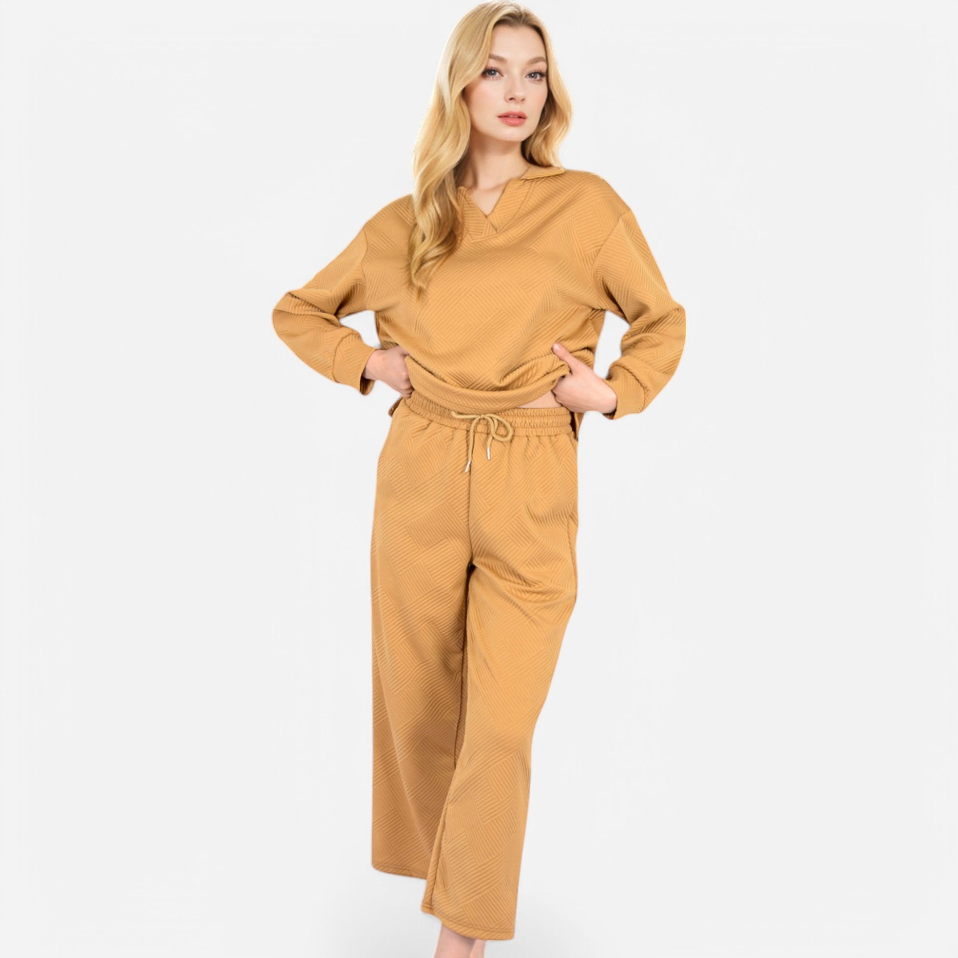 The Anna-Kaci Women's Long Sleeve Pullover and Wide Leg Pants Lounge Set offers a perfect balance of comfort and effortless style. Featuring a relaxed fit pullover with a subtle collared neckline, this set exudes casual sophistication. The matching wide-leg pants with an adjustable drawstring waist provide ultimate comfort for lounging or running errands. Whether worn together or styled separately, this versatile set is a cozy yet chic wardrobe essential.