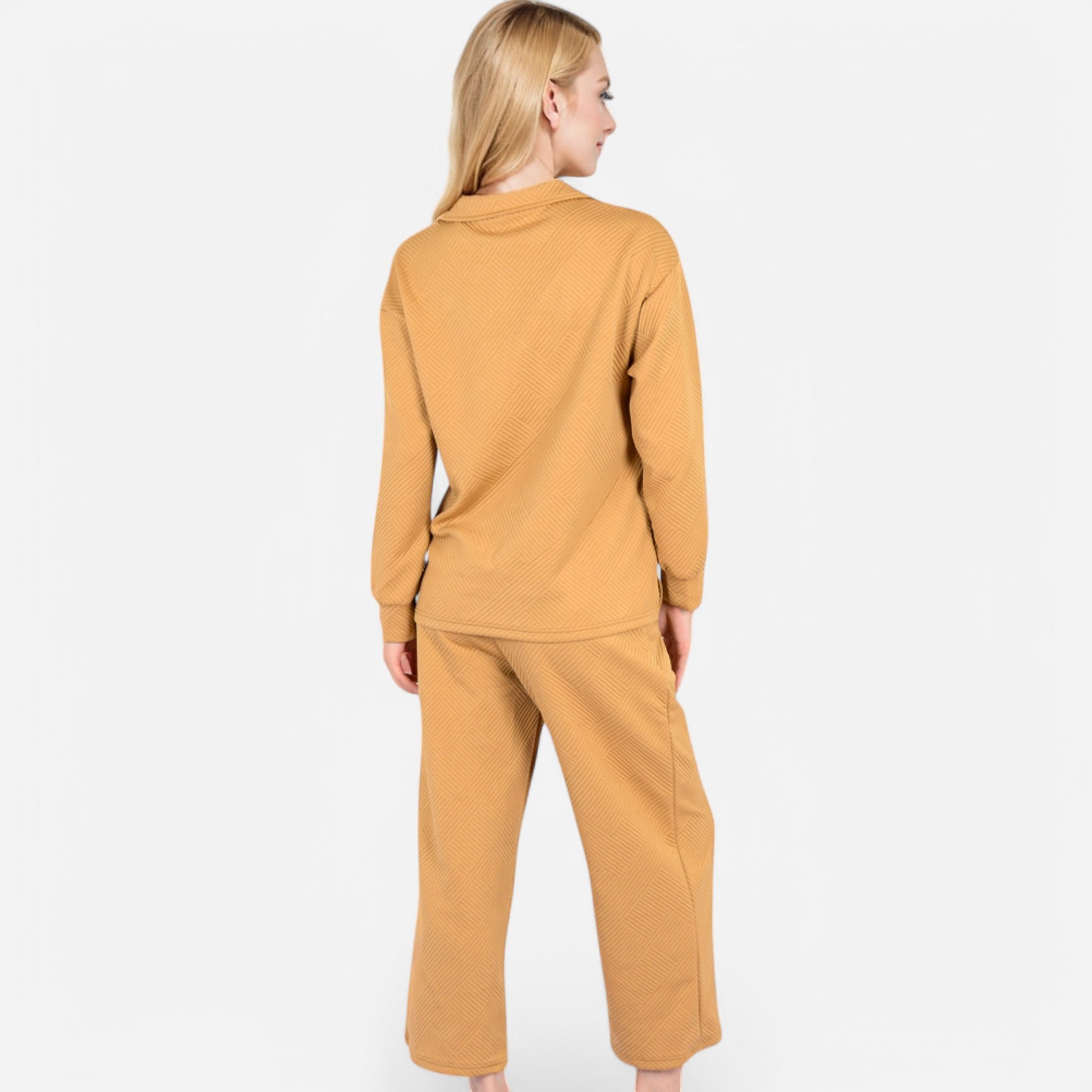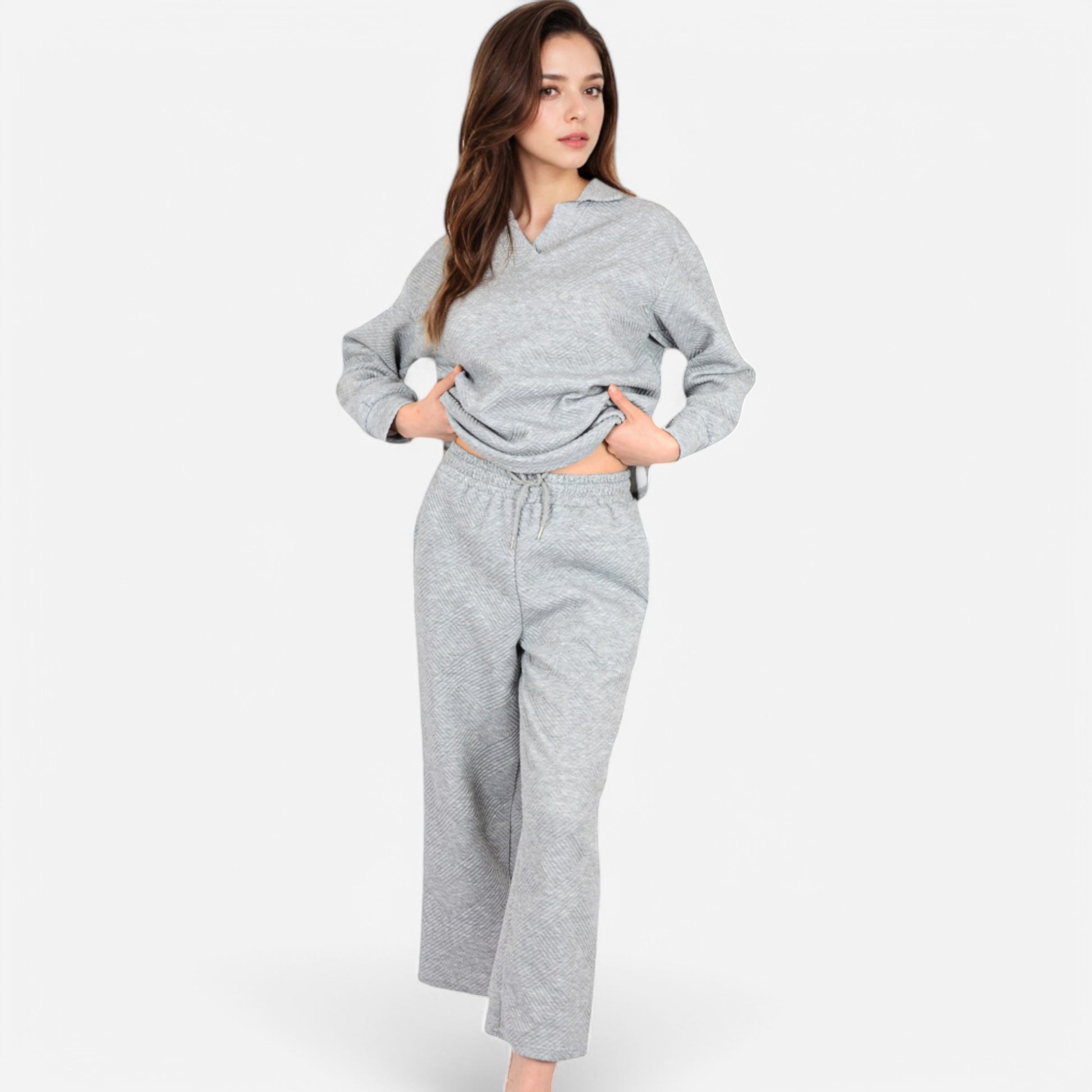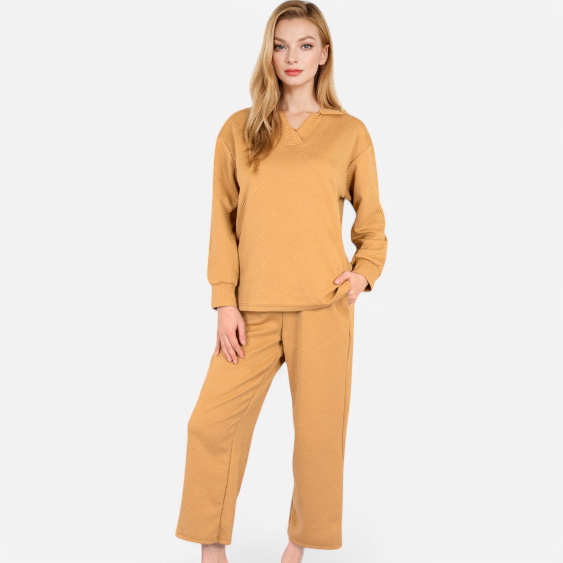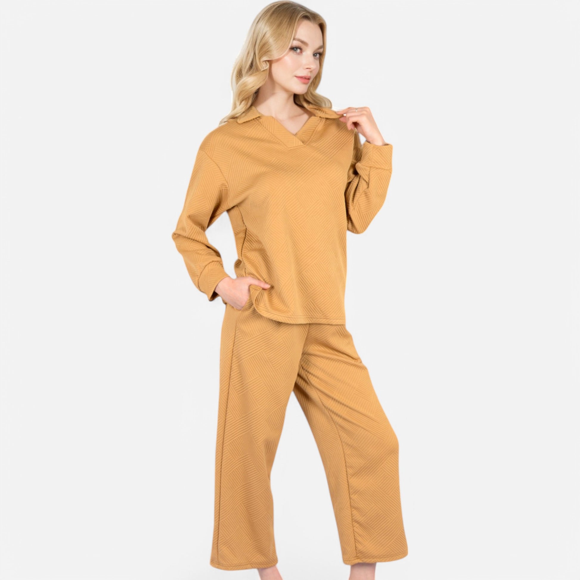 The Anna-Kaci Women's Long Sleeve Pullover and Wide Leg Pants Lounge Set offers a perfect balance of comfort and effortless style. Featuring a relaxed fit pullover with a subtle collared neckline, this set exudes casual sophistication. The matching wide-leg pants with an adjustable drawstring waist provide ultimate comfort for lounging or running errands. Whether worn together or styled separately, this versatile set is a cozy yet chic wardrobe essential.