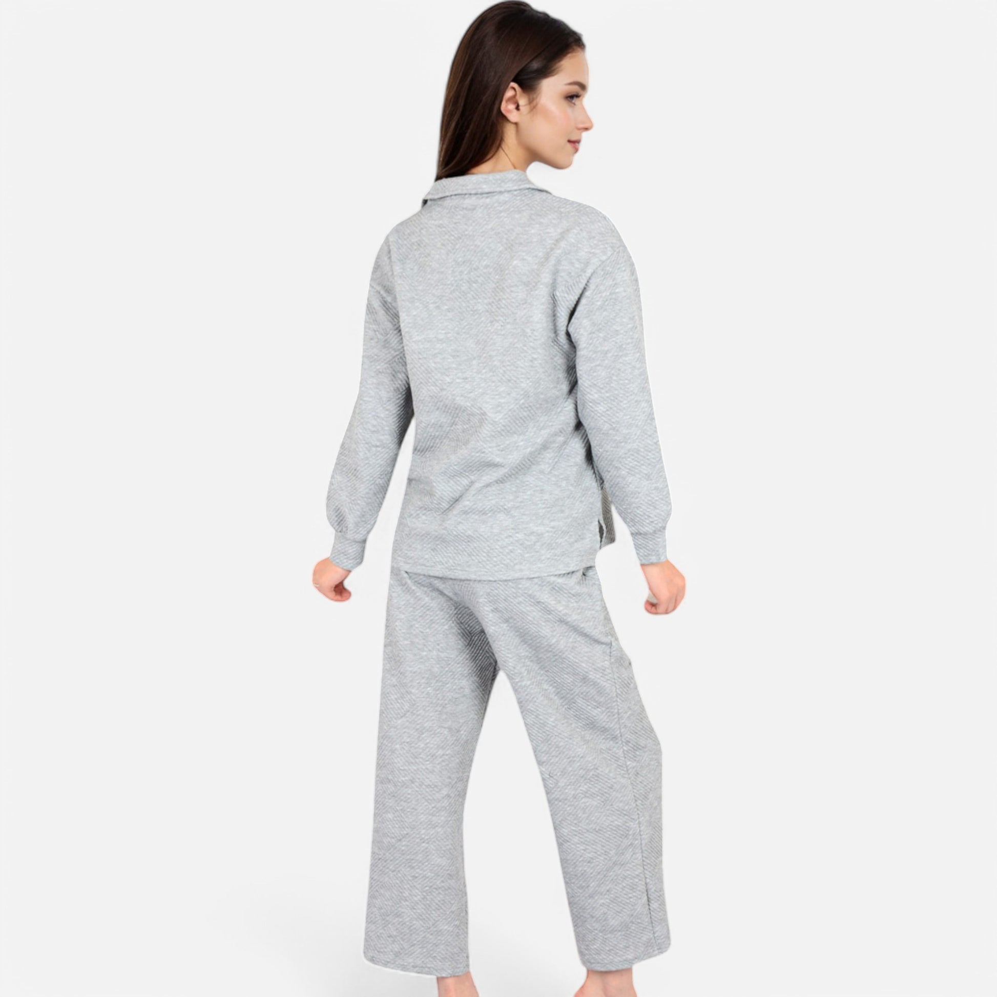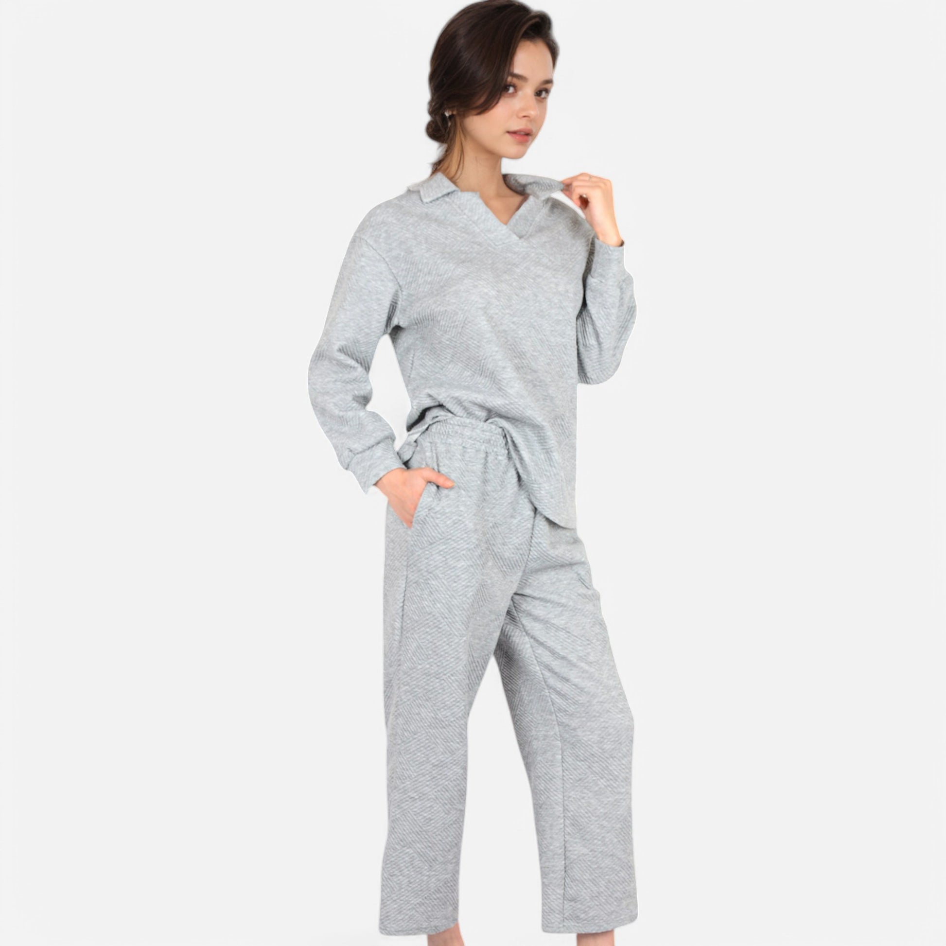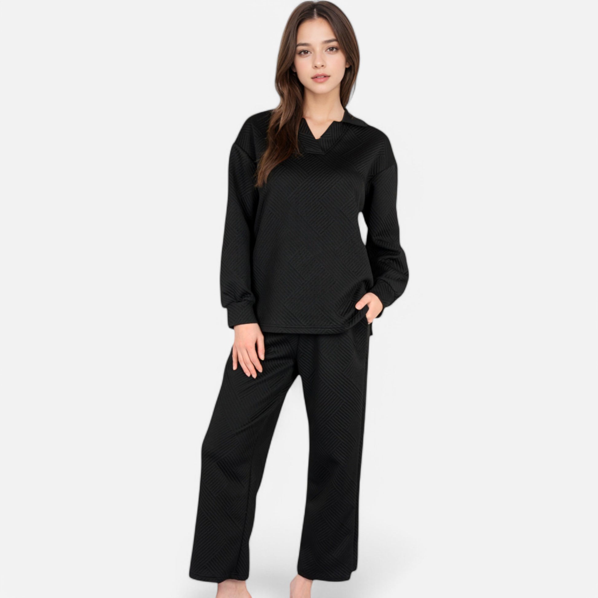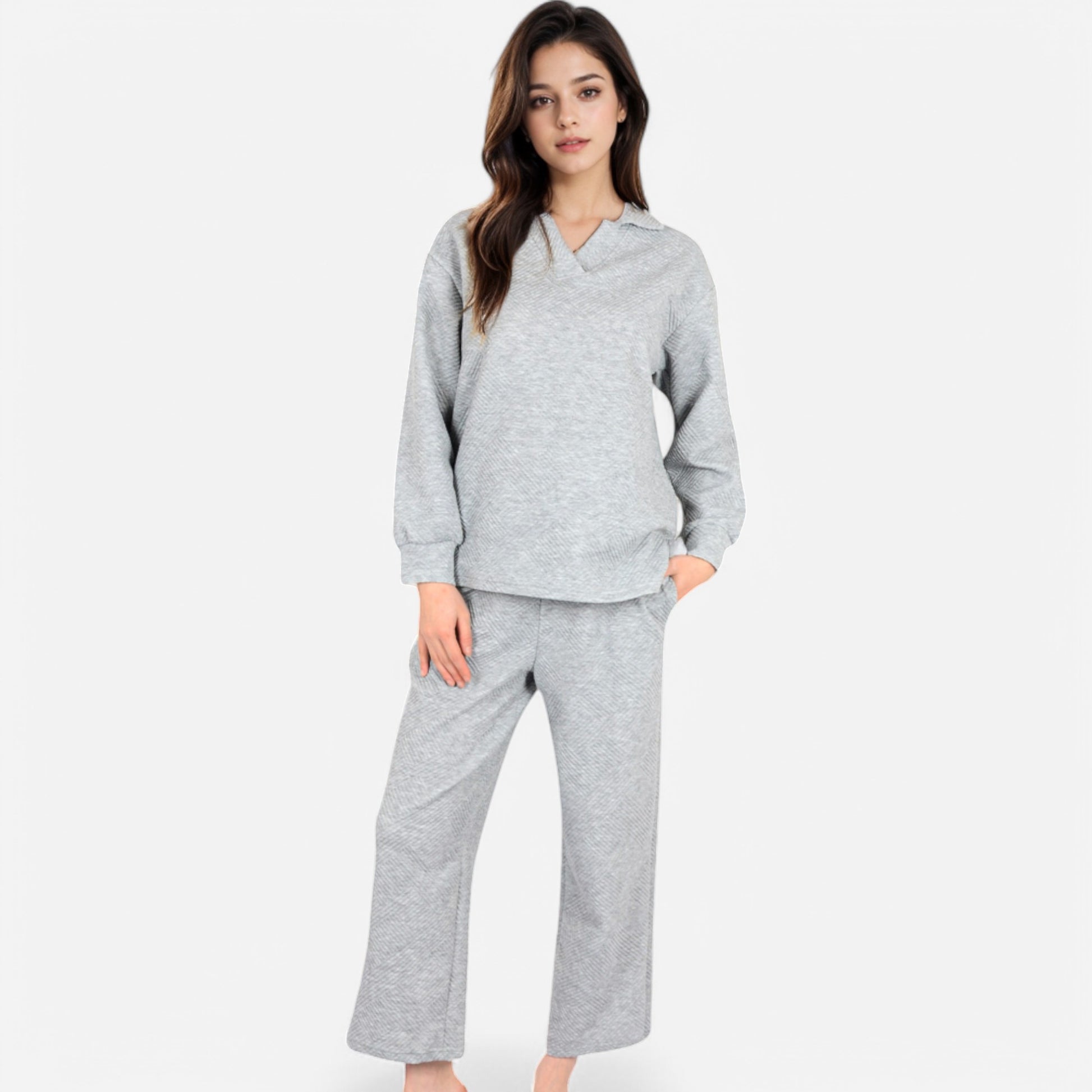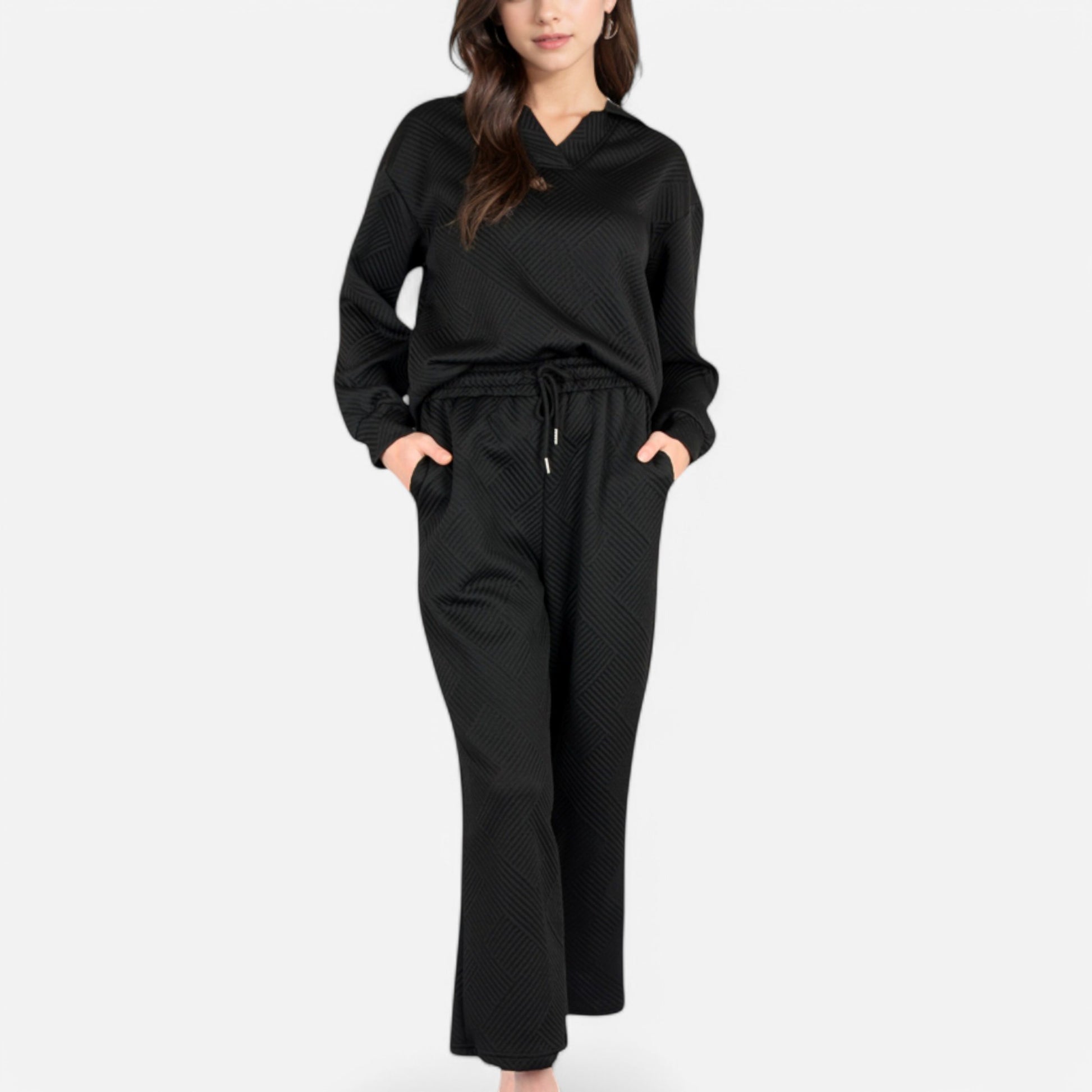 The Anna-Kaci Women's Long Sleeve Pullover and Wide Leg Pants Lounge Set offers a perfect balance of comfort and effortless style. Featuring a relaxed fit pullover with a subtle collared neckline, this set exudes casual sophistication. The matching wide-leg pants with an adjustable drawstring waist provide ultimate comfort for lounging or running errands. Whether worn together or styled separately, this versatile set is a cozy yet chic wardrobe essential.