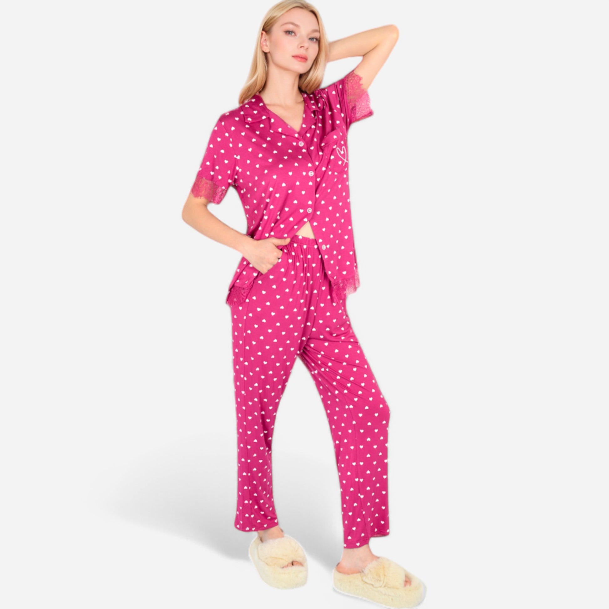 The Anna-Kaci Women's Polka Dot Short Sleeve Button-Up Pajama Set adds a playful touch to your loungewear collection. Featuring an all-over polka dot print and a relaxed short sleeve top with a classic button-up front, this set balances style and comfort. The matching pants include an elastic waistband for a secure fit, while the functional pocket detail enhances practicality. Crafted from soft, breathable fabric, this set offers all-day comfort for lounging or sleeping.