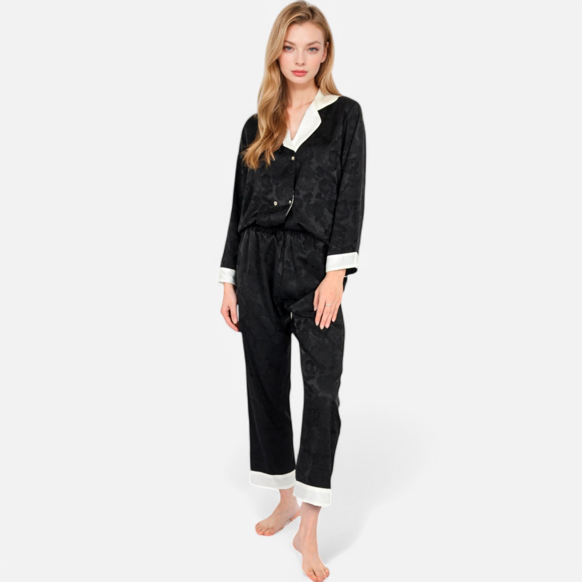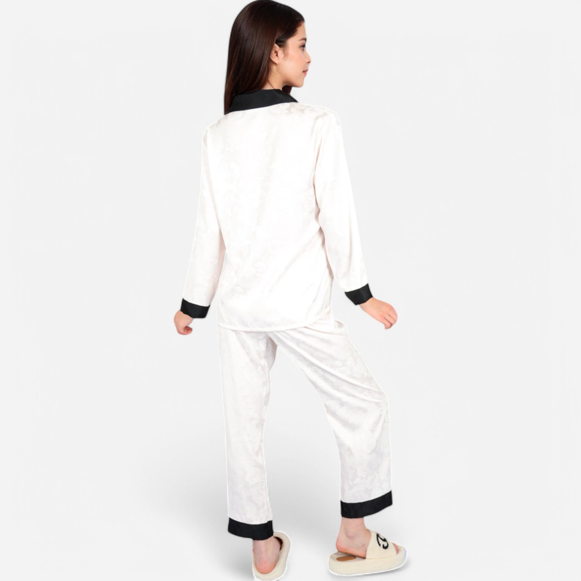 The Anna-Kaci Women's Satin Pajama Set offers a luxurious blend of style and comfort for a polished loungewear look. This silky two-piece set includes a long-sleeve button-up top with contrast trim along the collar, cuffs, and hem for an elegant touch. The matching wide-leg pants feature an elastic waistband for a relaxed yet flattering fit. Made from smooth satin fabric, this pajama set delivers a soft, breathable feel perfect for lounging or sleeping in sophistication.
