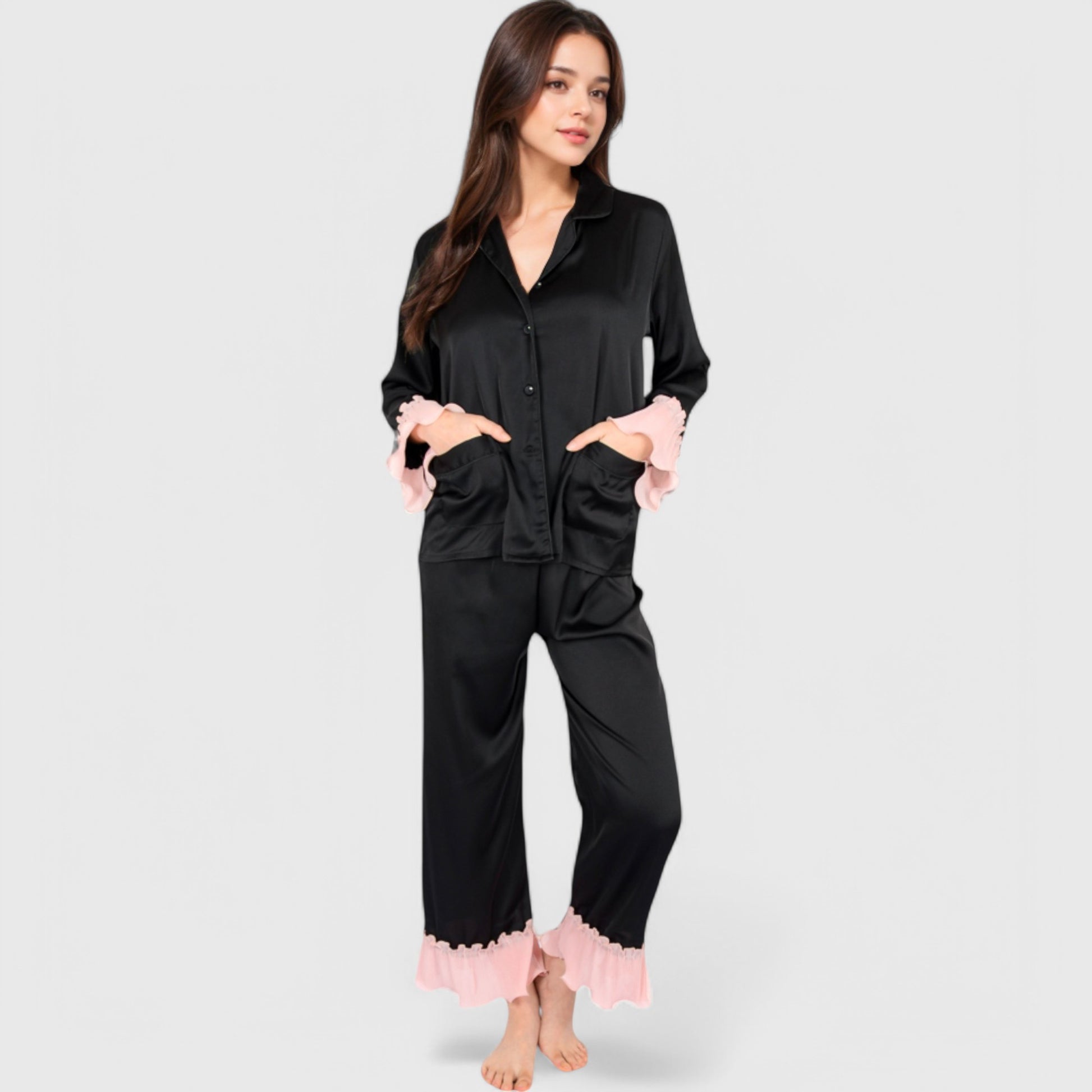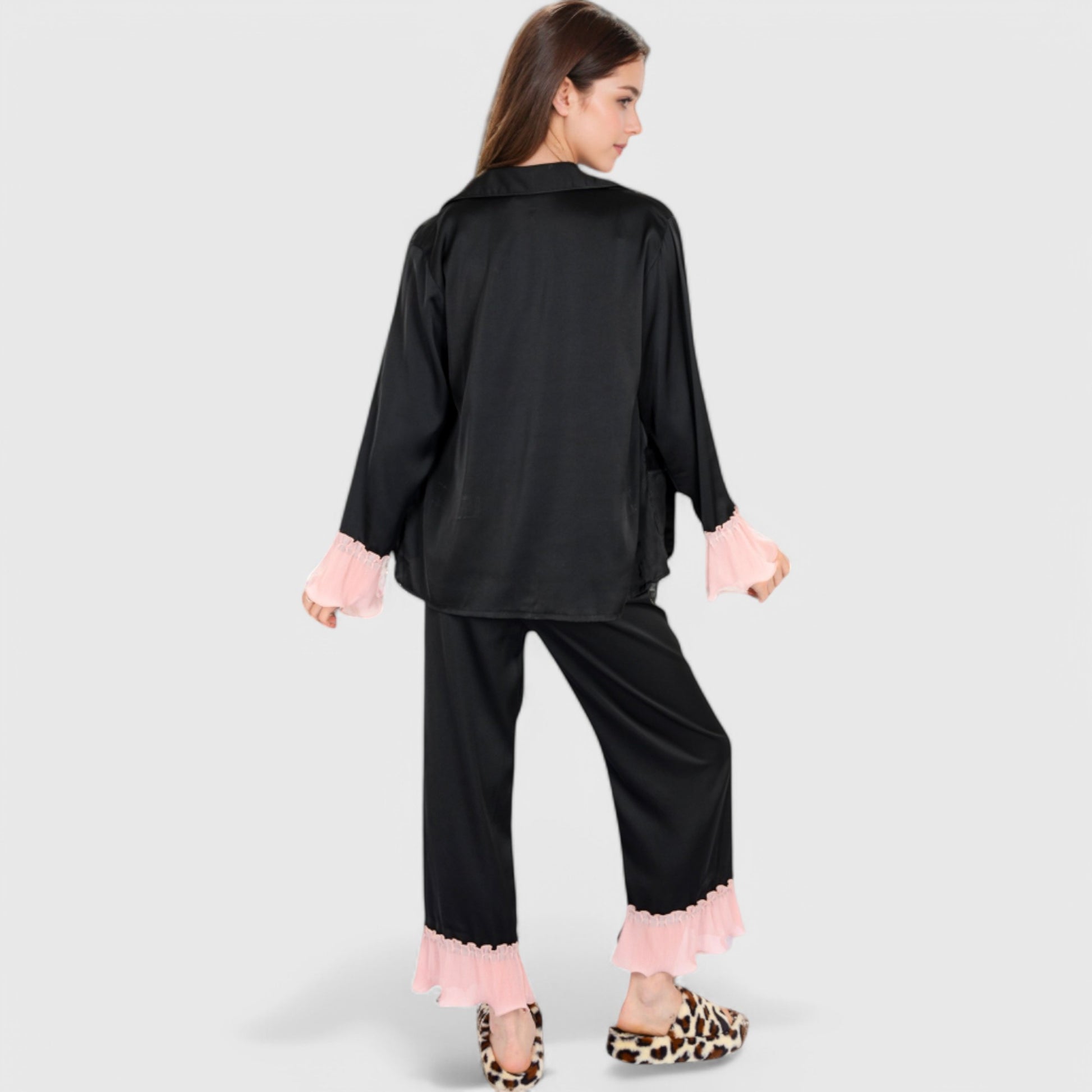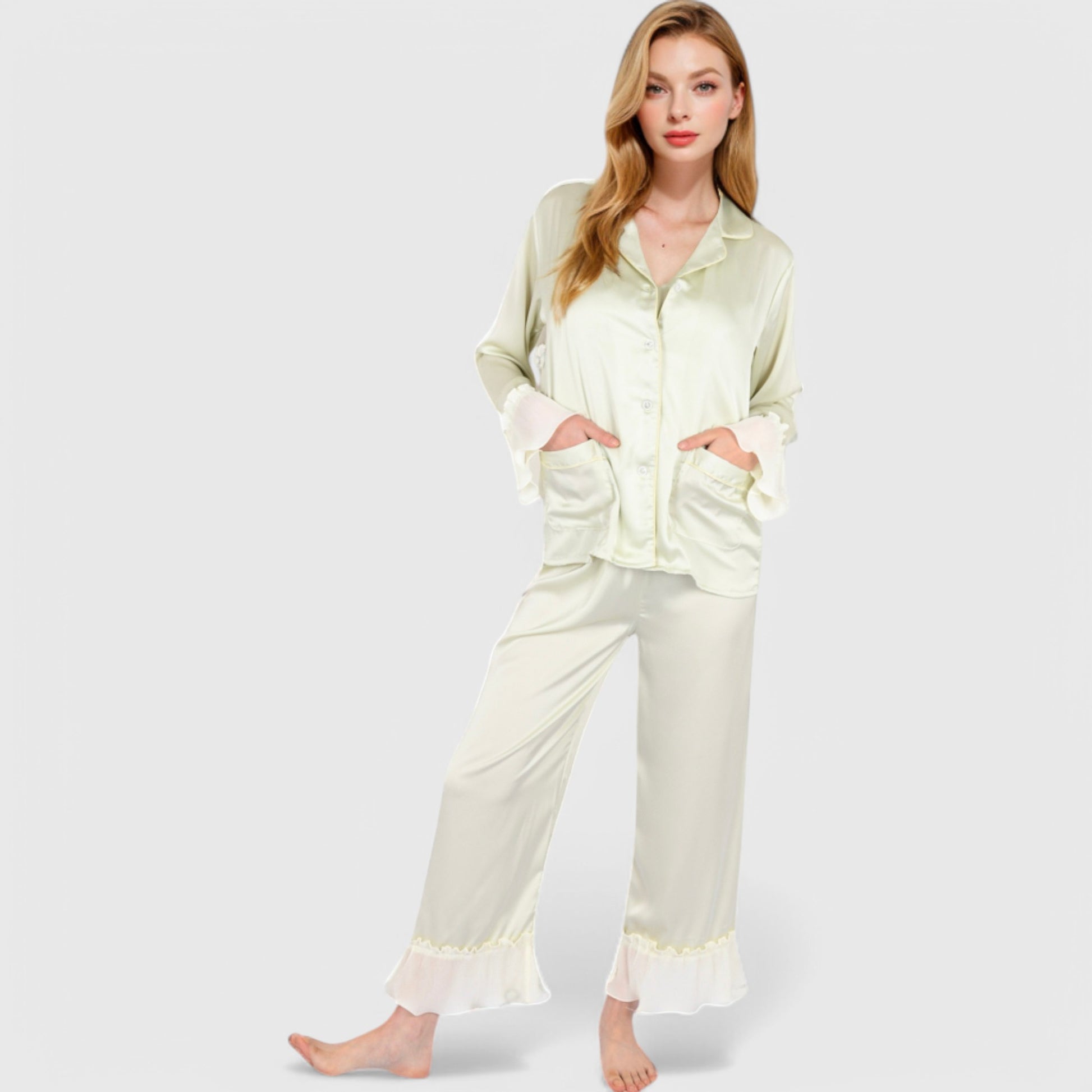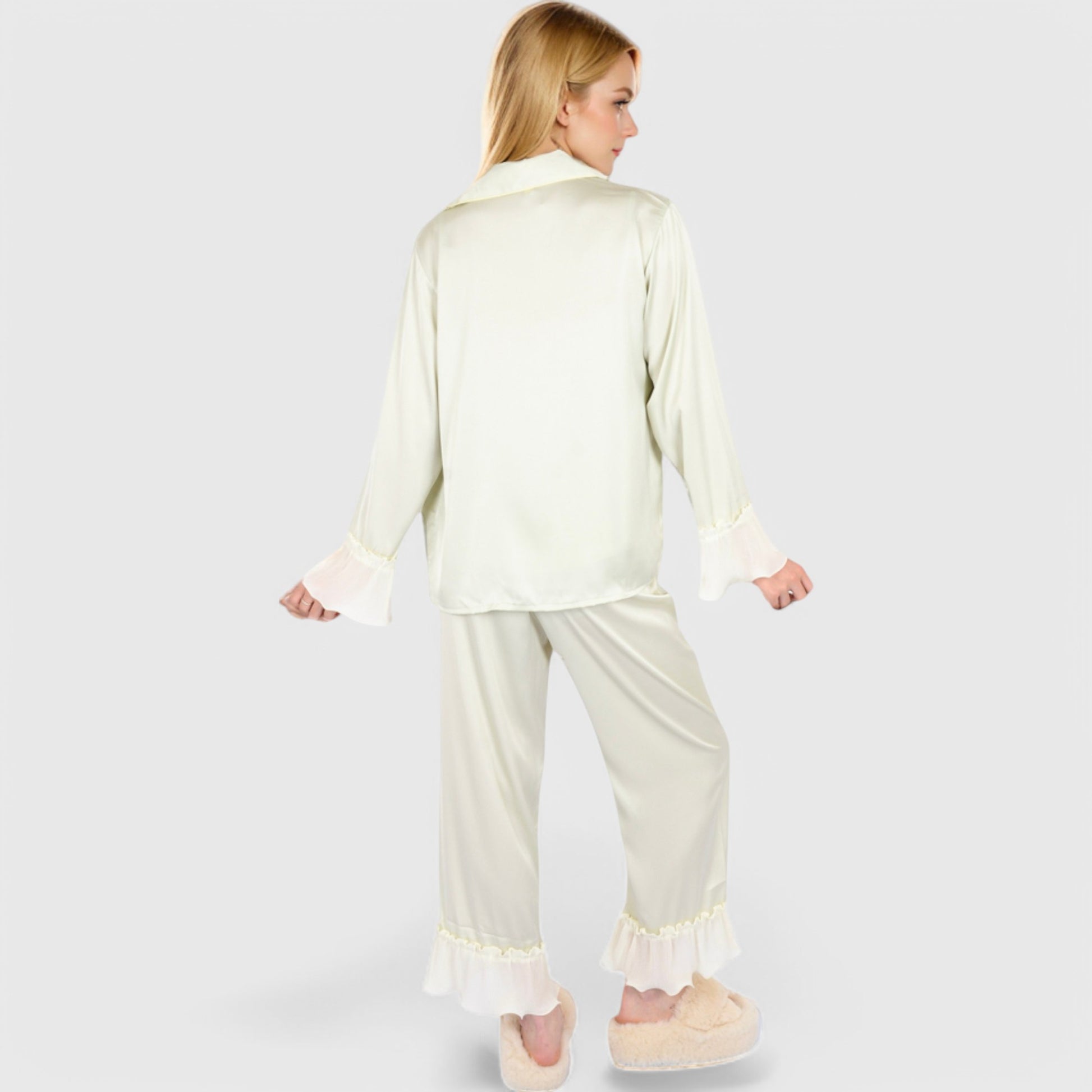 Anna-Kaci Lounge Women's Satin Pajama Set with Ruffled Cuffs and Button-Up Top