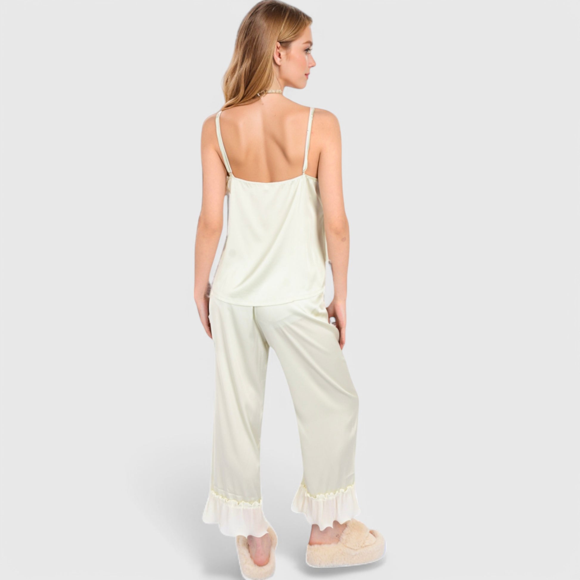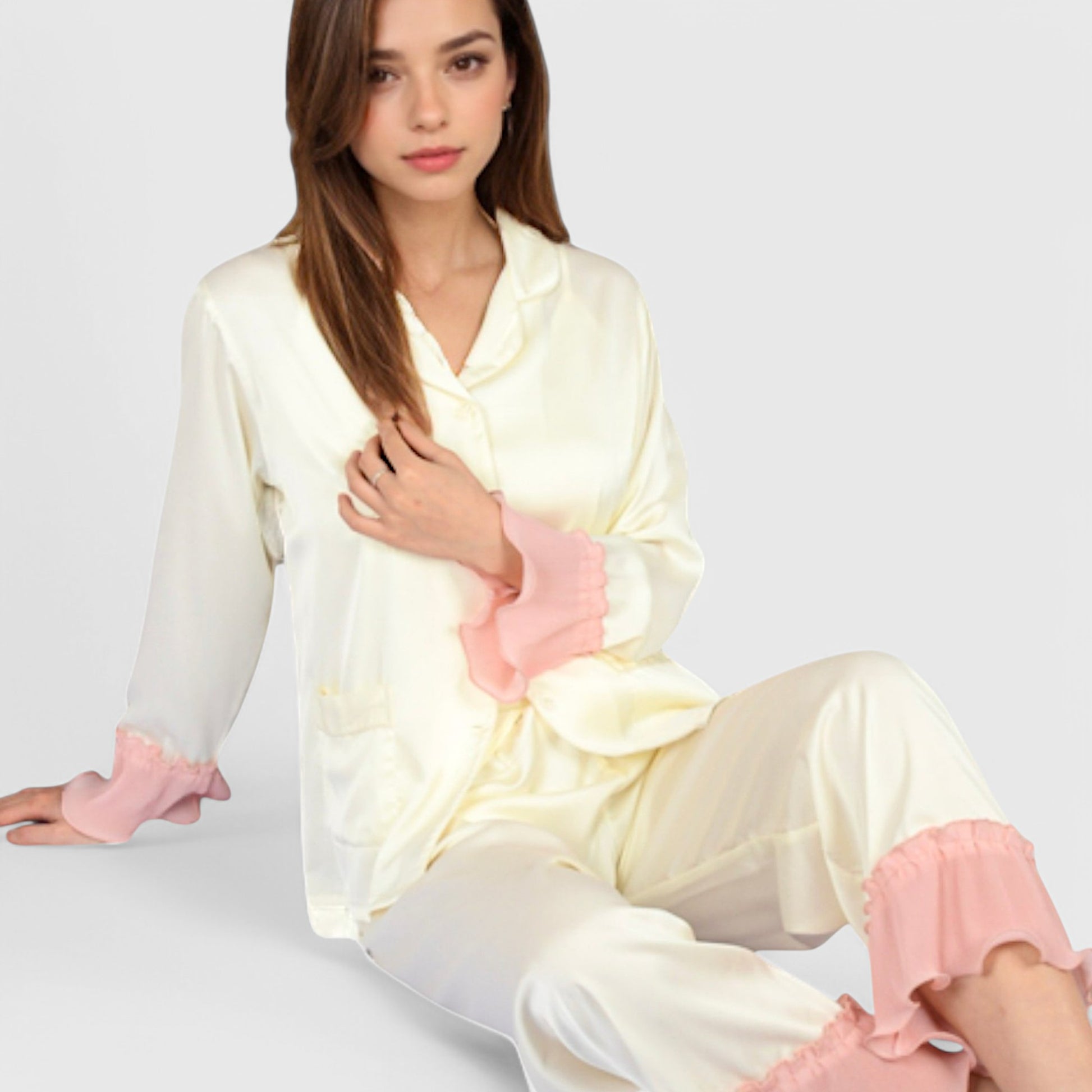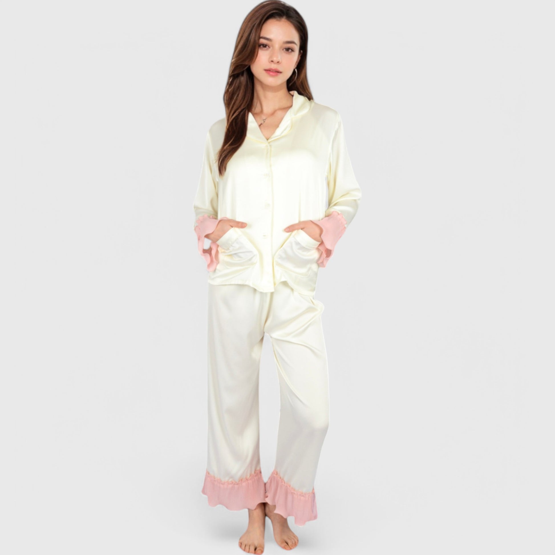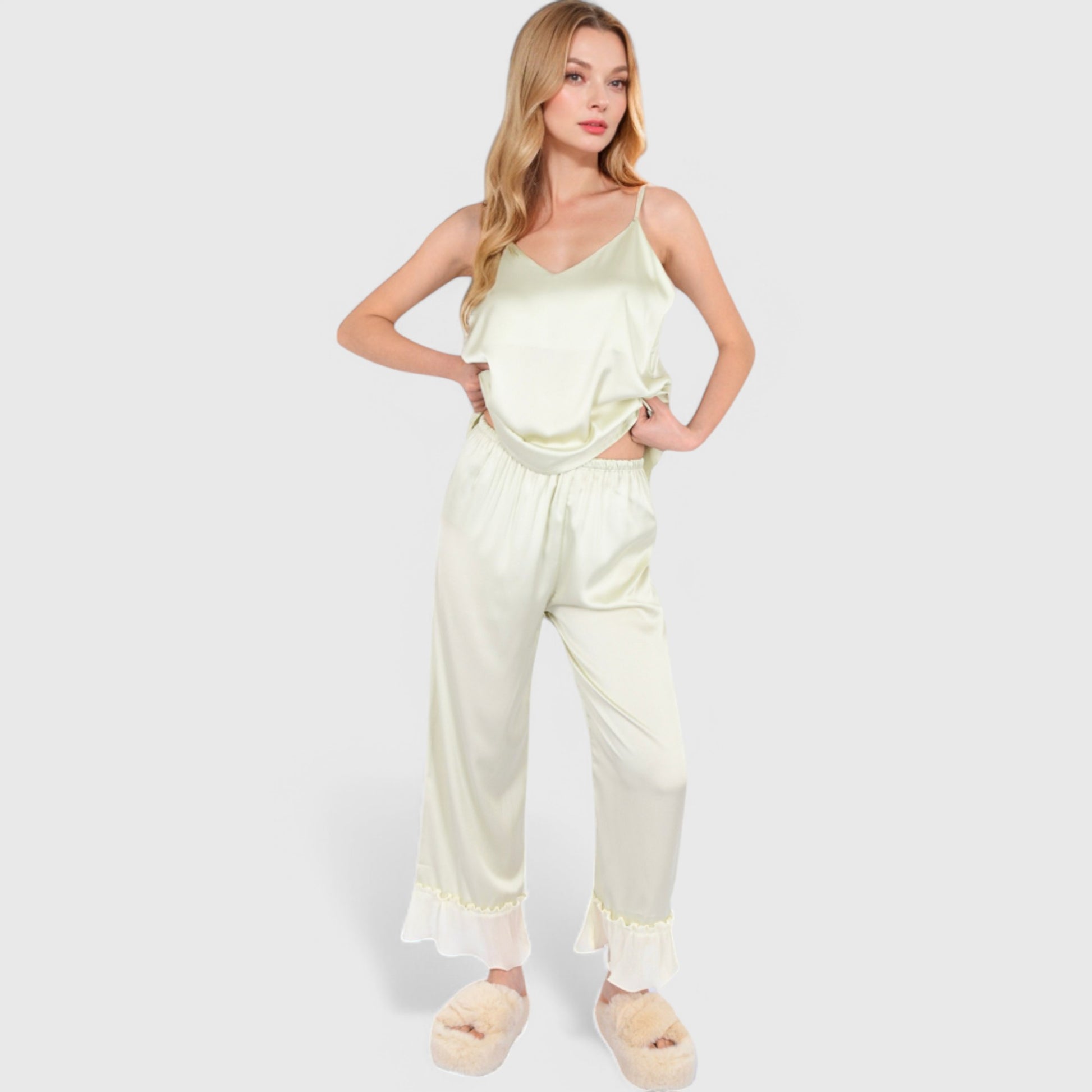 Anna-Kaci Lounge Women's Satin Pajama Set with Ruffled Cuffs and Button-Up Top