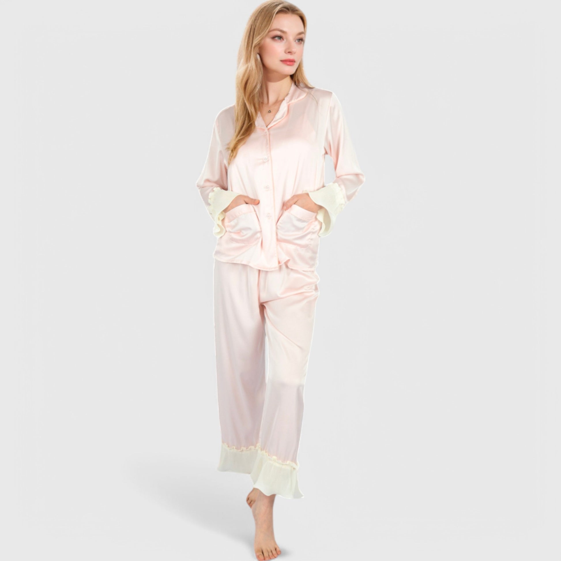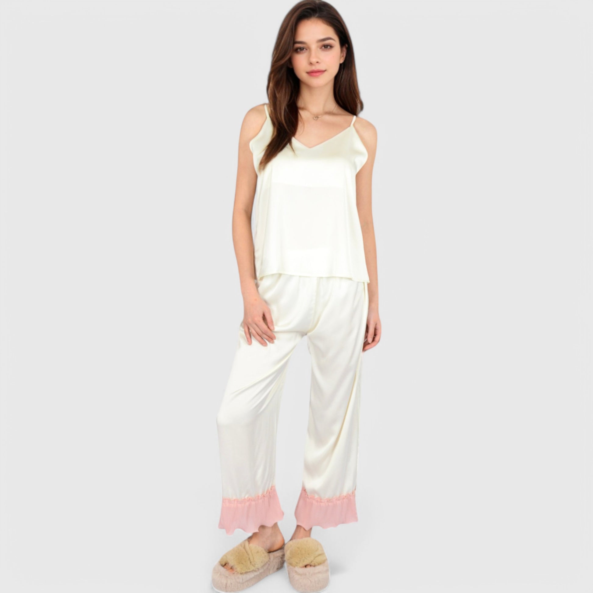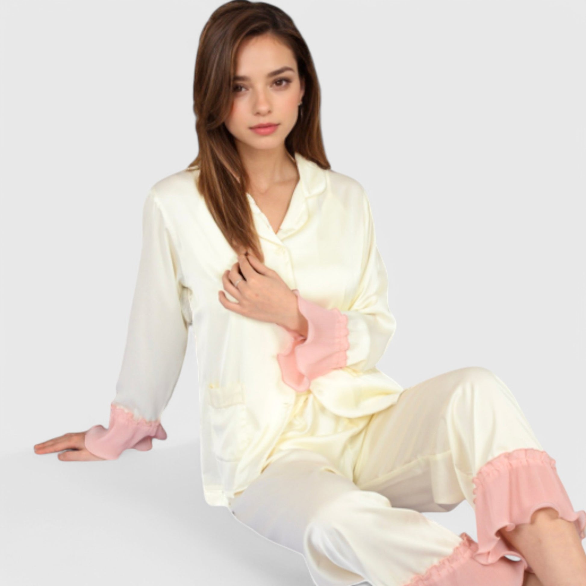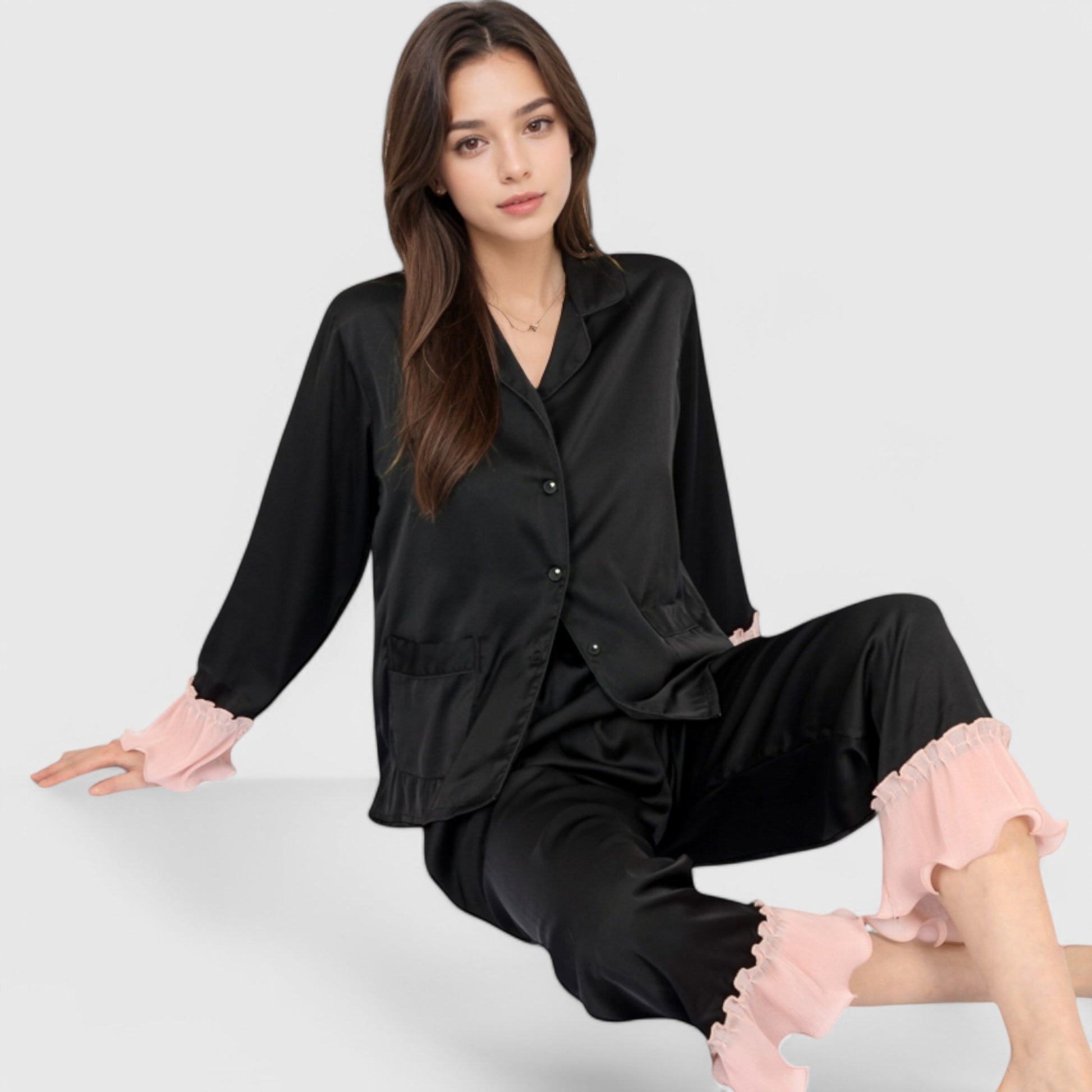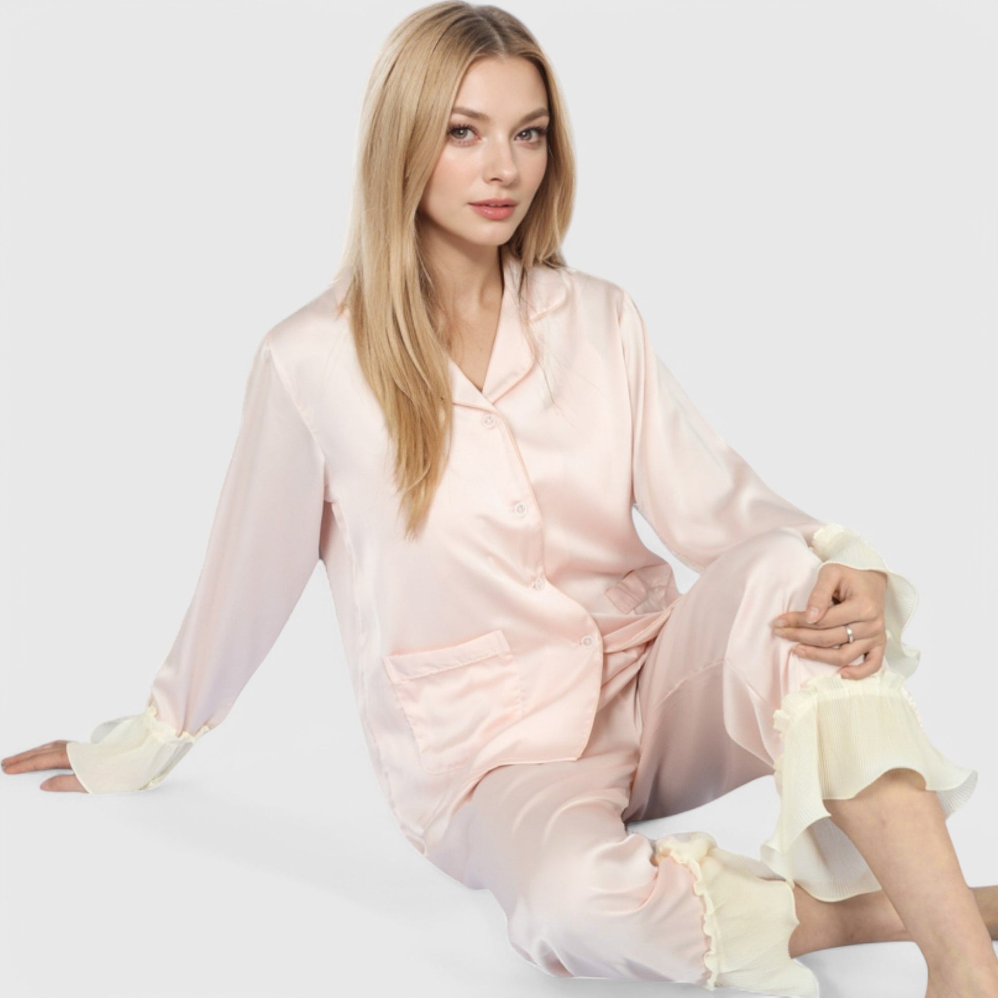 Anna-Kaci Lounge Women's Satin Pajama Set with Ruffled Cuffs and Button-Up Top