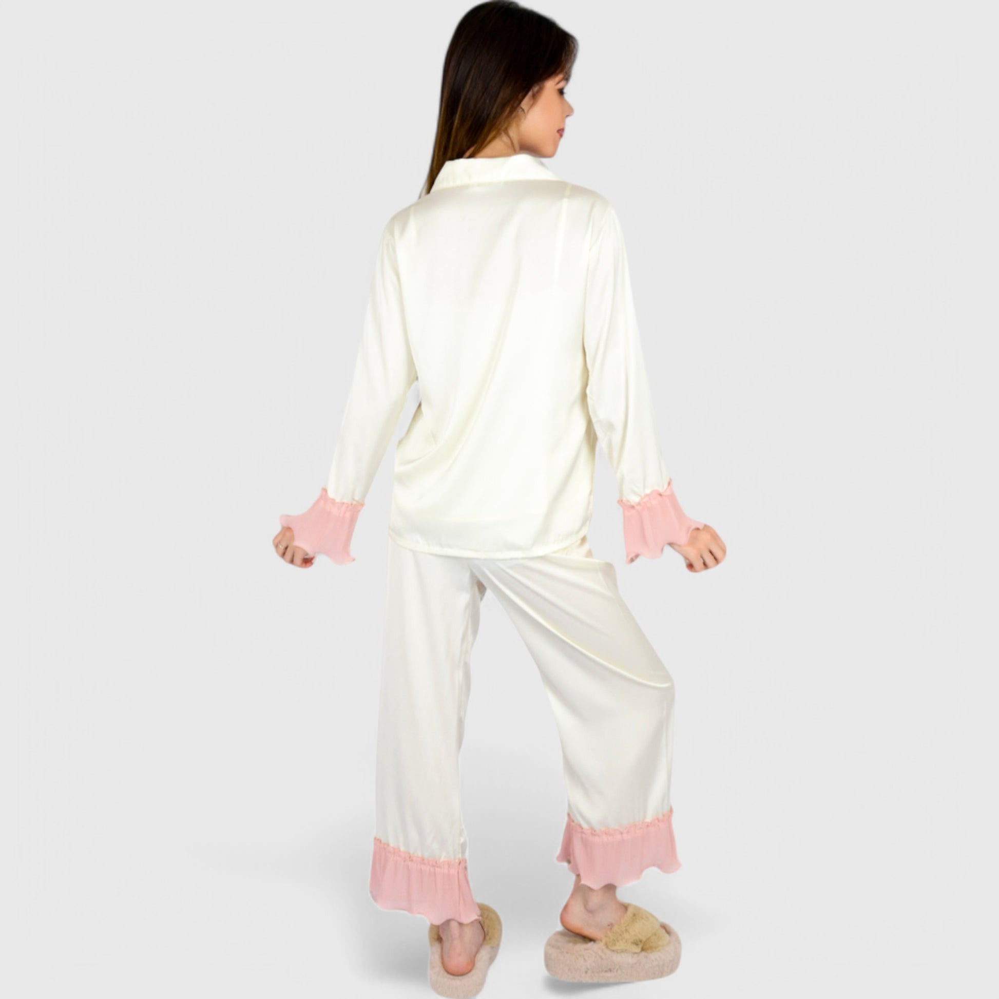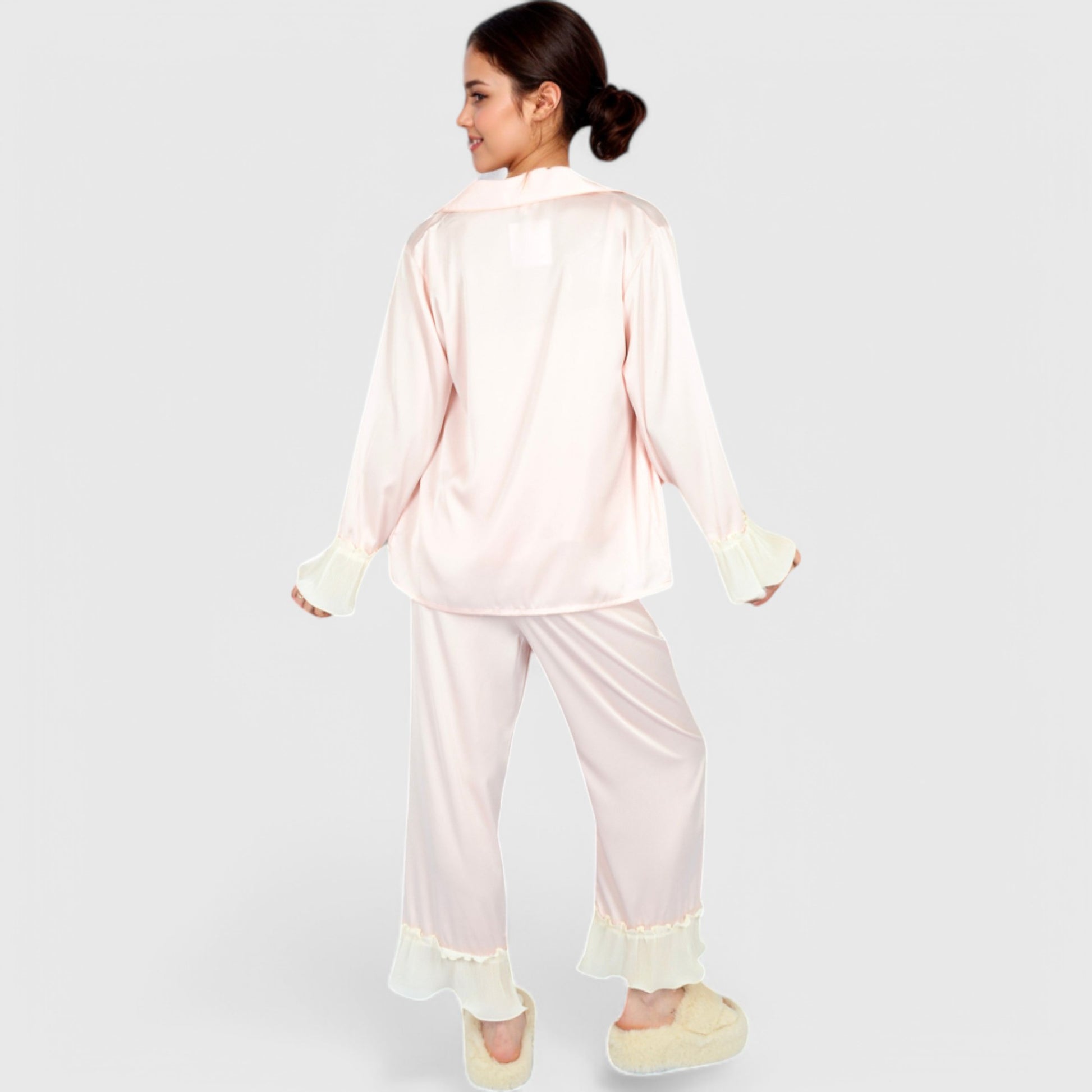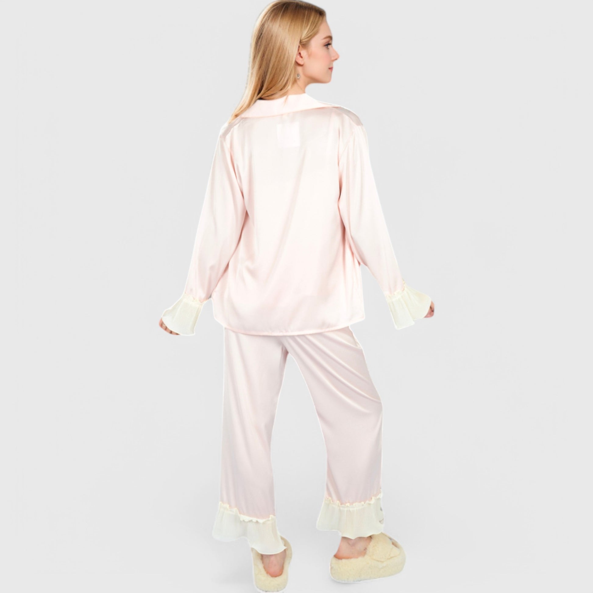 The Anna-Kaci Women's Satin Pajama Set blends elegance and comfort with its soft, silky fabric and feminine ruffle accents. Featuring a long-sleeve button-up top with delicate ruffled cuffs and a relaxed fit, this set brings a chic touch to loungewear. The matching wide-leg pants also showcase ruffled hems for a stylish and cozy feel. Designed with a breathable satin finish, this pajama set is perfect for sleeping, lounging, or indulging in a self-care day.