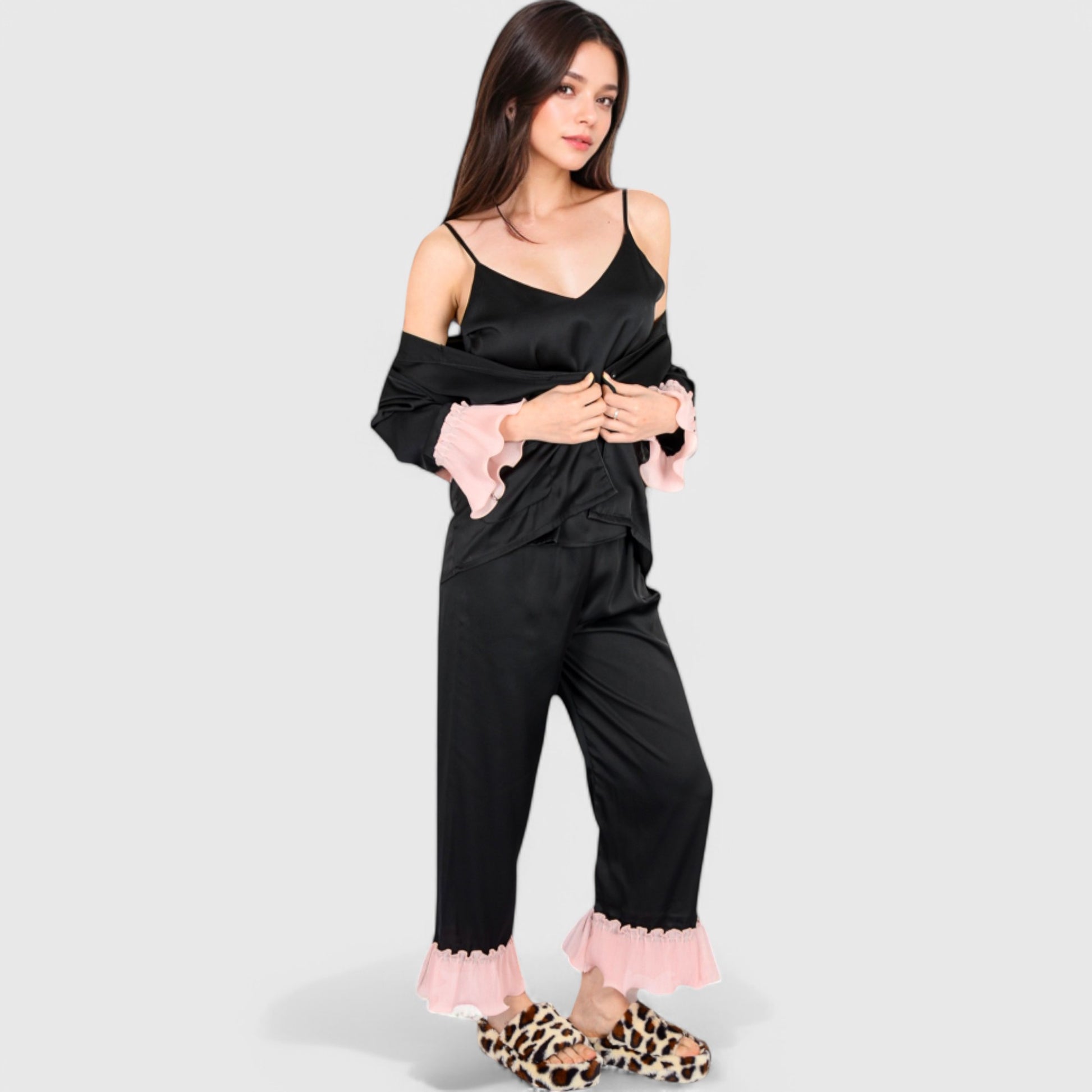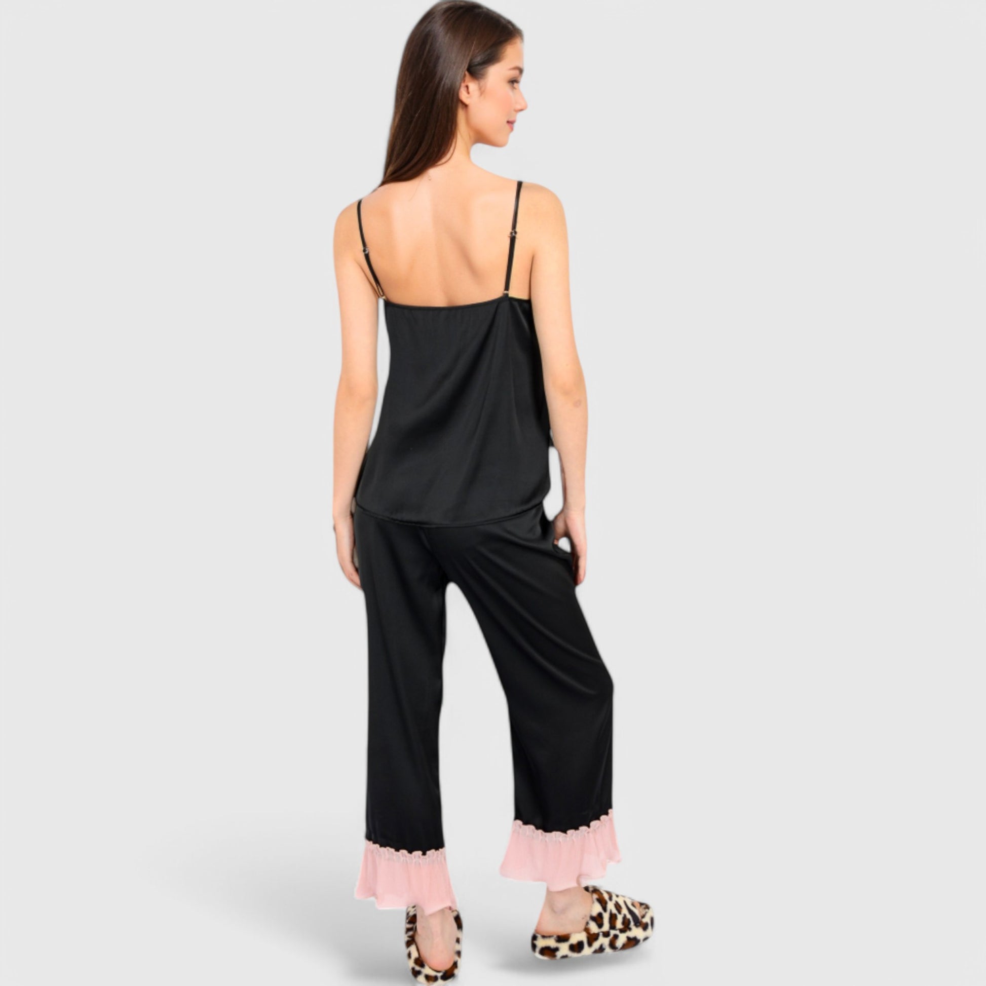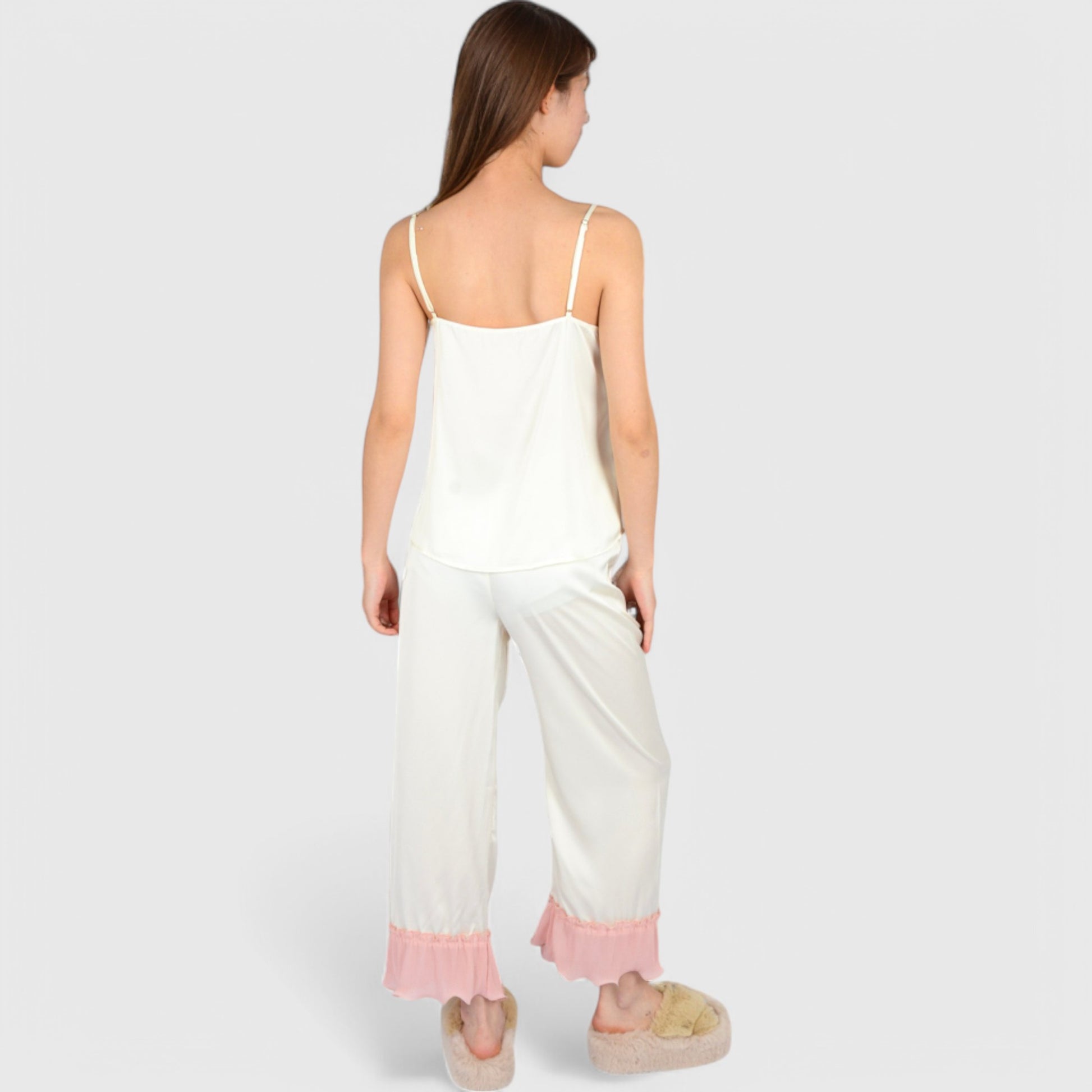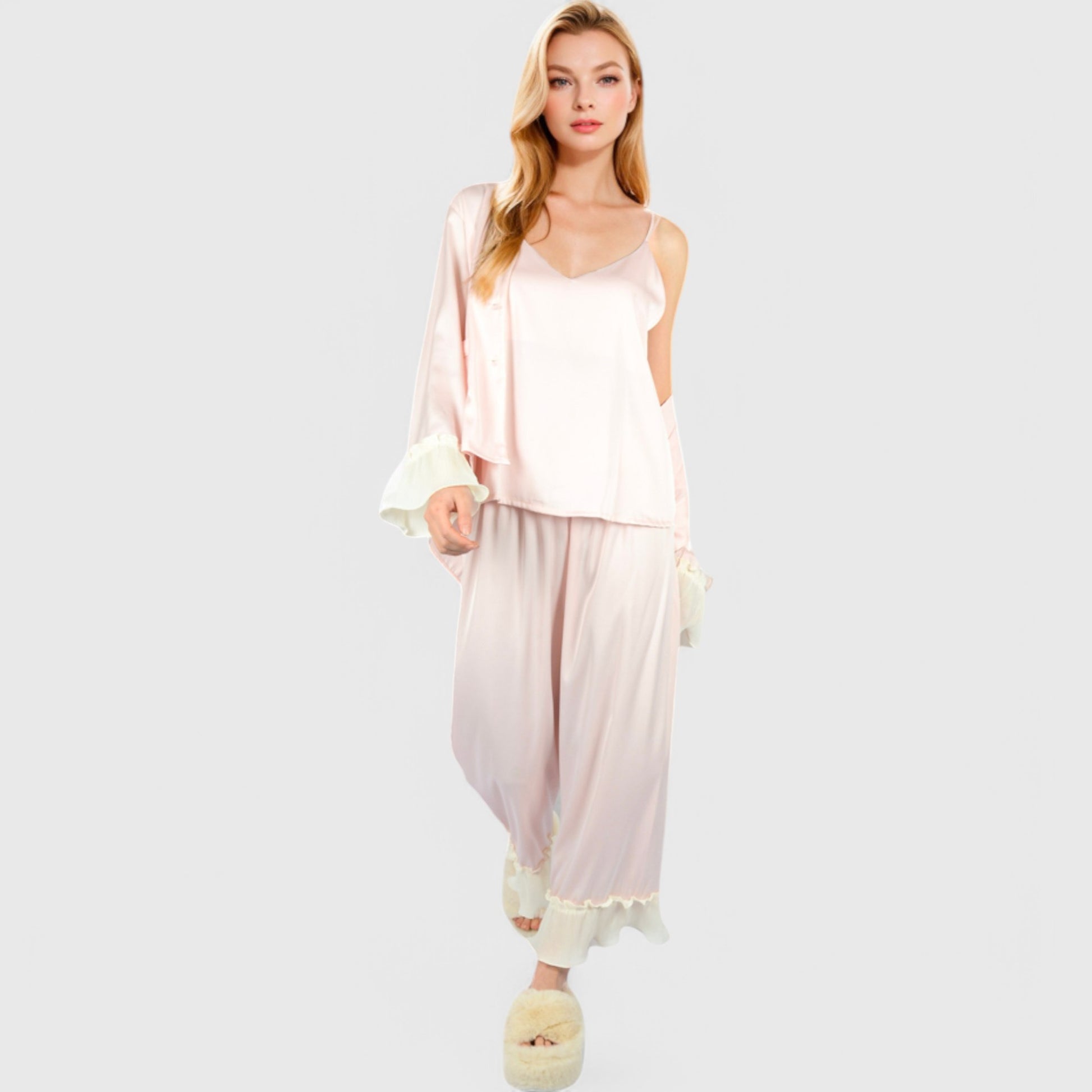 The Anna-Kaci Women's Satin Pajama Set blends elegance and comfort with its soft, silky fabric and feminine ruffle accents. Featuring a long-sleeve button-up top with delicate ruffled cuffs and a relaxed fit, this set brings a chic touch to loungewear. The matching wide-leg pants also showcase ruffled hems for a stylish and cozy feel. Designed with a breathable satin finish, this pajama set is perfect for sleeping, lounging, or indulging in a self-care day.
