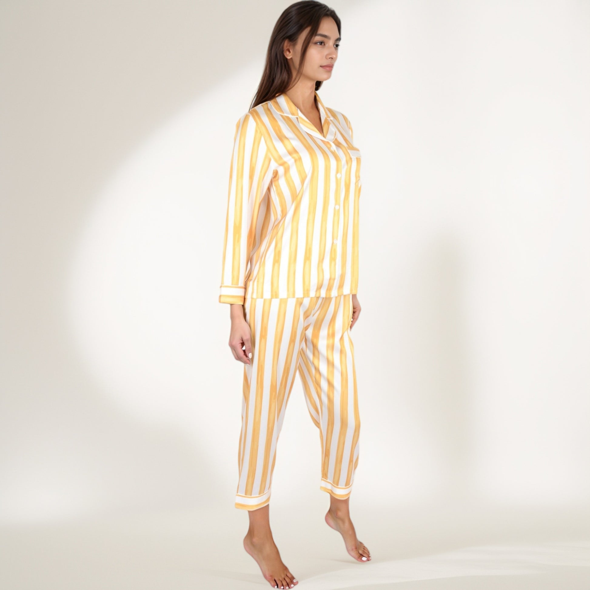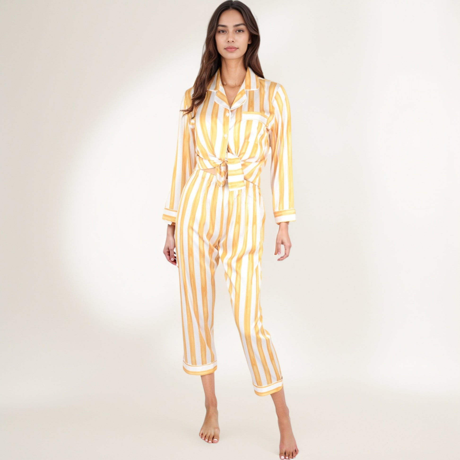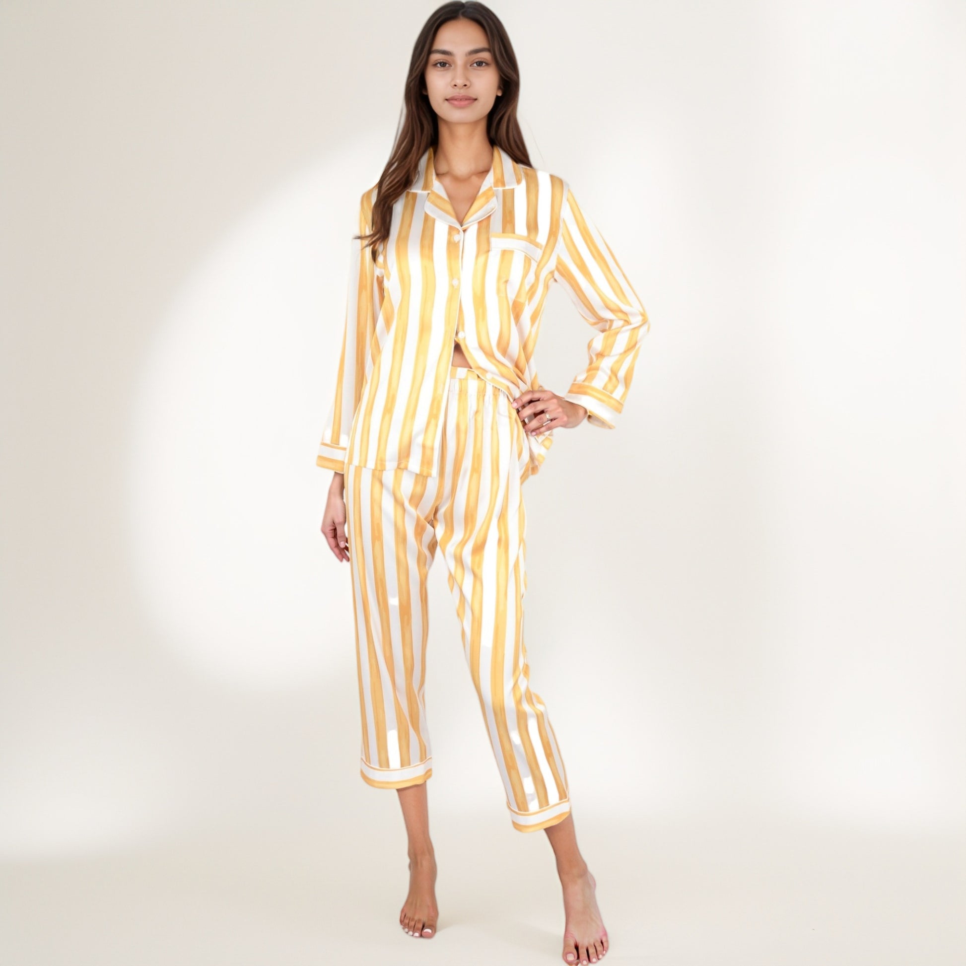 Anna-Kaci Lounge Women's Striped Satin Pajama Set with Long Sleeve Button Top and Cropped Pants