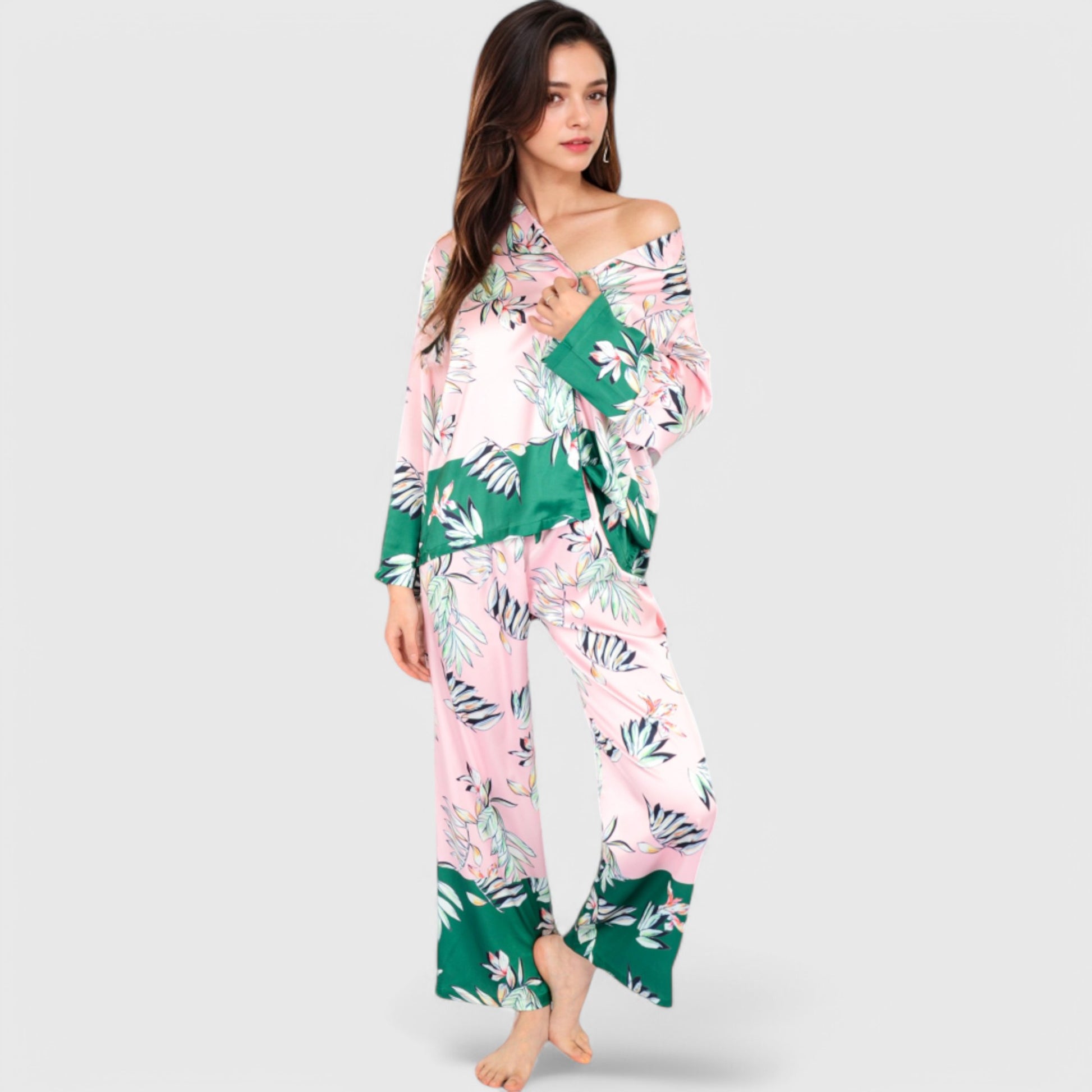Anna-Kaci Lounge Women's Floral Satin Pajama Set with Button-Up Long Sleeve Top and Matching Pants