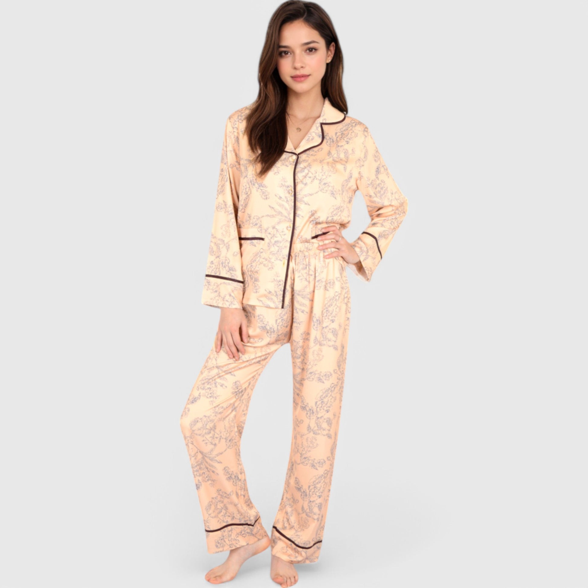 The Anna-Kaci Women's Satin Pajama Set exudes vintage luxury with its intricate baroque print and silky-smooth fabric. The long-sleeve button-up top features a classic notched collar, contrast piping, and chic front pockets, while the relaxed-fit pants offer an elastic waistband for ultimate comfort. Designed for elegance and ease, this pajama set is perfect for lounging at home or indulging in a restful night's sleep.