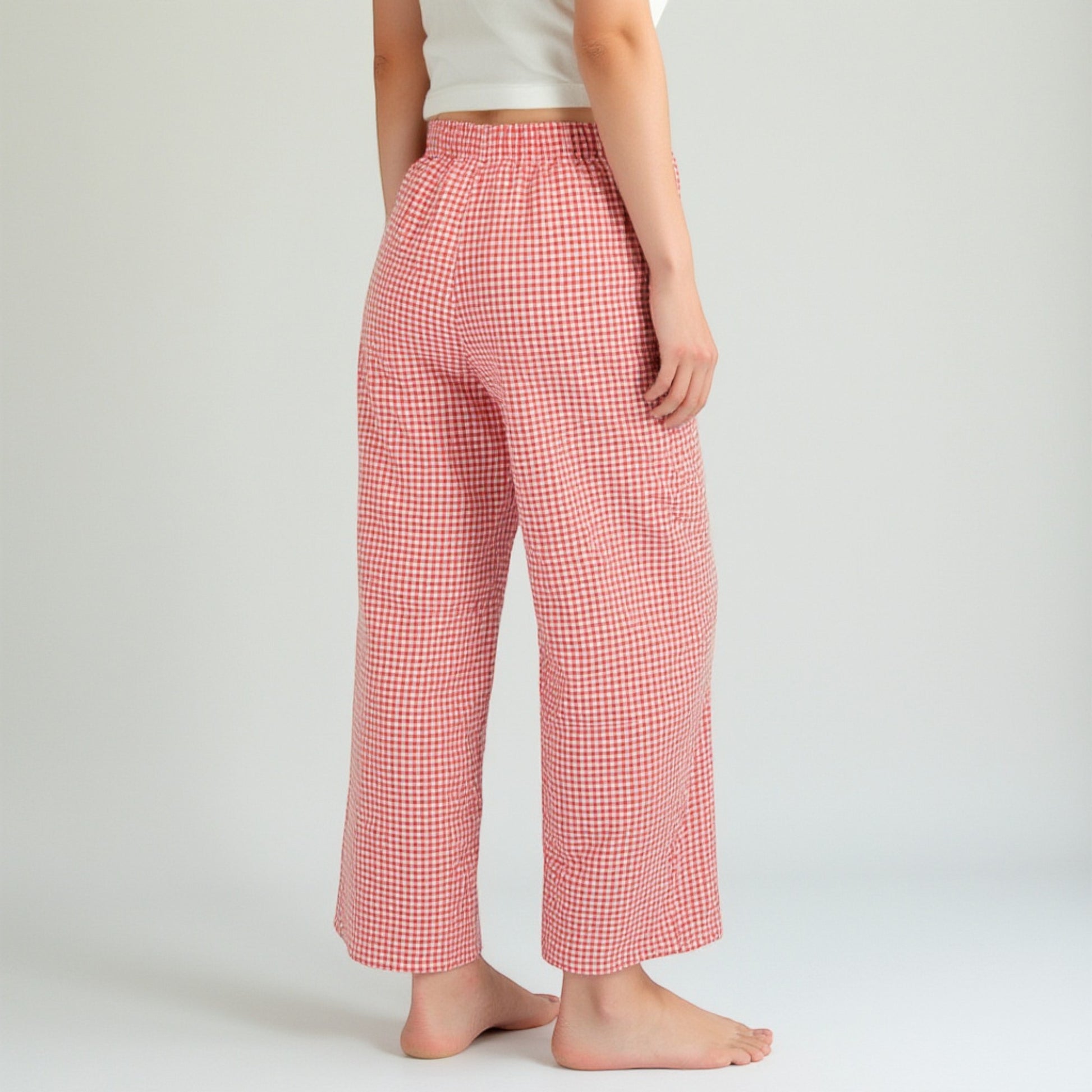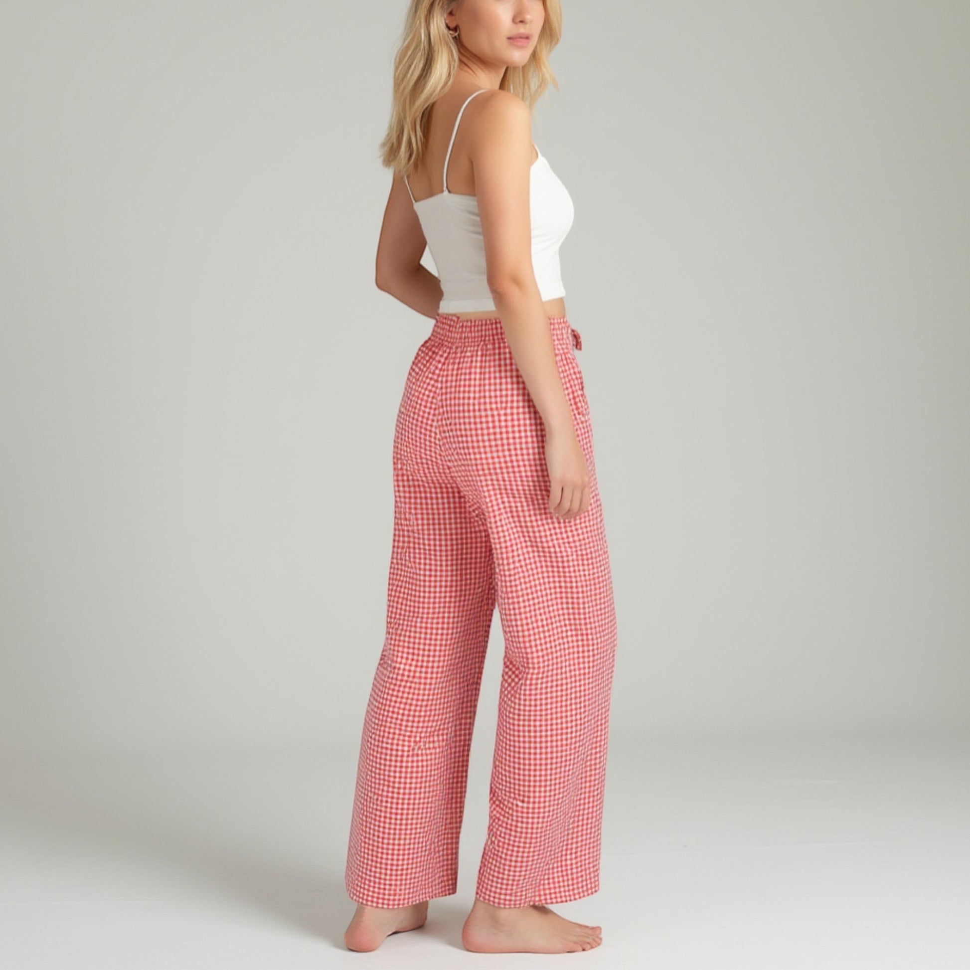 The Anna-Kaci Women's Gingham Print Pajama Pants bring cheerful charm and all-day comfort to your loungewear rotation. These pants feature a flattering high-rise elastic waistband with a functional drawstring for a customizable fit. The relaxed straight leg offers ease of movement, while the classic gingham pattern adds a timeless, playful touch. Perfect for pairing with your favorite cozy tops, these pajama pants are a must-have for relaxing in style.
