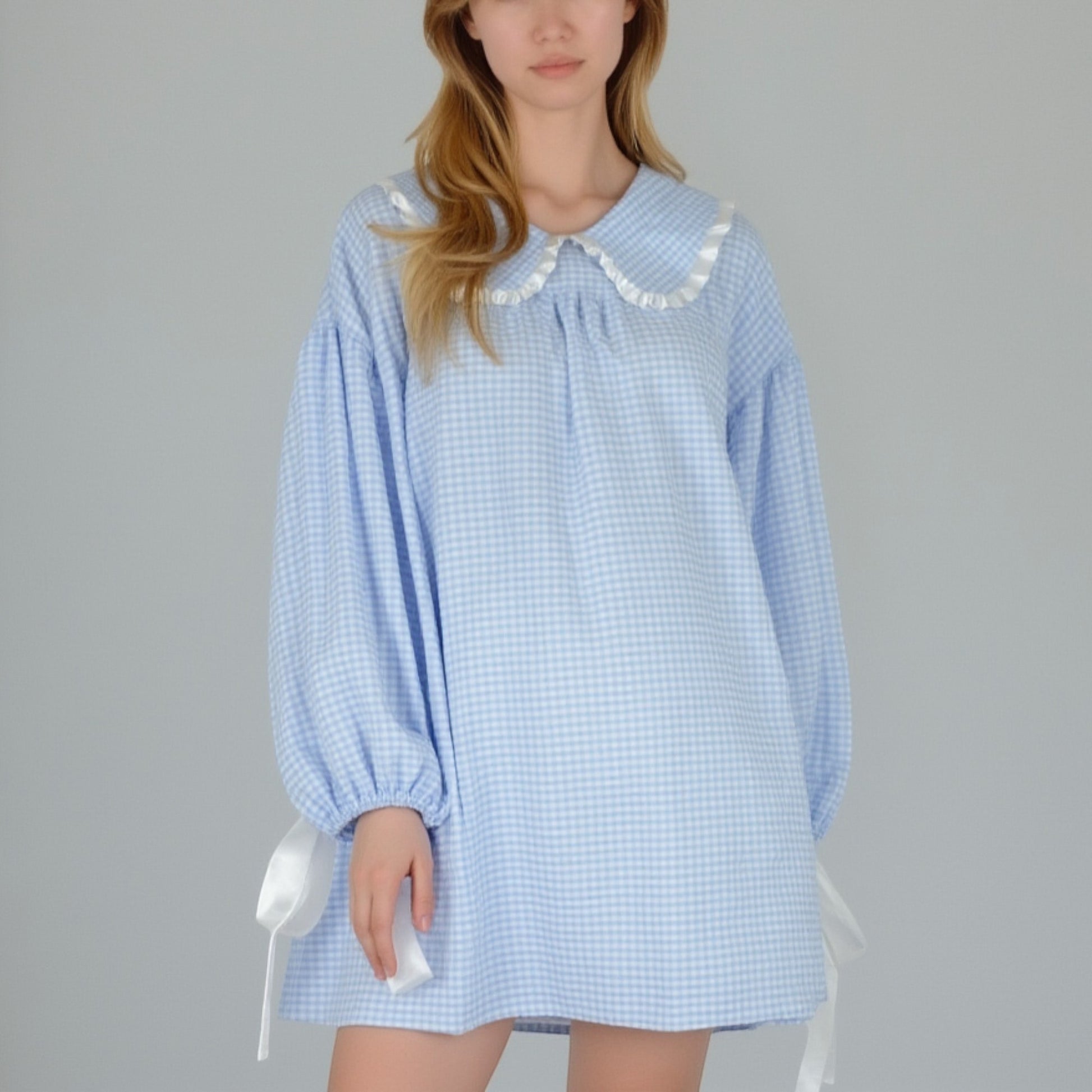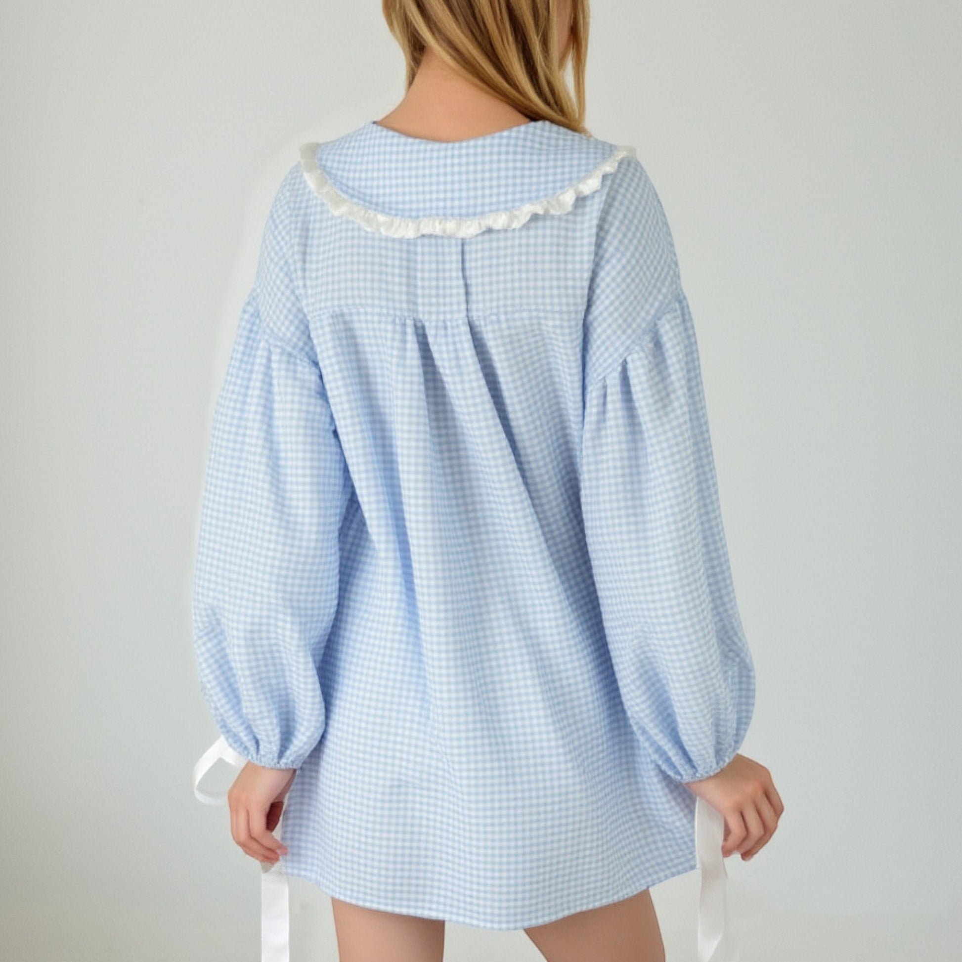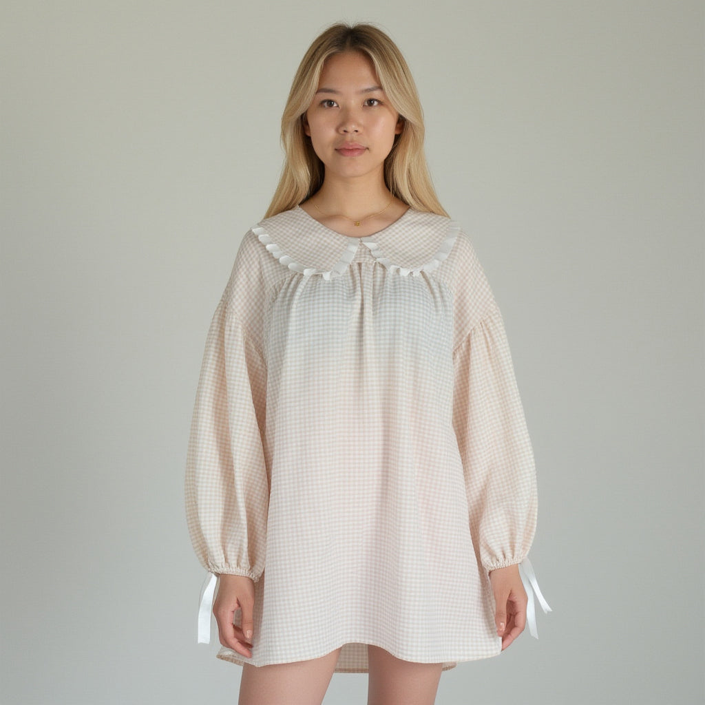 The Anna-Kaci Women's Gingham Long Sleeve Nightgown adds vintage charm to your loungewear wardrobe. Designed with a sweet Peter Pan collar and delicate ribbon trim, this nightgown features an airy silhouette and soft fabric for all-night comfort. The relaxed fit and voluminous long sleeves enhance its cozy, nostalgic appeal. Perfect for lounging, this timeless piece brings a graceful, feminine touch to bedtime routines.