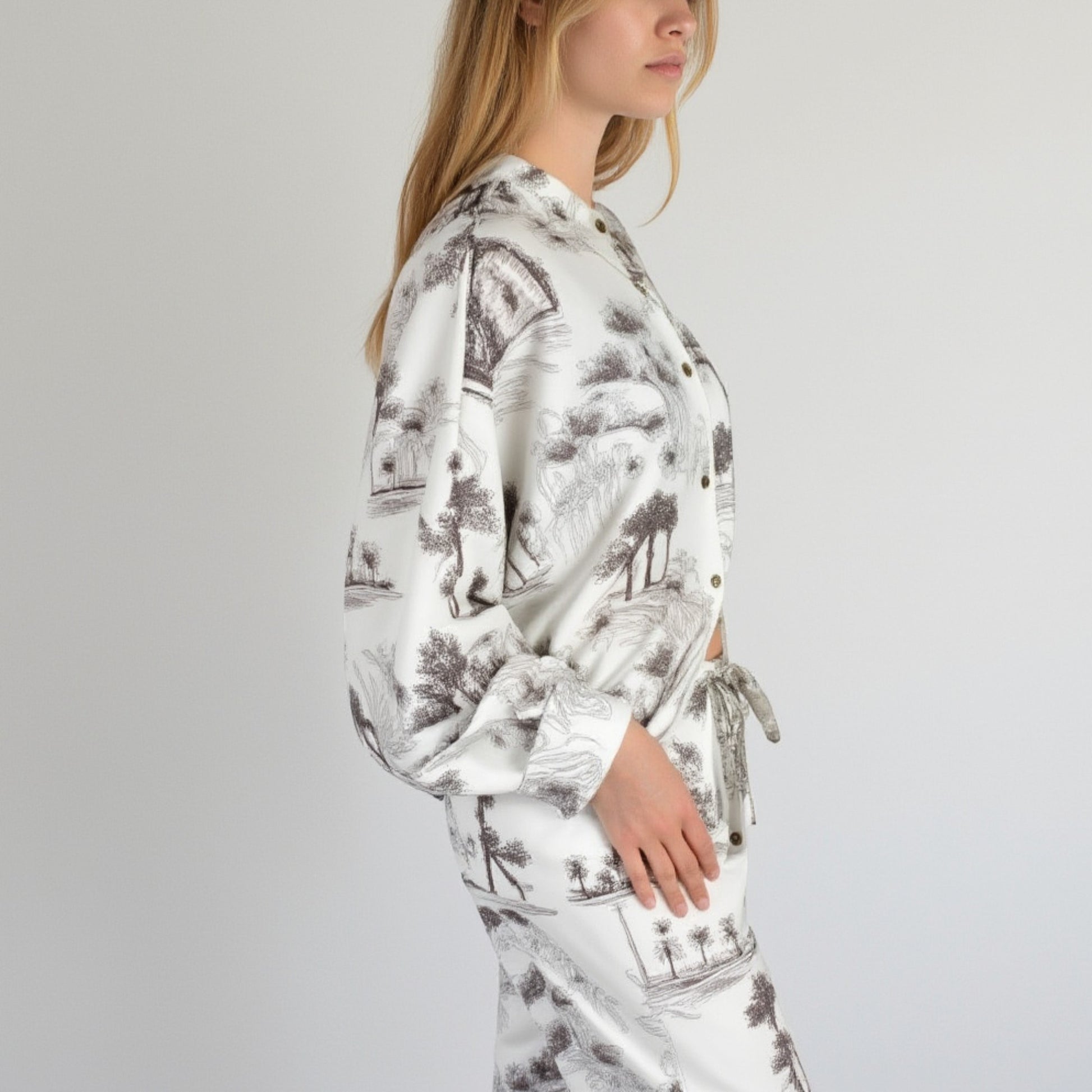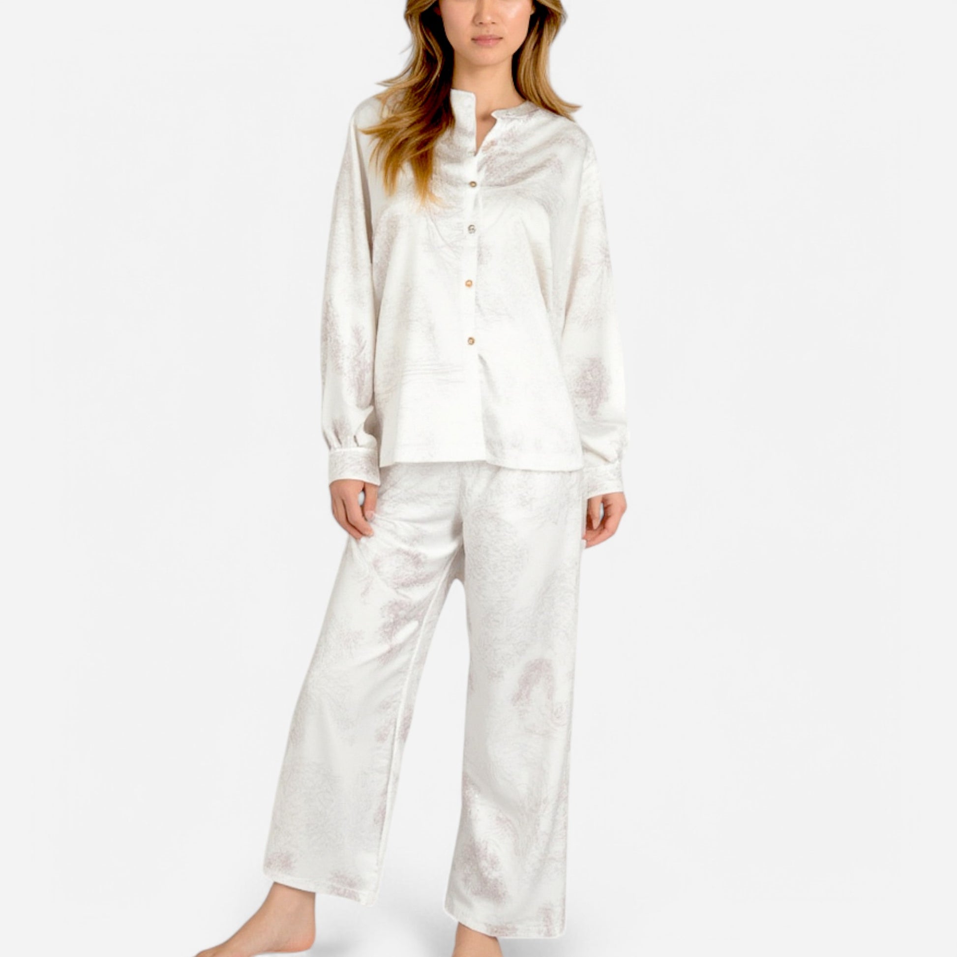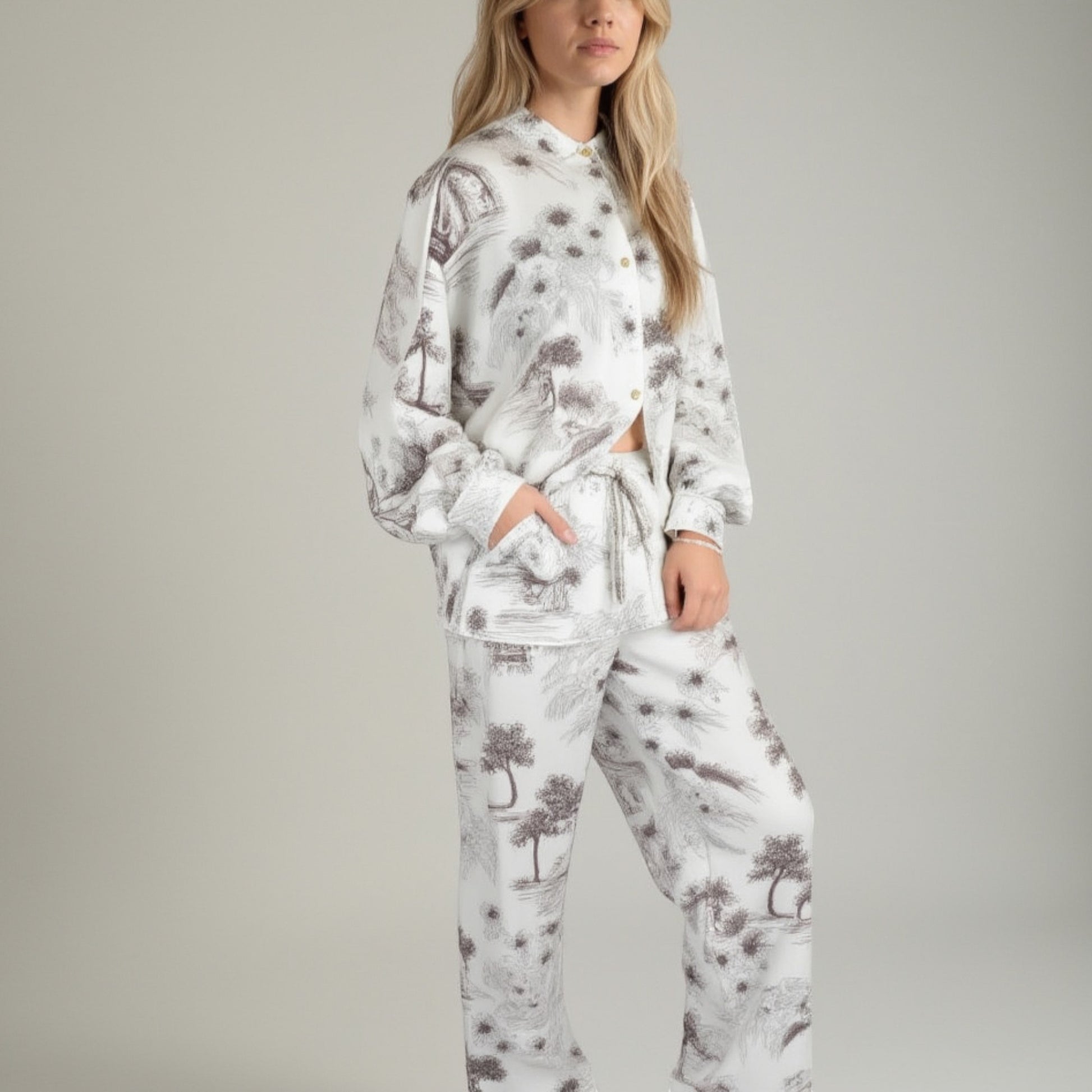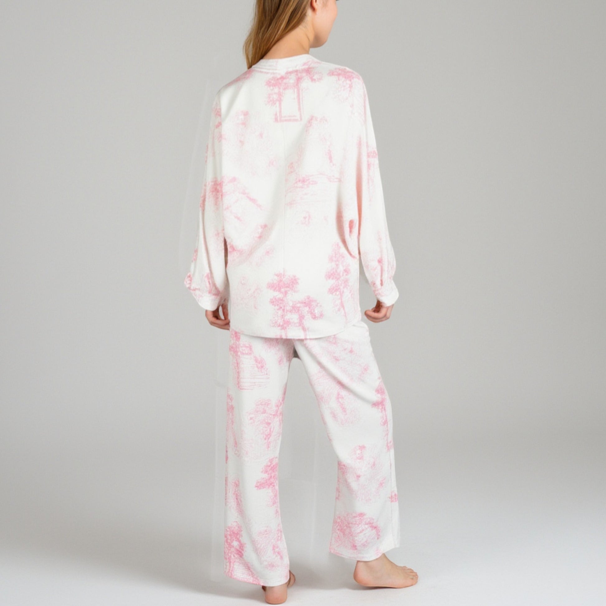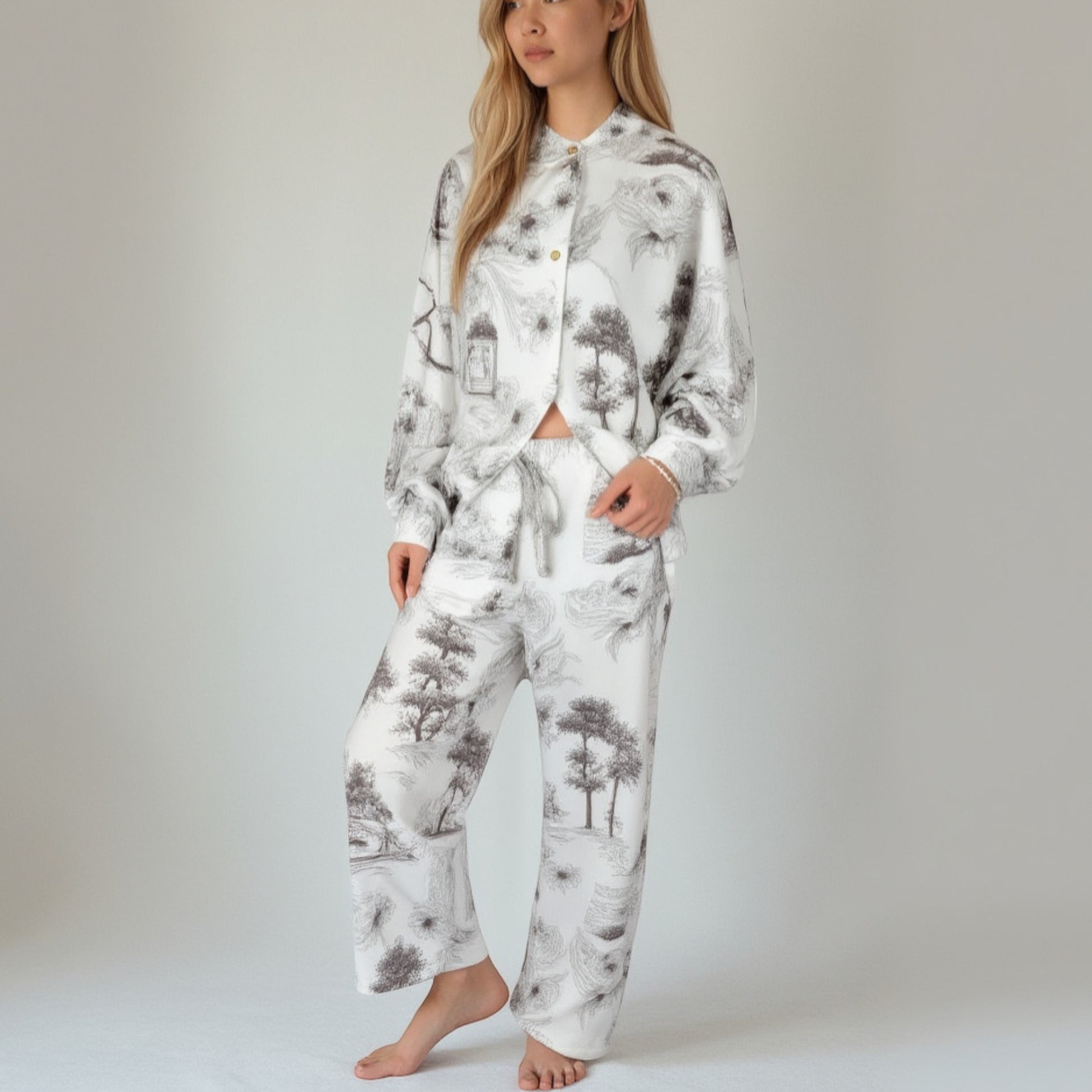 Anna-Kaci Lounge Women's Toile Print Button Up Pajama Set with Long Sleeve Top and Elastic Waist Drawstring Pants