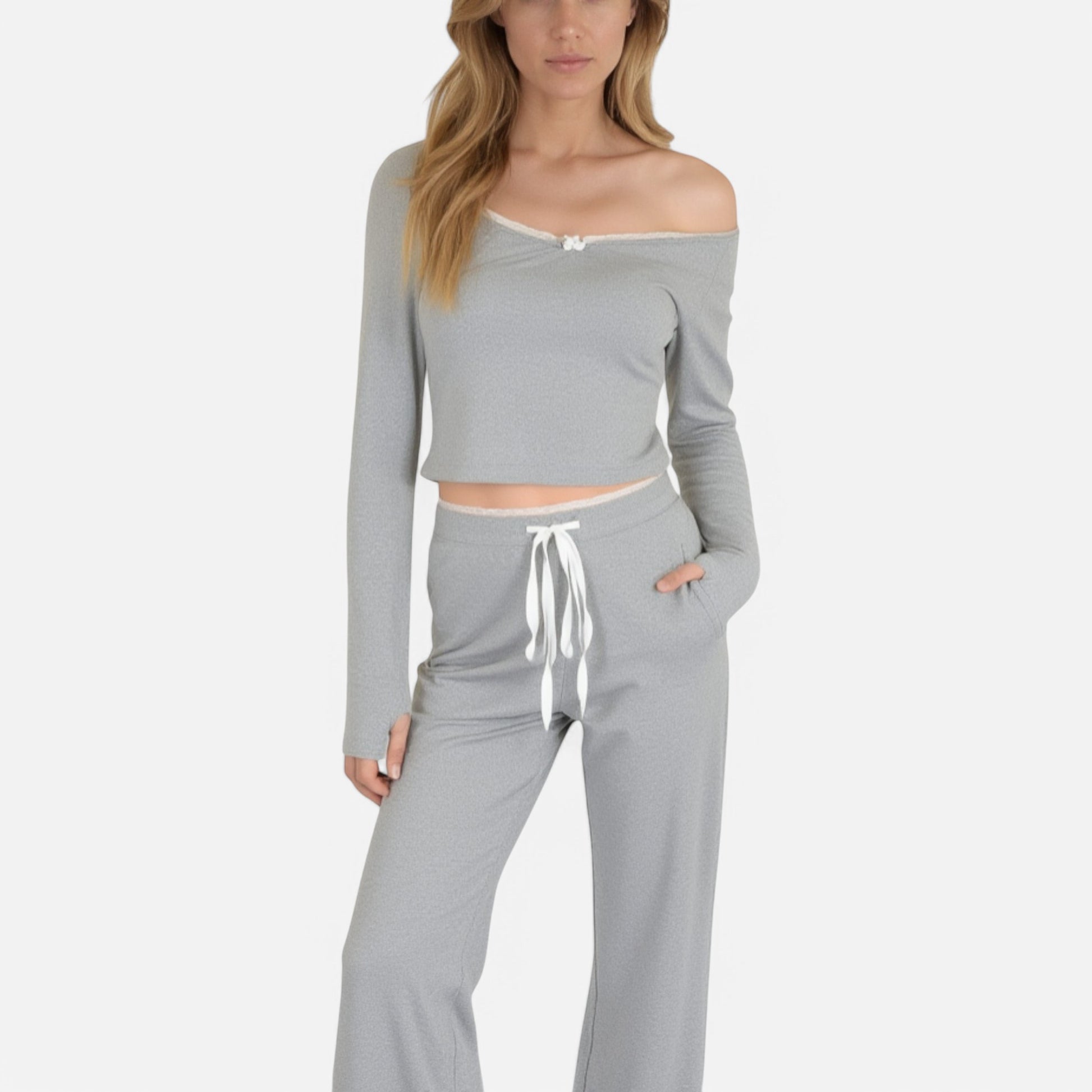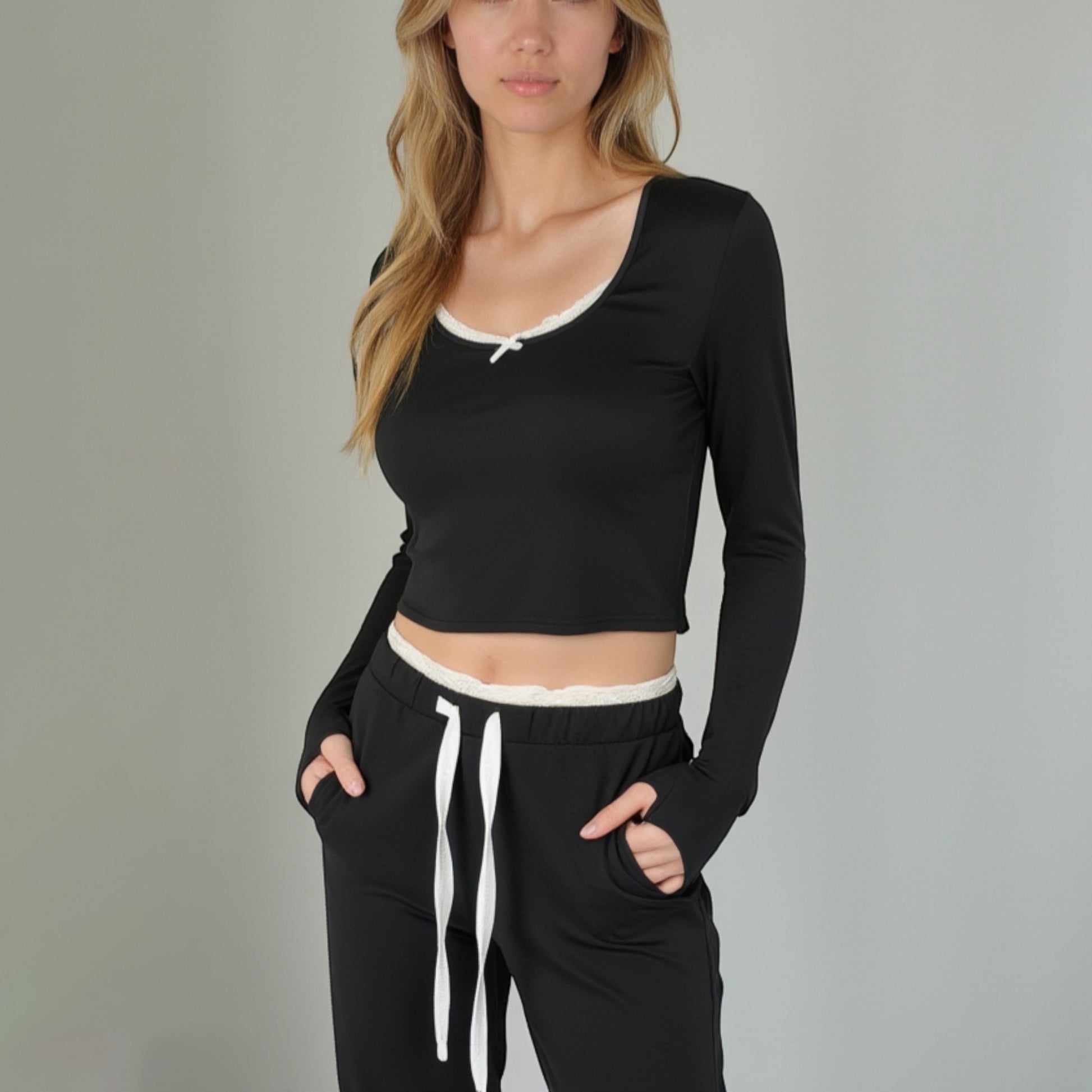 The Anna-Kaci Women's Lace Trim Lounge Set combines style and comfort in one easygoing outfit. Featuring a cropped long sleeve top with delicate lace trim and a dainty bow, it adds a feminine touch to your loungewear rotation. The matching jogger pants include an adjustable drawstring and elastic waistband for a customized, secure fit. Whether relaxing at home or winding down for the night, this set brings effortless comfort and charm.