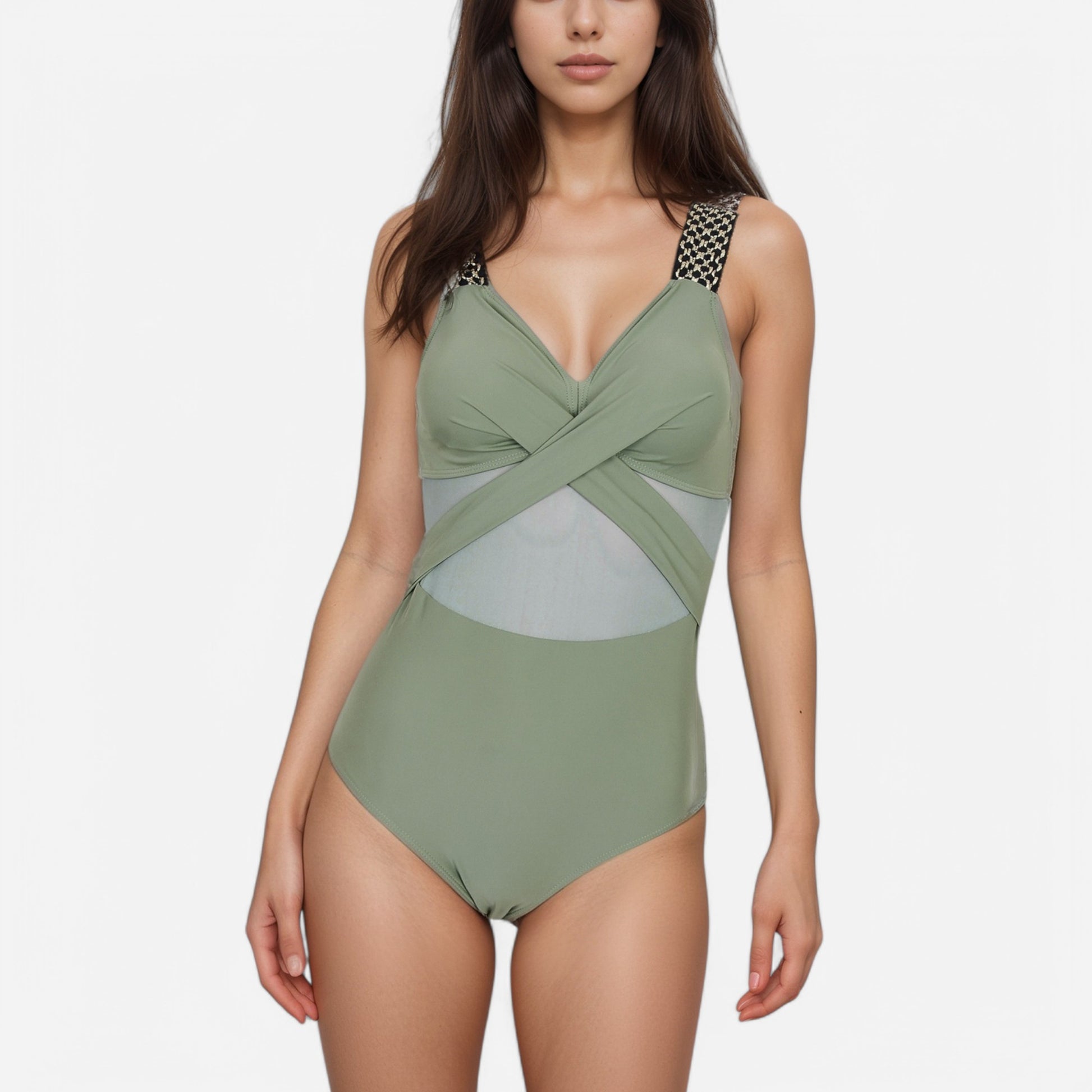 The Anna-Kaci Women's One Piece Swimsuit features a flattering crisscross front and a mesh midsection that creates a chic and slimming silhouette. The wide, braided detail straps add a touch of uniqueness while providing secure support. Designed for both style and function, this suit enhances your figure with a confident, contemporary feel. Perfect for lounging poolside or enjoying a day at the beach.