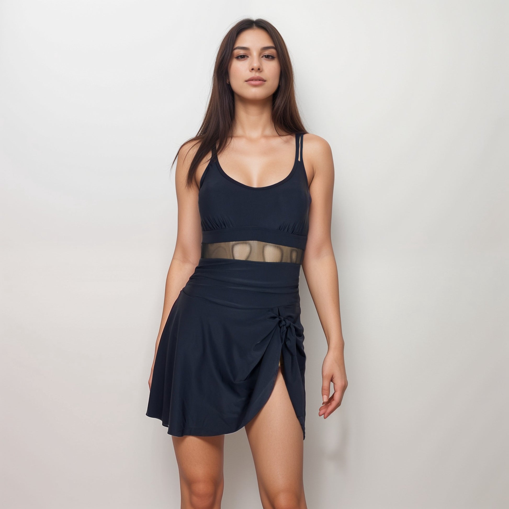 The Anna-Kaci Women's Mesh Panel One Piece Swimsuit with Swim Skirt blends flattering lines and functional style. This design features double spaghetti straps and a sheer mesh midsection for a touch of bold contrast. The skirt overlay includes a side tie for customizable coverage, adding a chic layer that flows beautifully. It's the perfect balance of feminine flair and modern swimwear confidence.